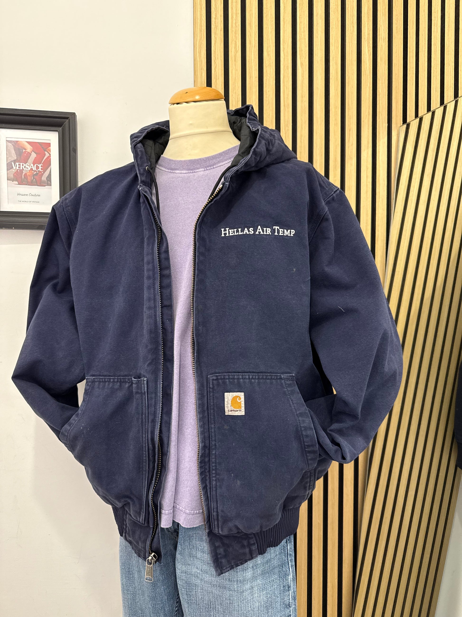 Autentica Active Jacket Carhartt vintage in colore blu navy con ricamo originale HELLAS AIR TEMP. Un pezzo iconico della linea workwear americana, perfetto per chi cerca funzionalità e stile.