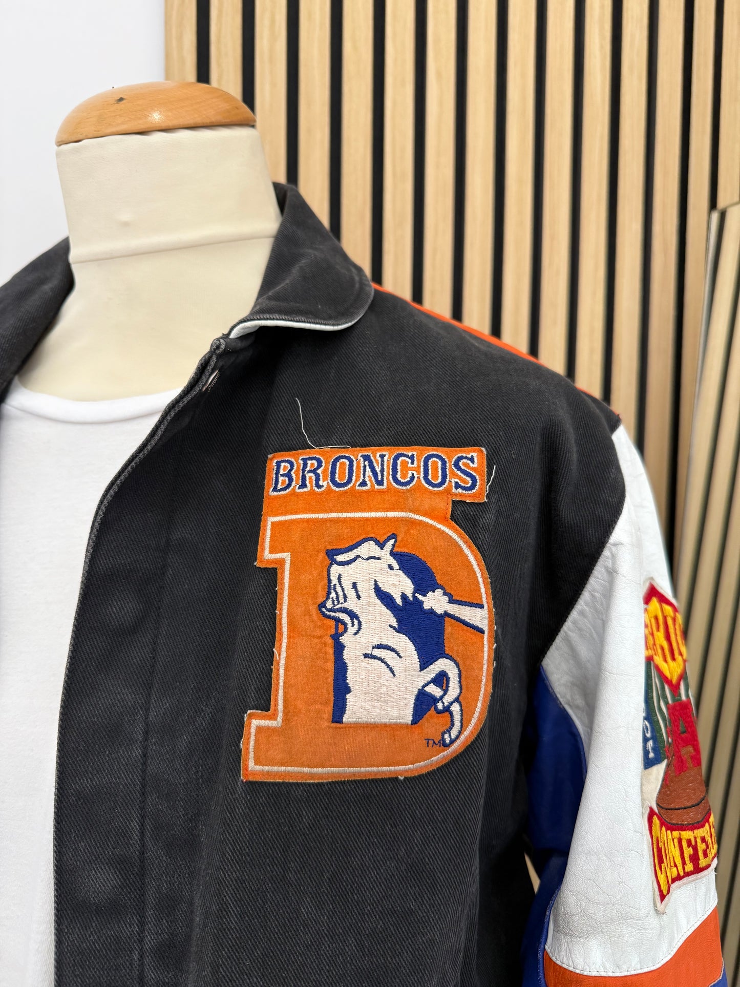 Giacca varsity vintage Denver Broncos firmata Starter, simbolo autentico dello stile sportivo anni ’90.