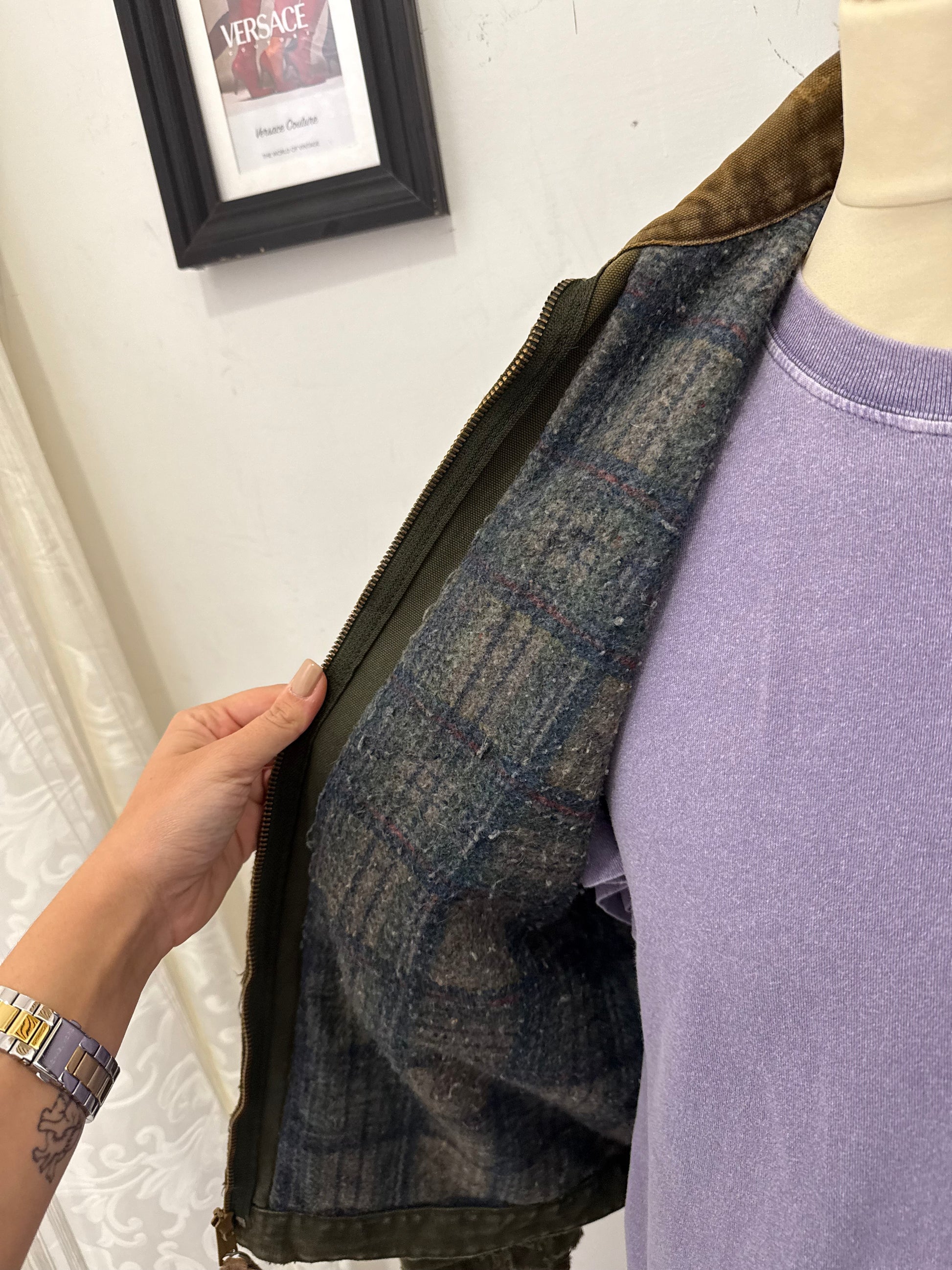 - Evidente usura e distressing sul fondo maniche e orlo.