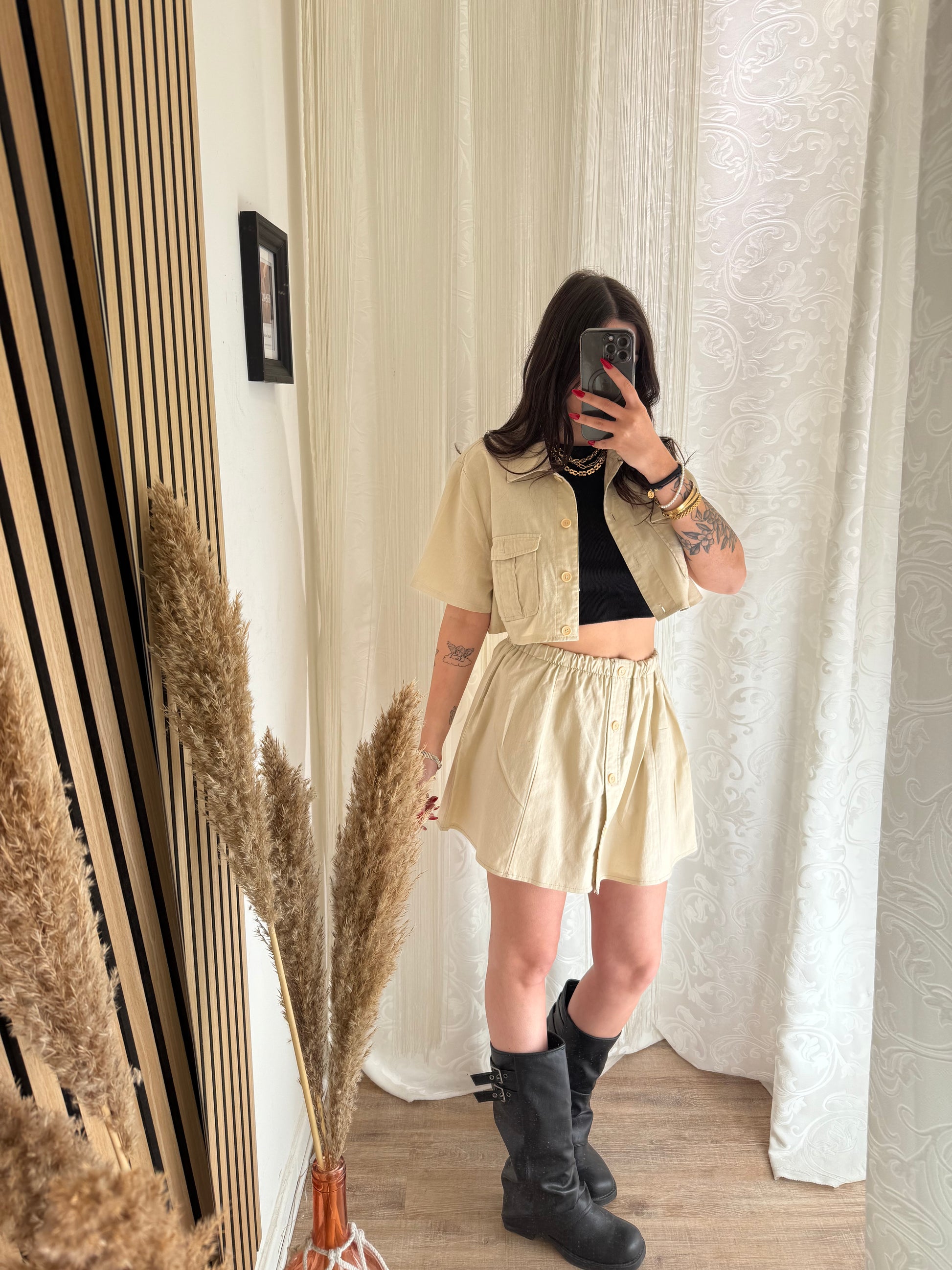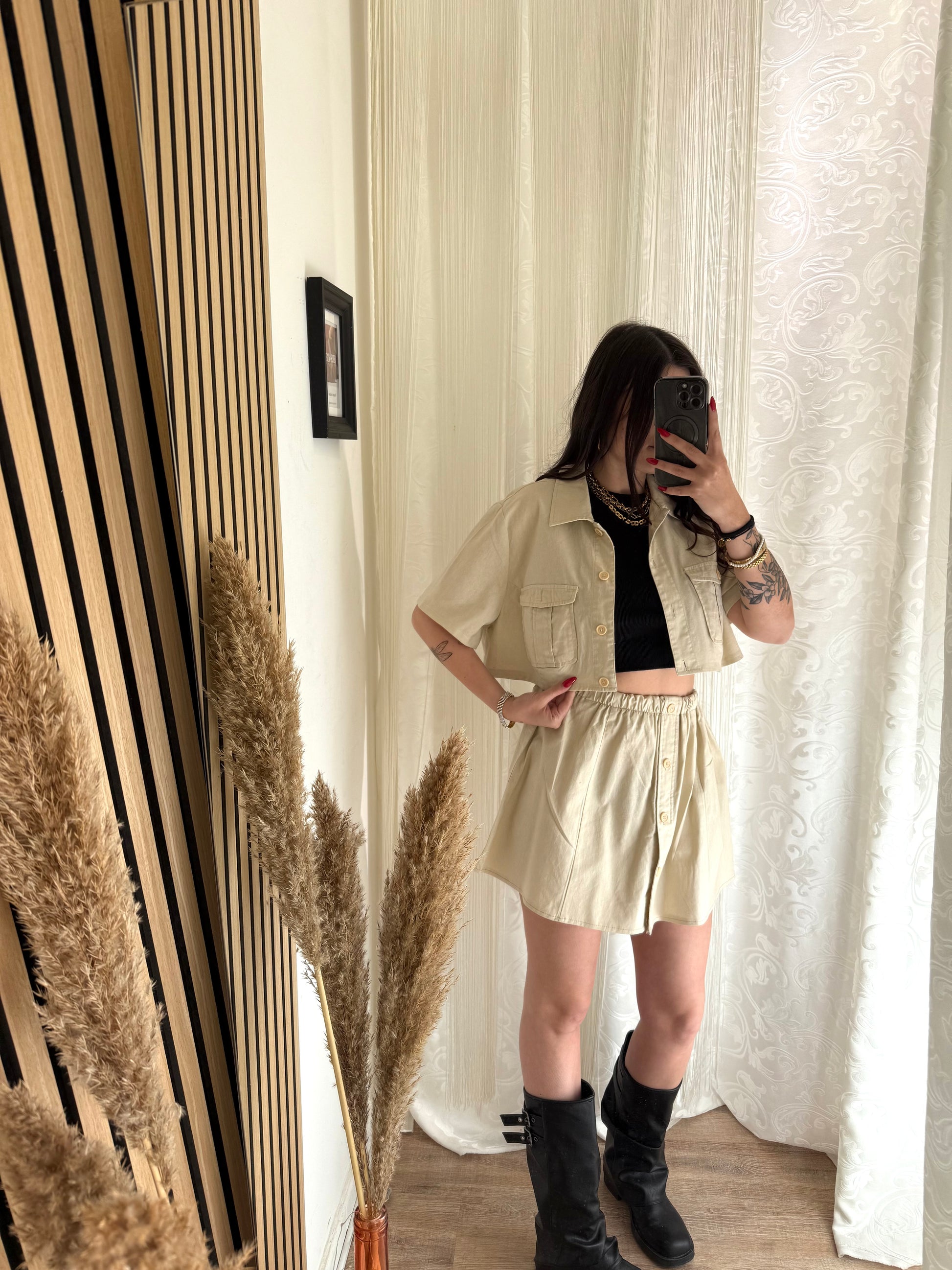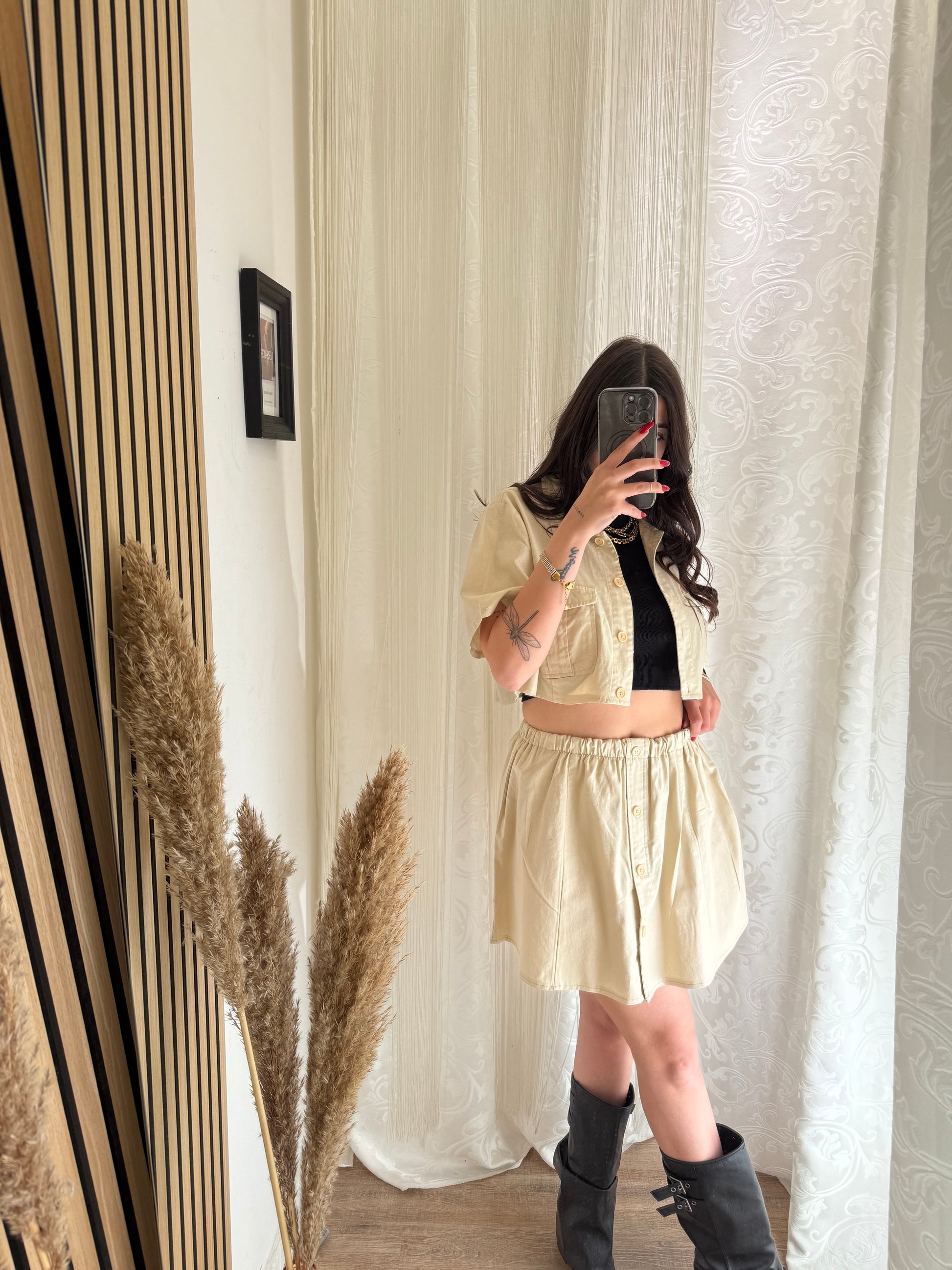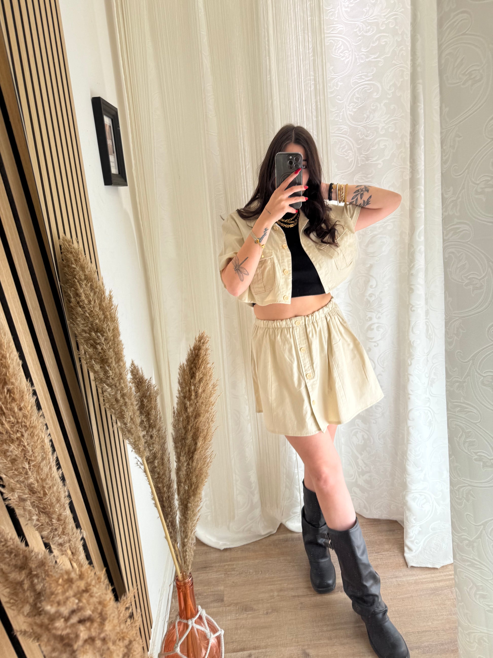 Completo realizzato da noi a mano, partendo dalla base di un vestito lungo. Il completo è composto da camicia cripeto con taschine davanti E gonna con elastico in vita e bottoni frontali.