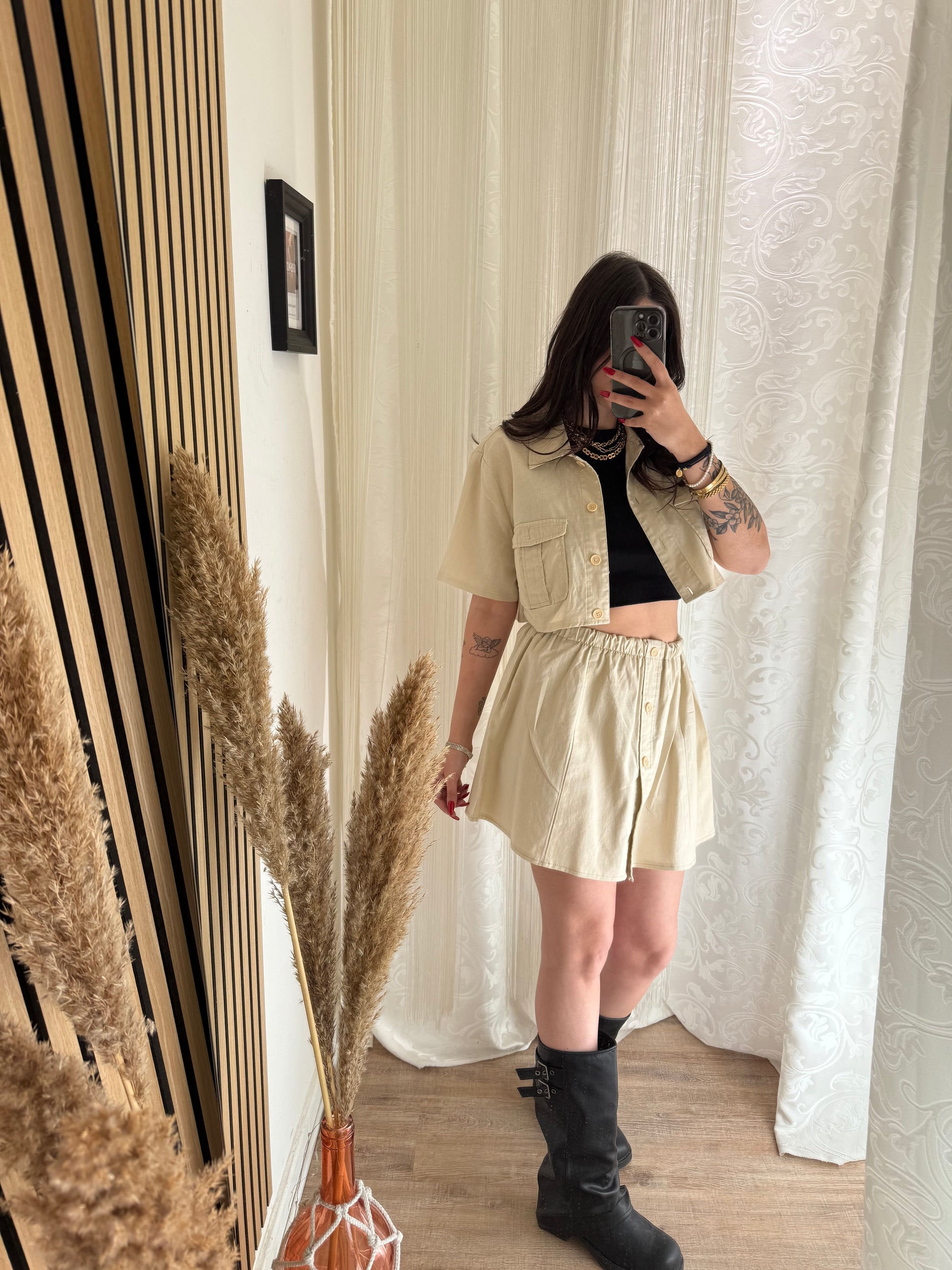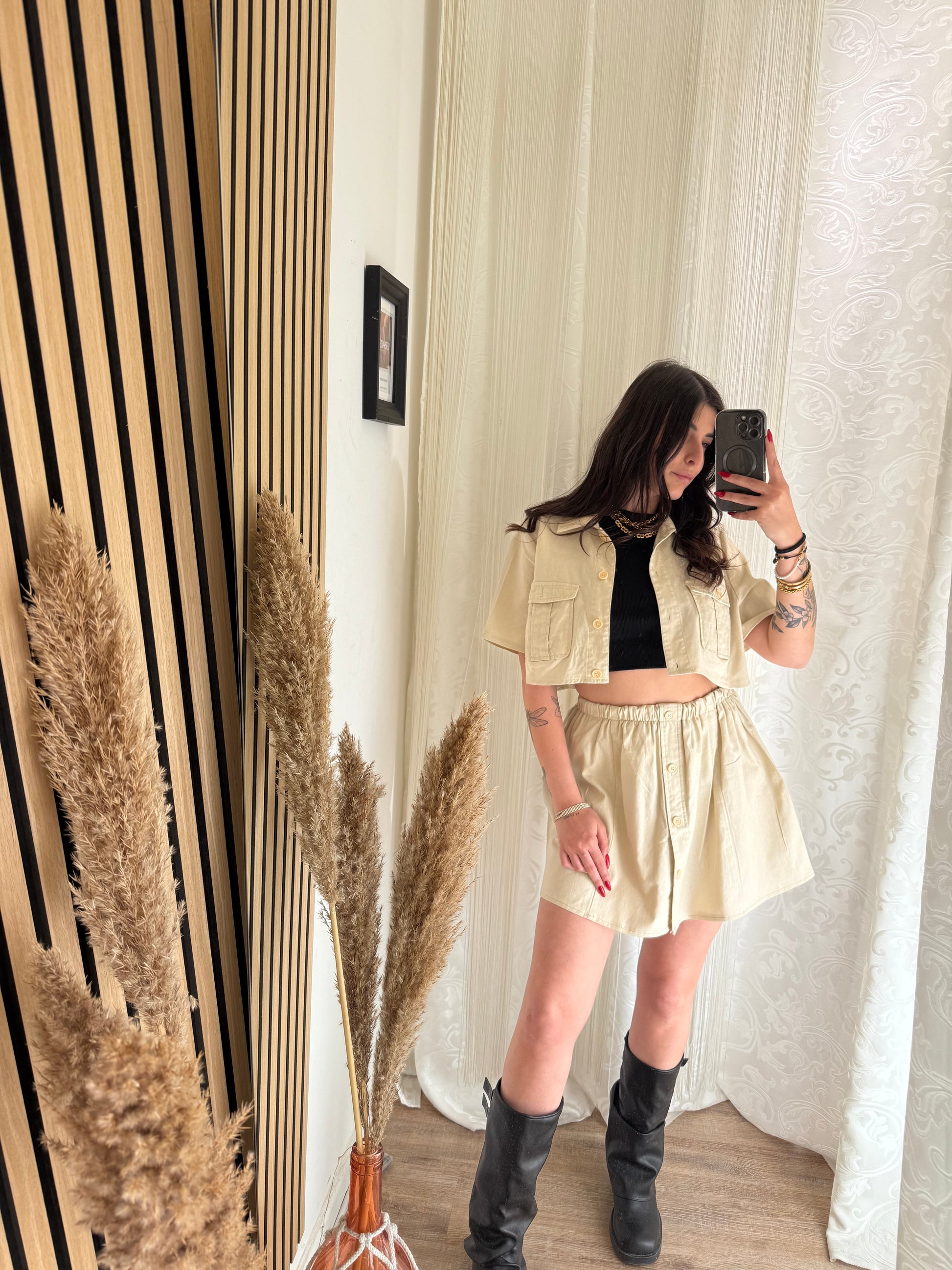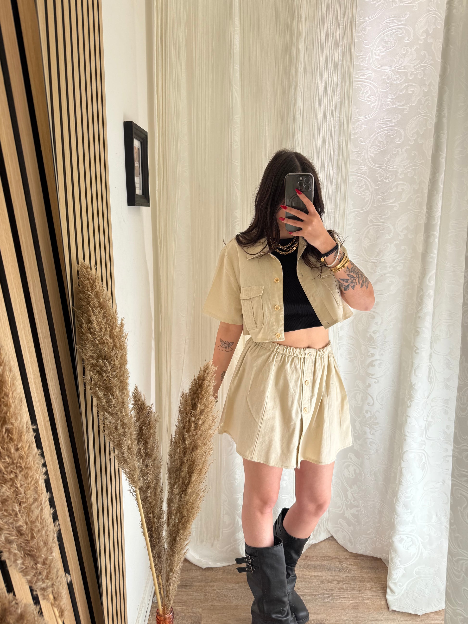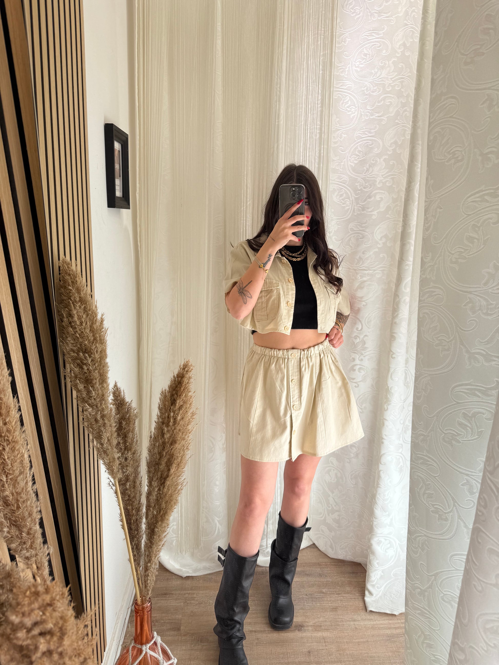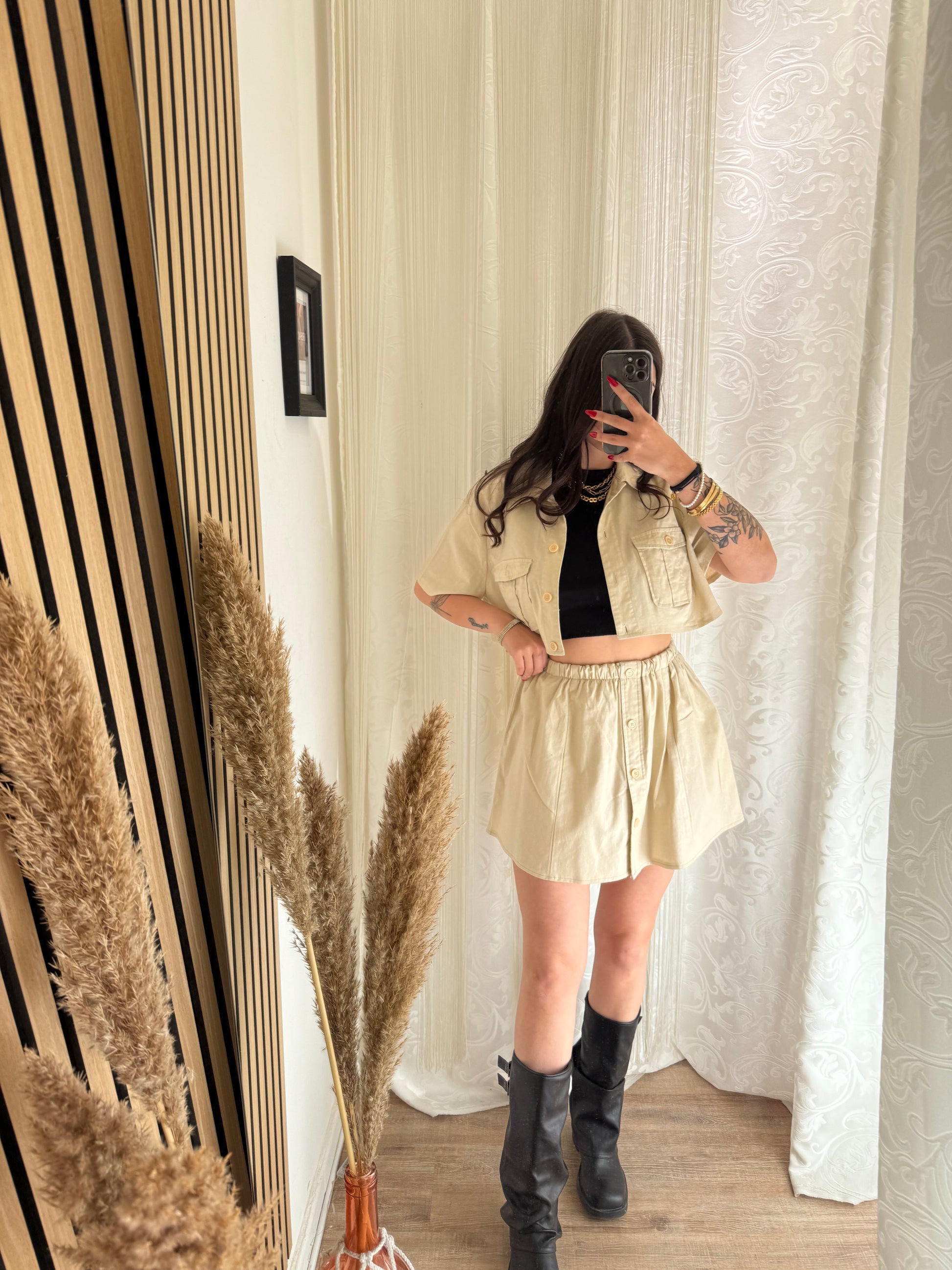 Completo realizzato da noi a mano, partendo dalla base di un vestito lungo. Il completo è composto da camicia cripeto con taschine davanti E gonna con elastico in vita e bottoni frontali.