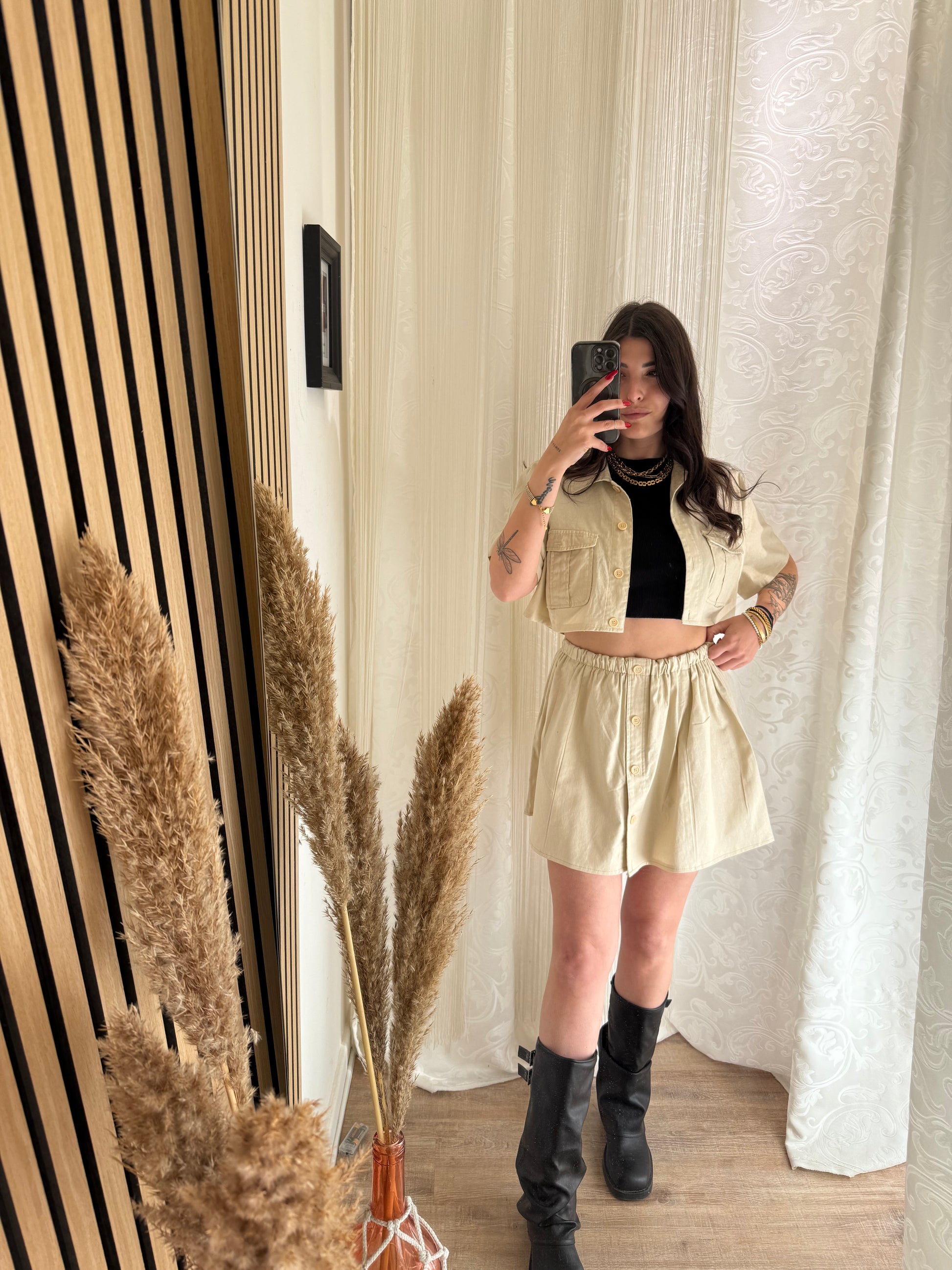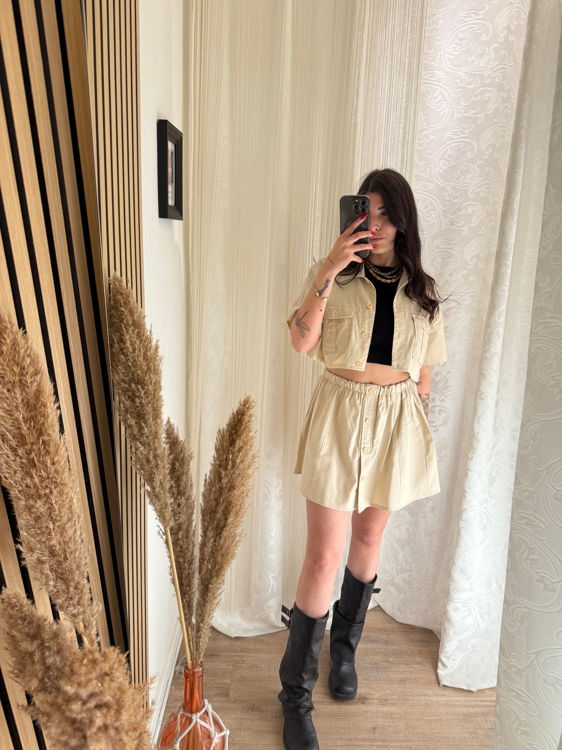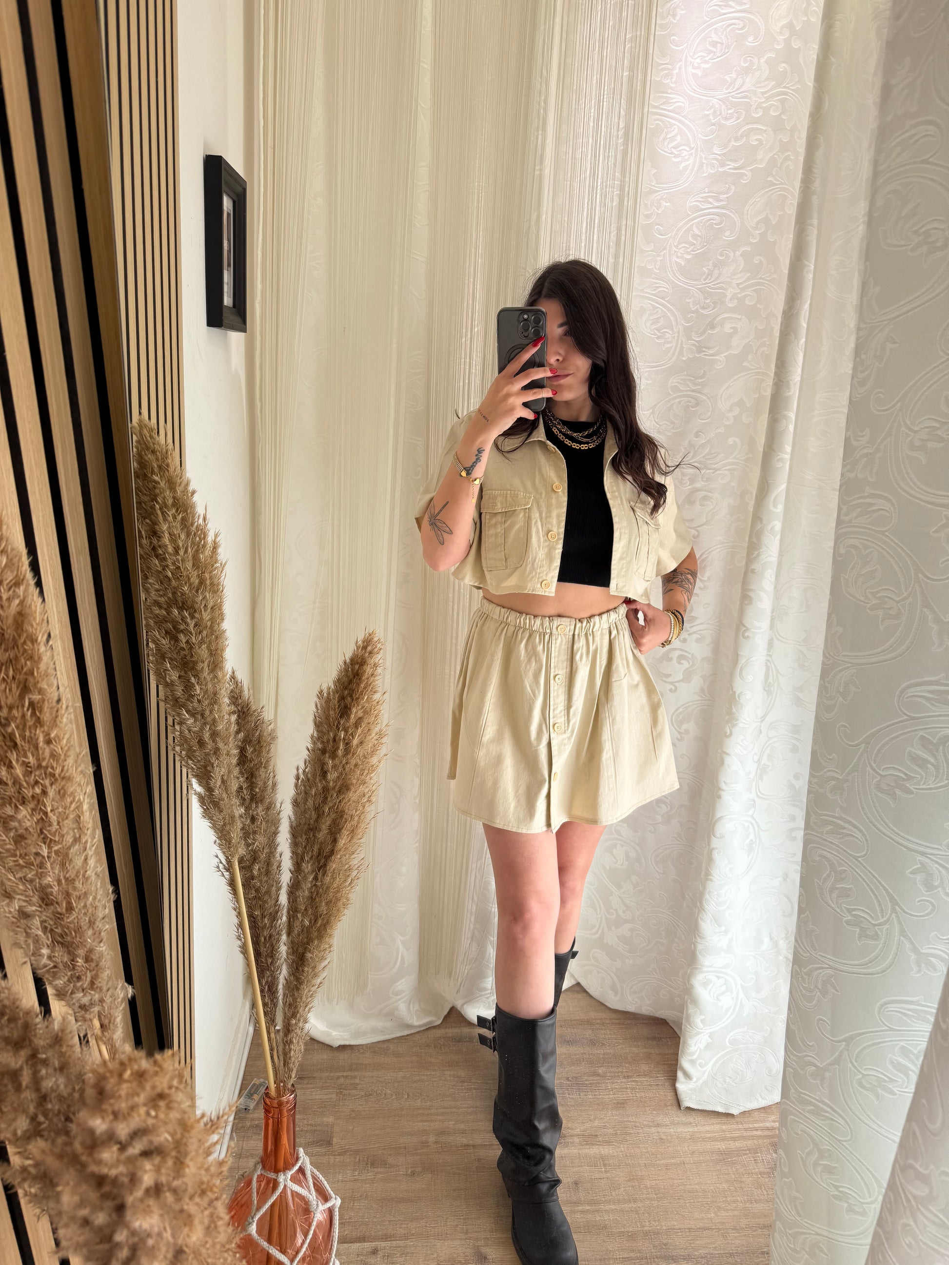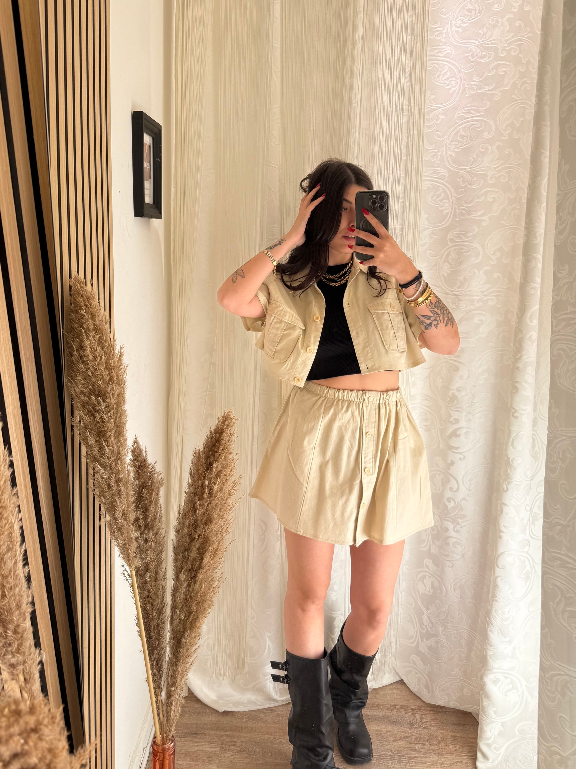 Completo realizzato da noi a mano, partendo dalla base di un vestito lungo. Il completo è composto da camicia cripeto con taschine davanti E gonna con elastico in vita e bottoni frontali.