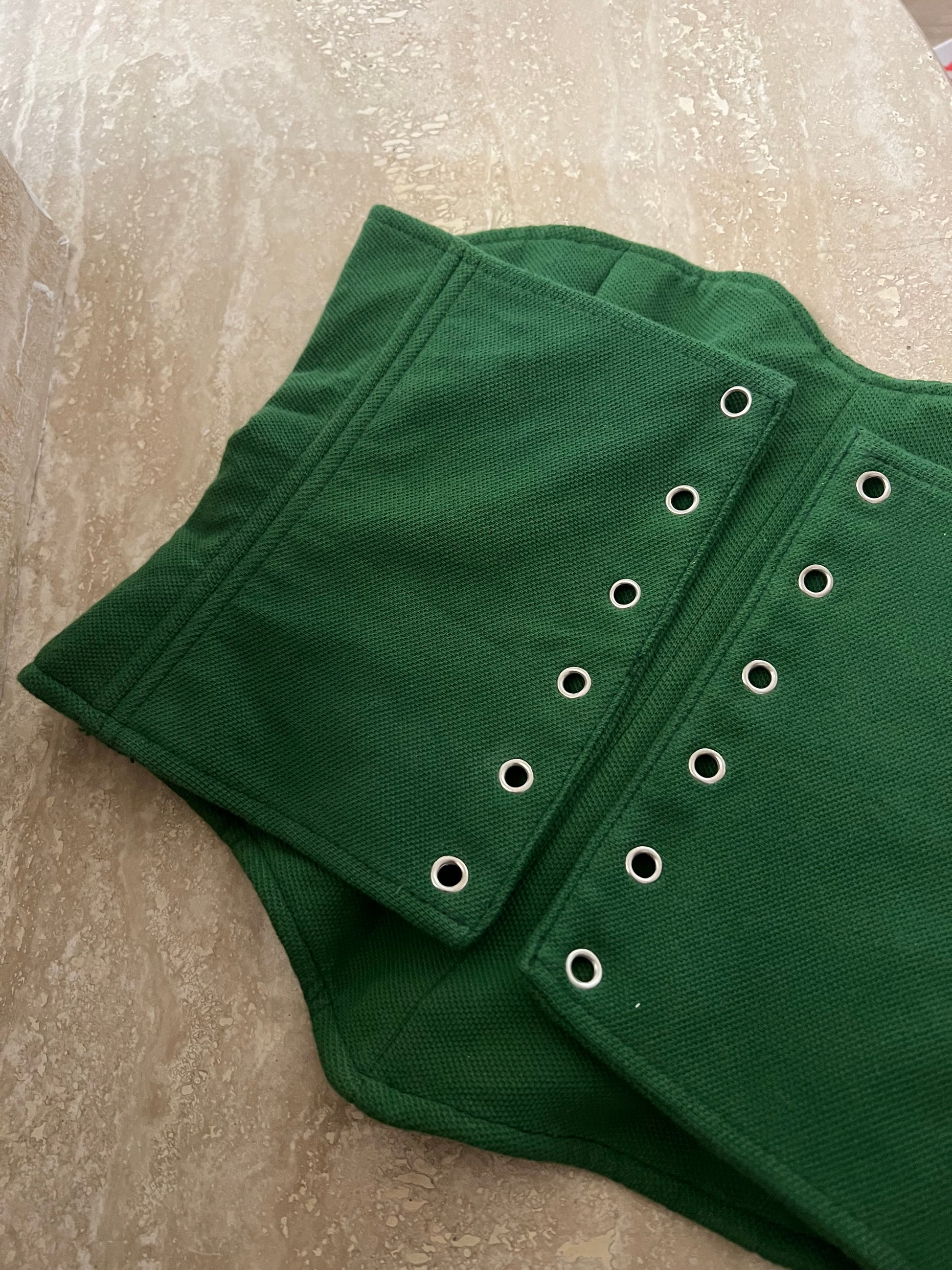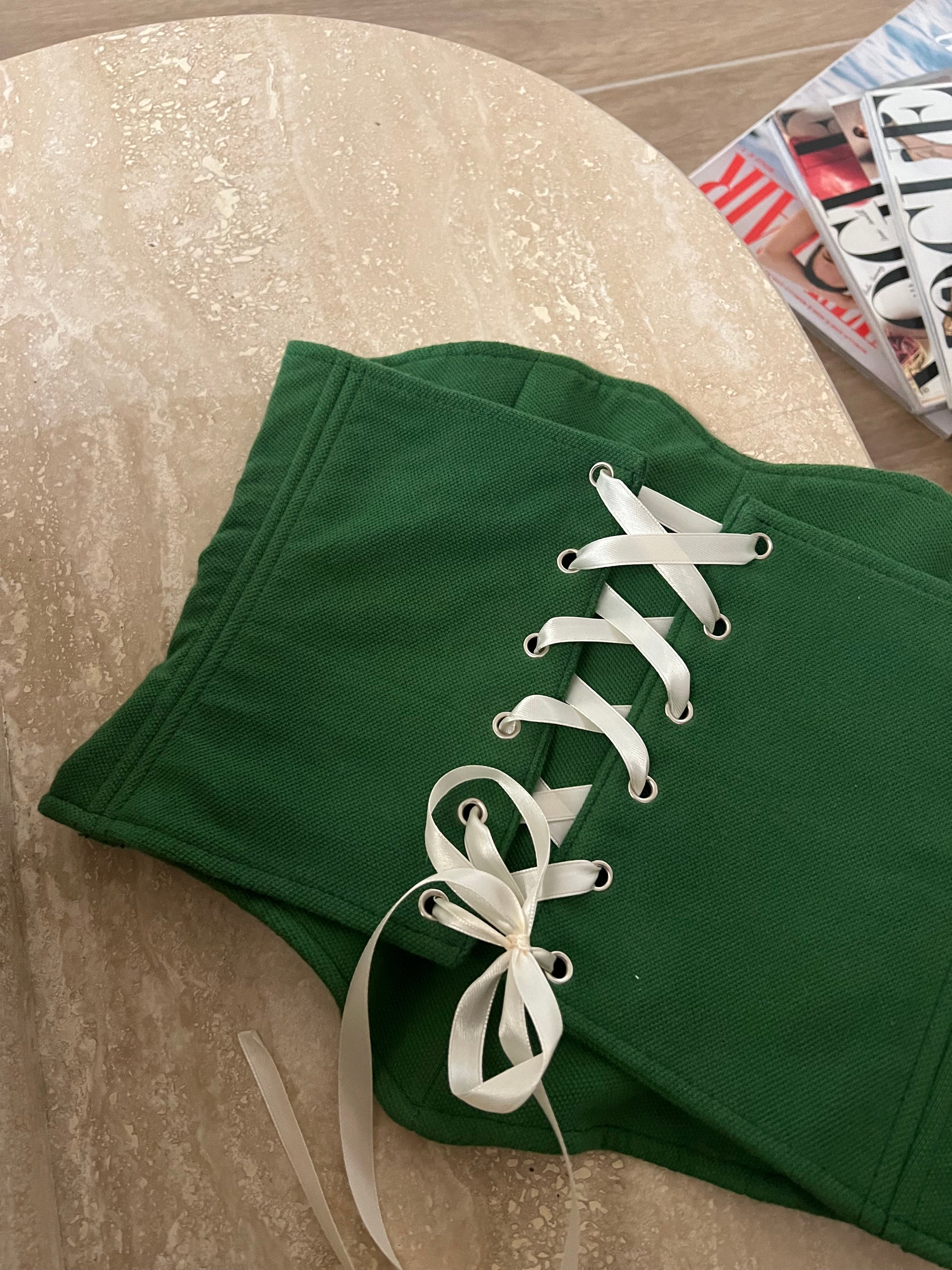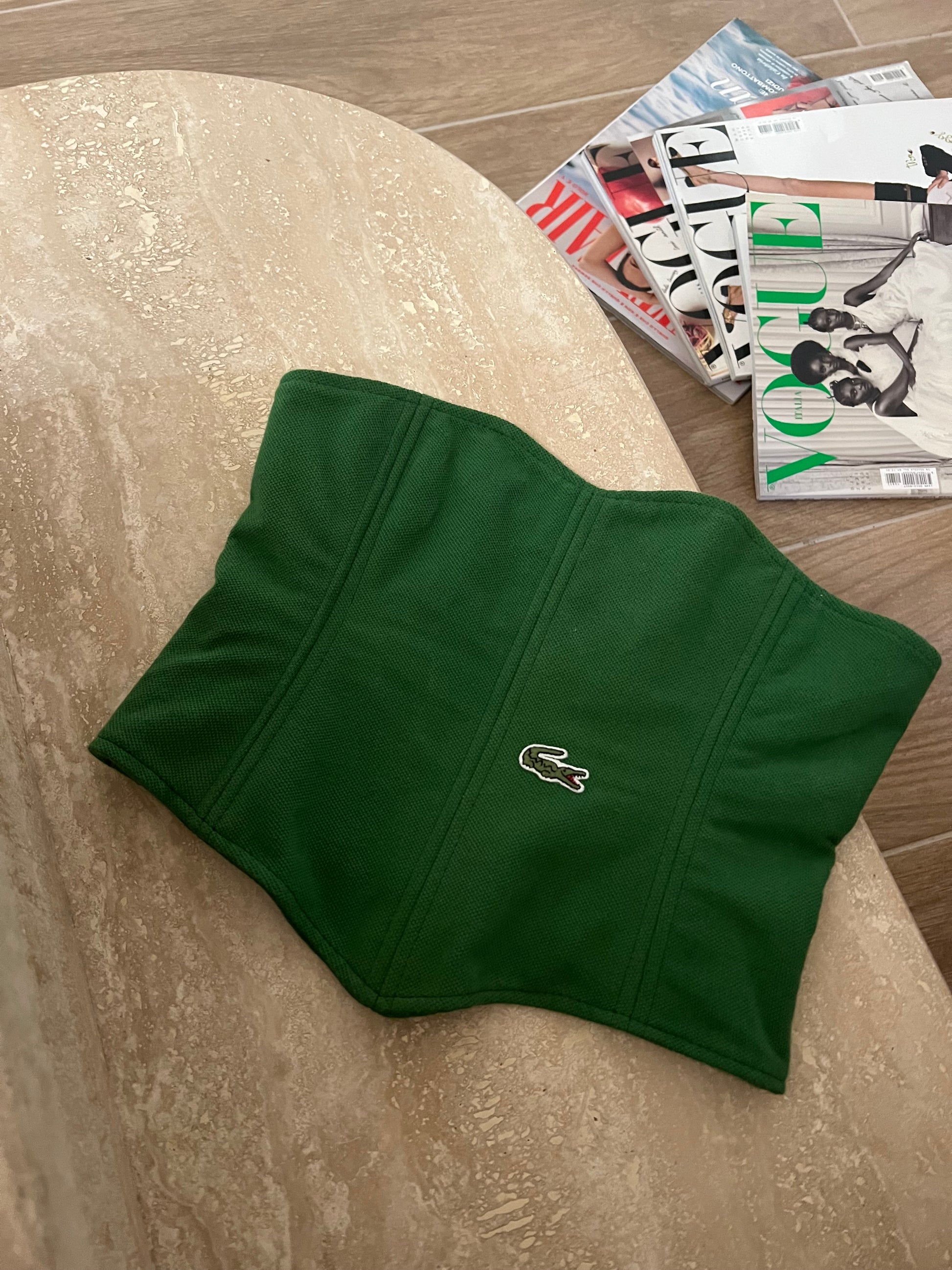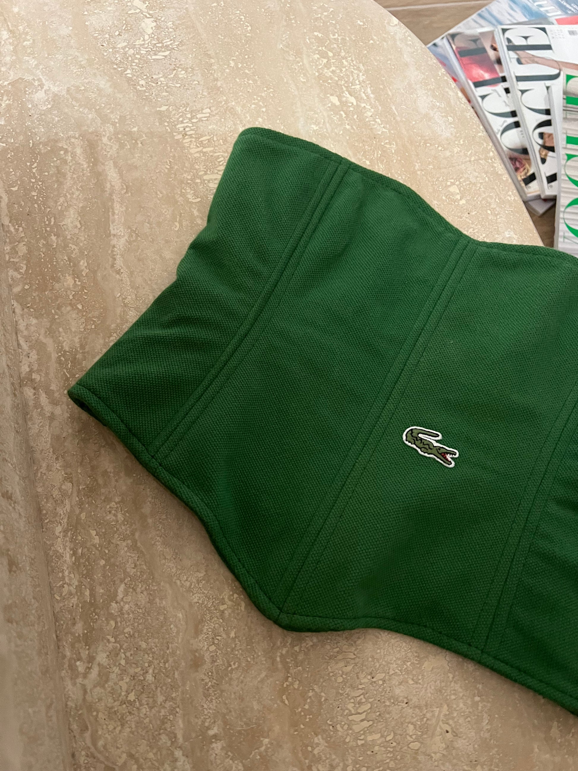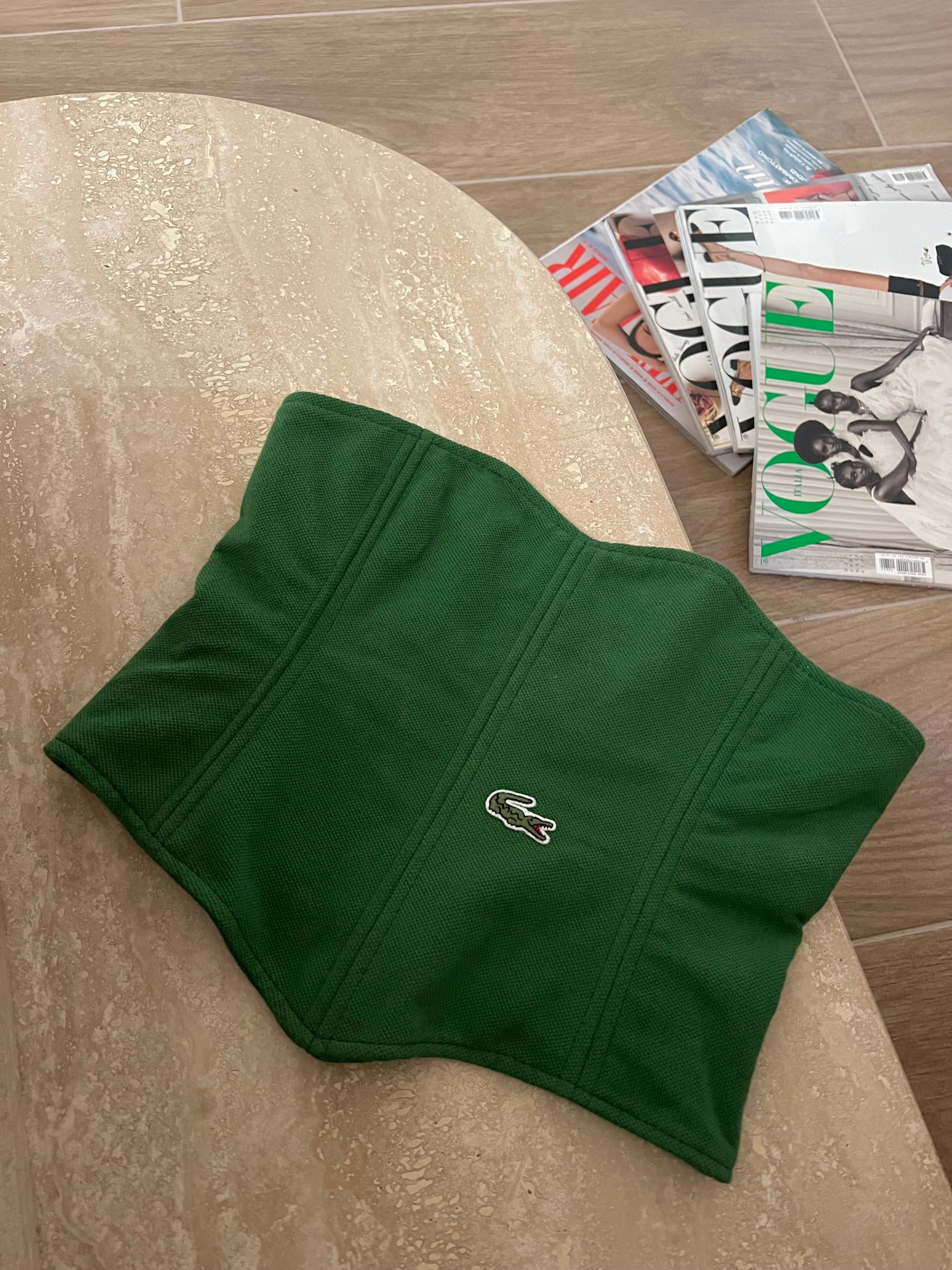 Corsetto Realizzato con una polo Lacoste Second Hand. Il Corsetto è regolabile, presenta degli occhielli sul retro dove con un laccetto è possibile regolare l‘aderenza.