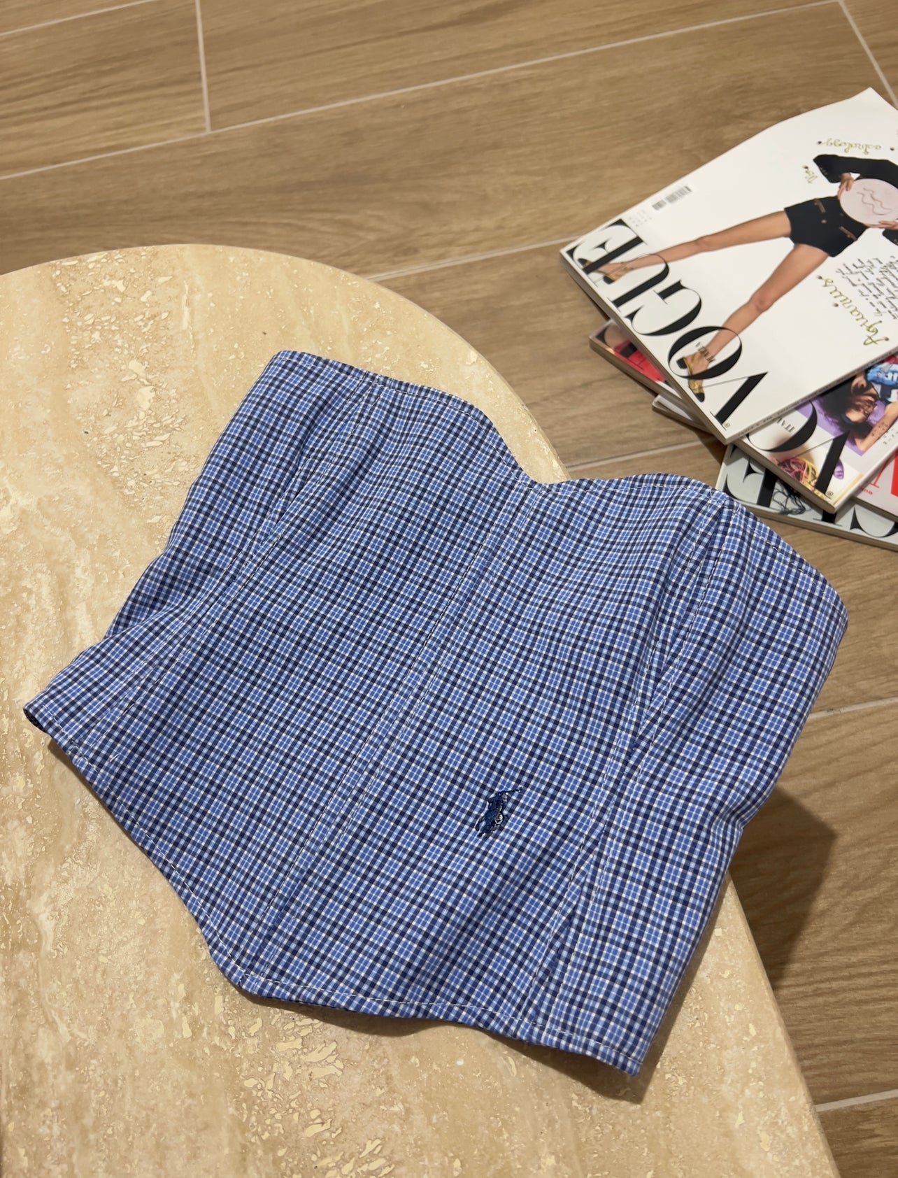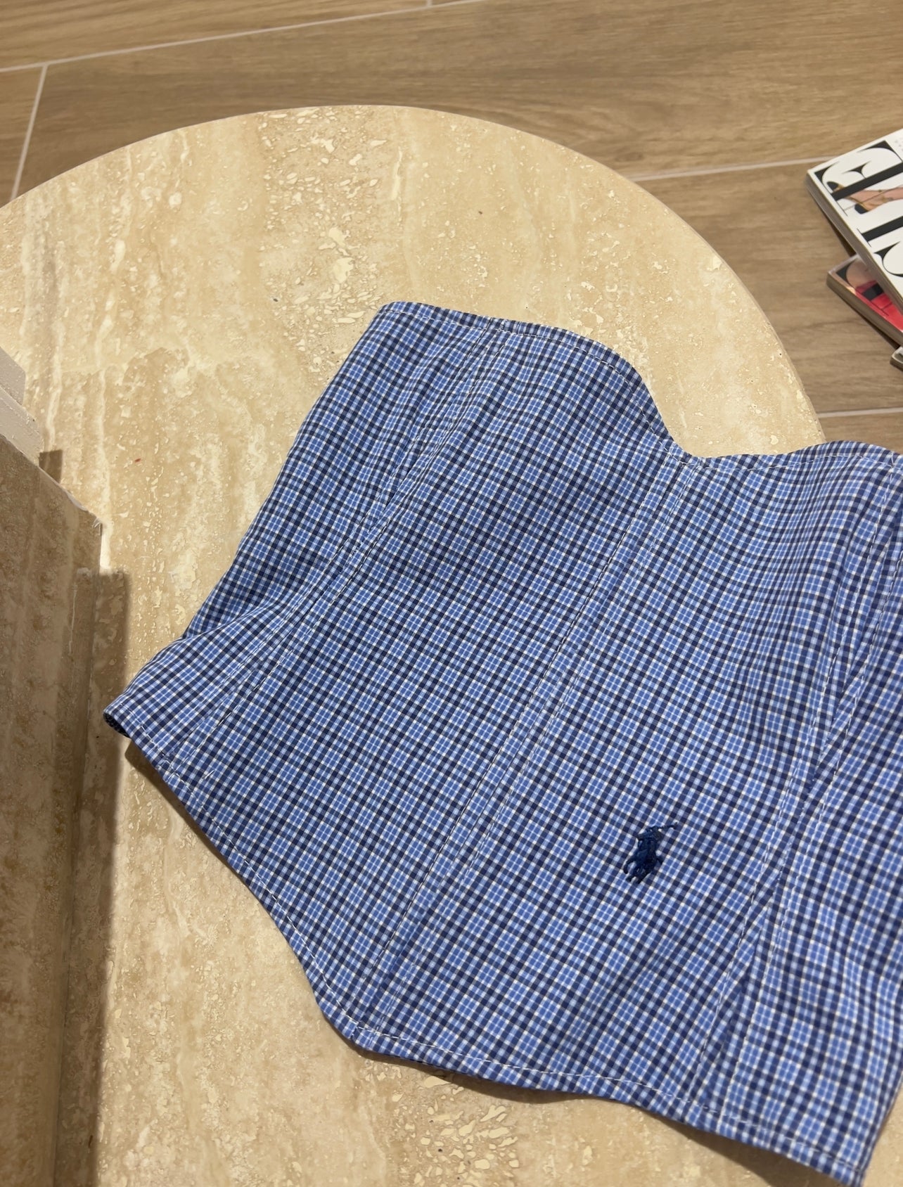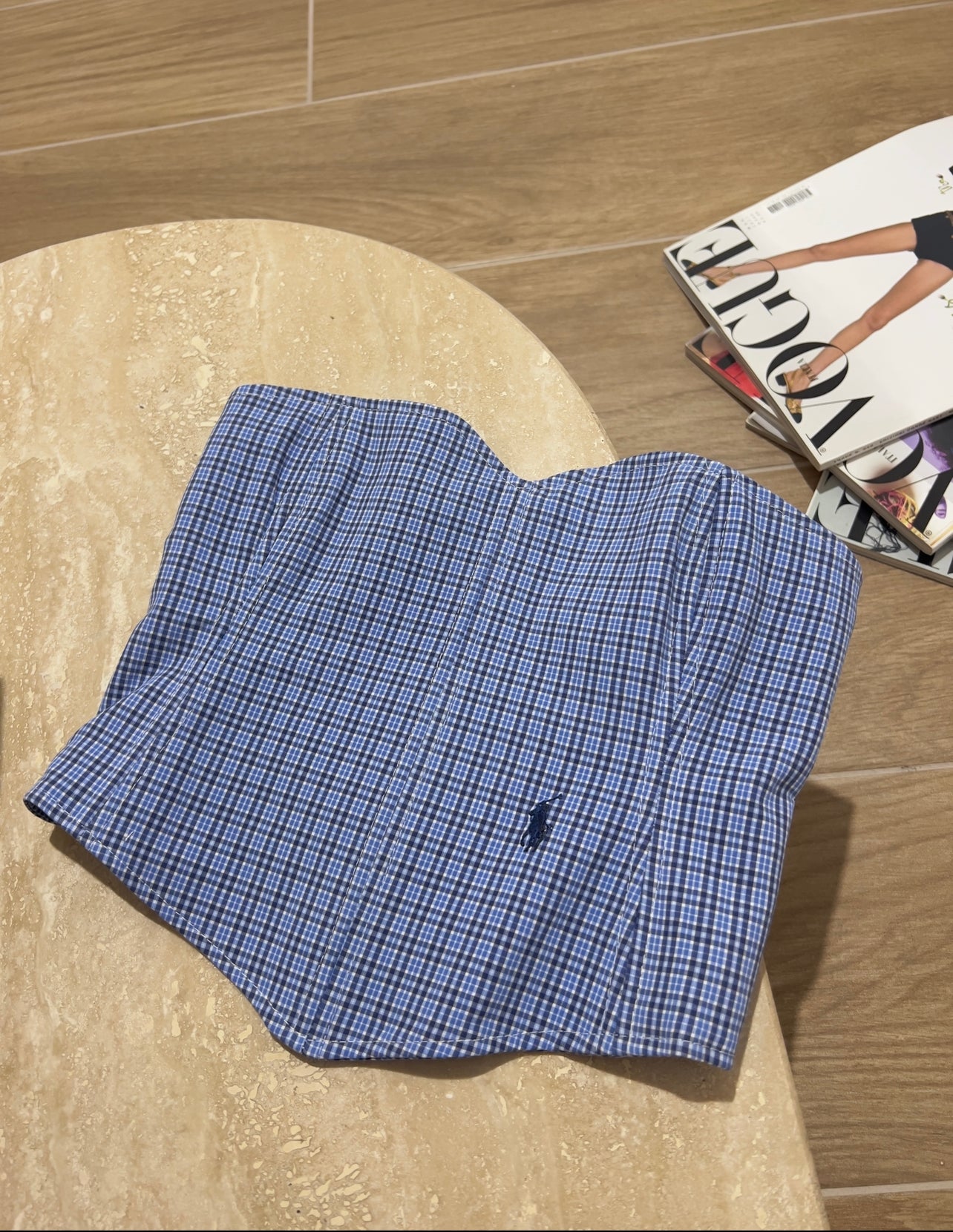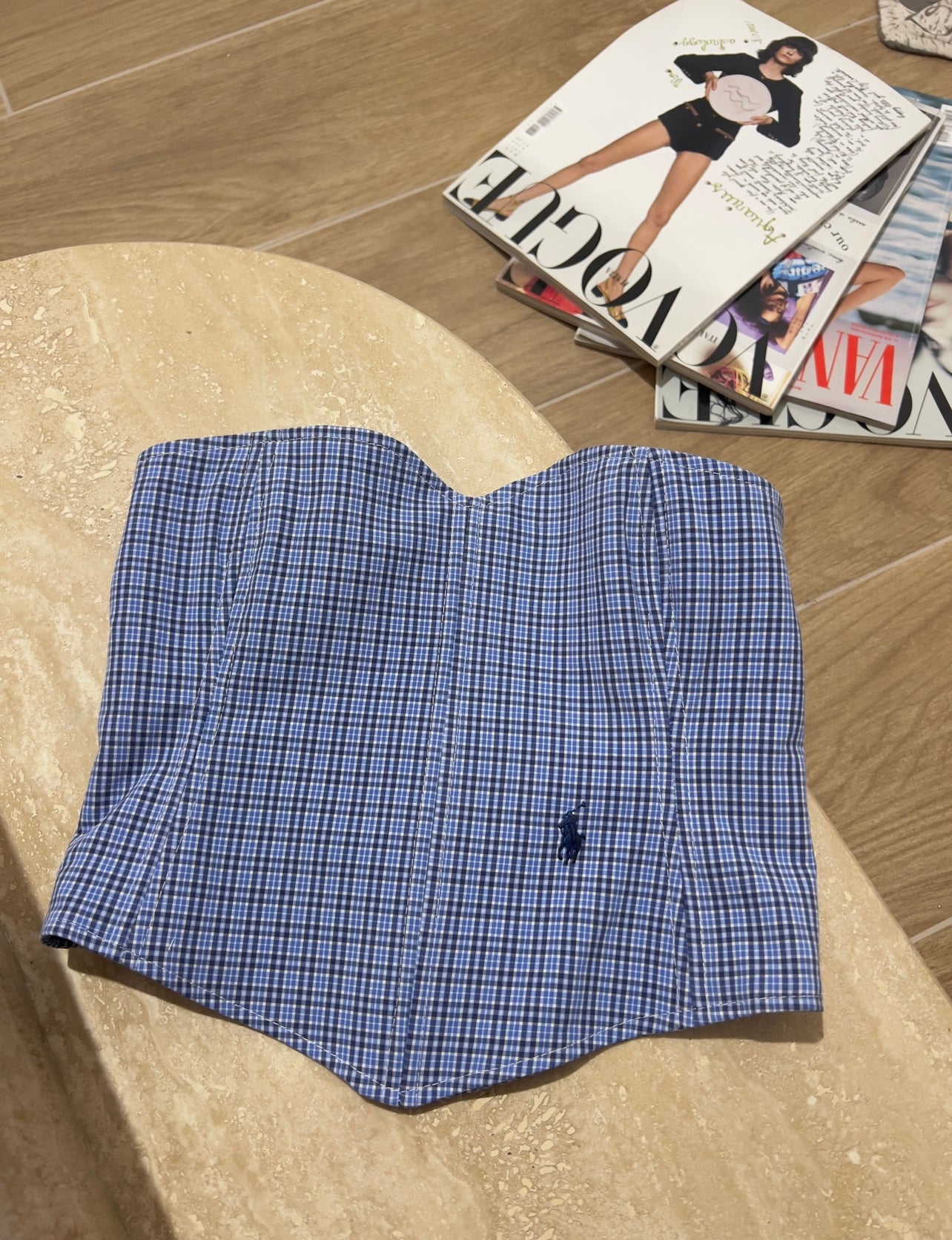 Corsetto Realizzato con una Camicia Ralph Lauren Second Hand. Il Corsetto è regolabile, porta degli occhielli sul retro dove con un laccetto è possibile regolare l‘aderenza.