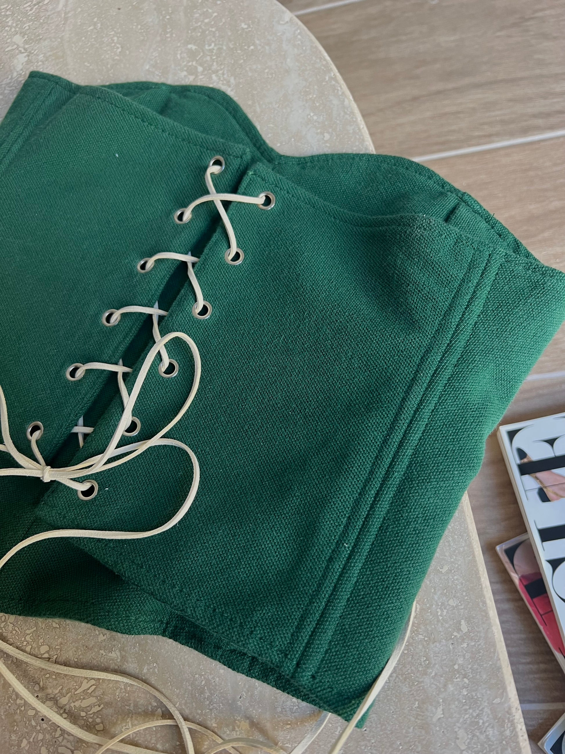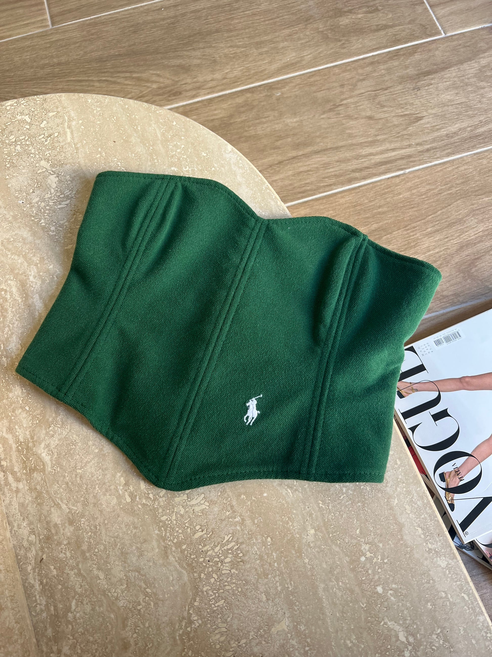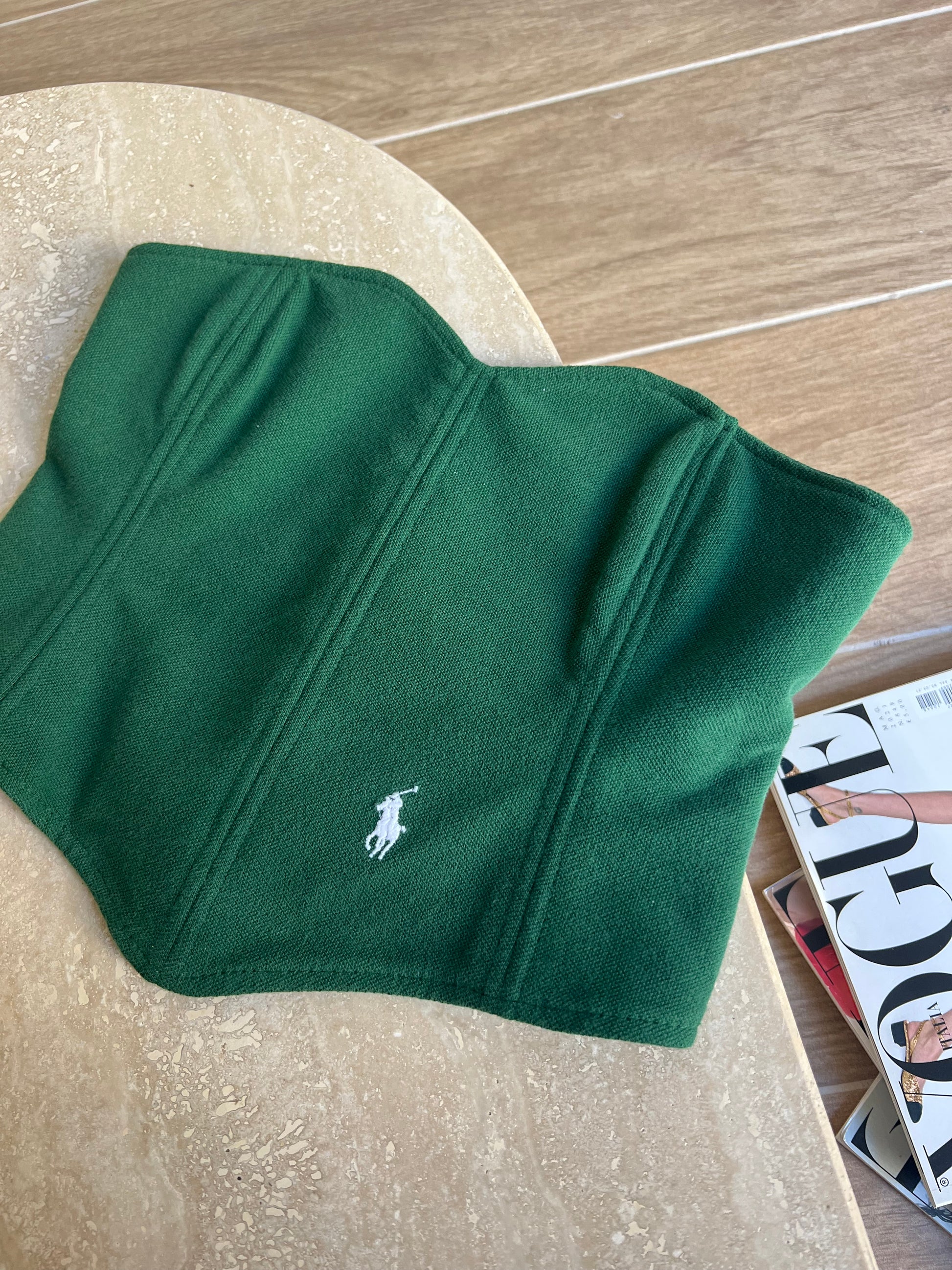 Corsetto Realizzato con una Polo Ralph Lauren Second Hand. Il Corsetto è regolabile, porta degli occhielli sul retro dove con un laccetto è possibile regolare l‘aderenza.