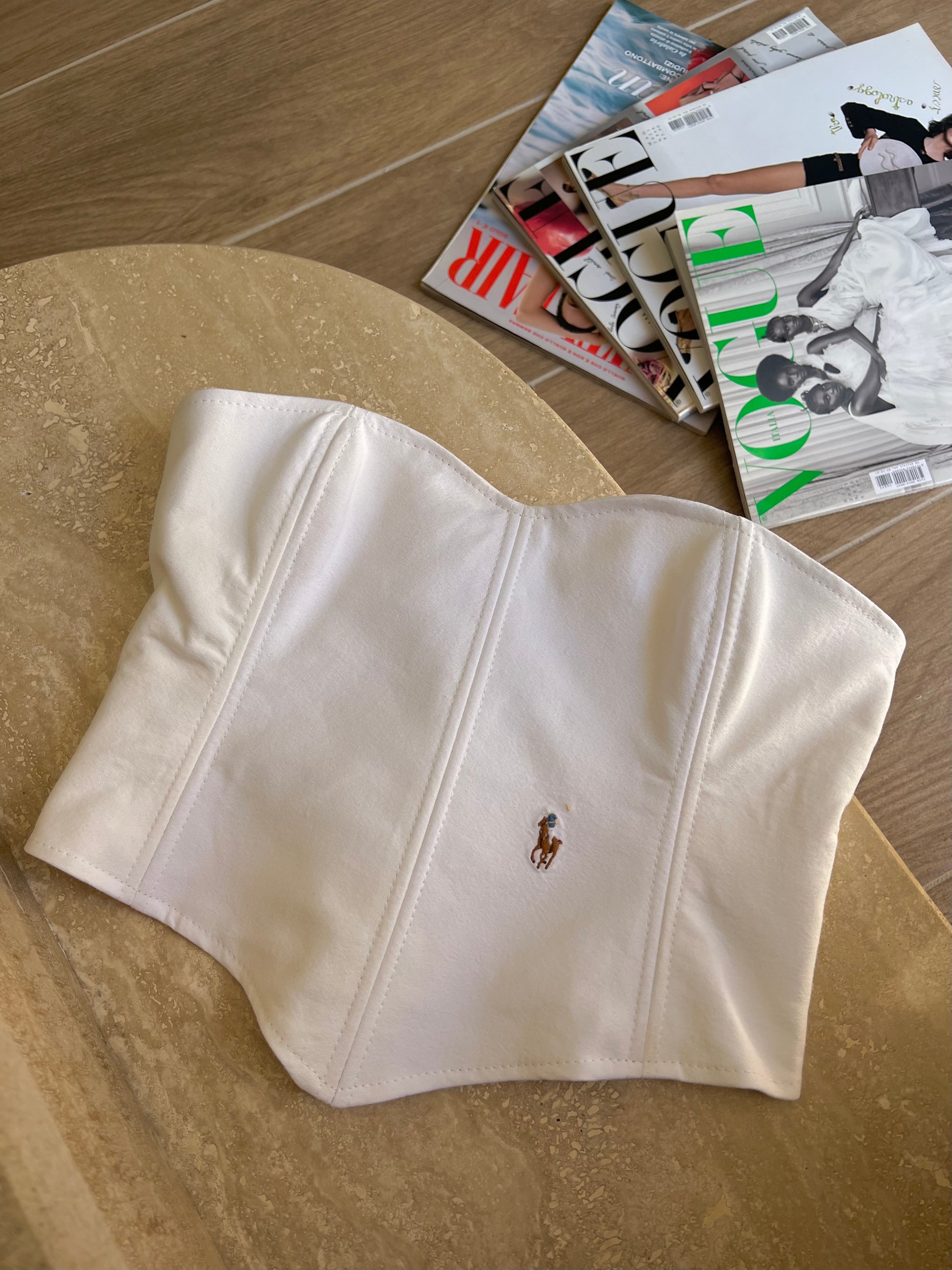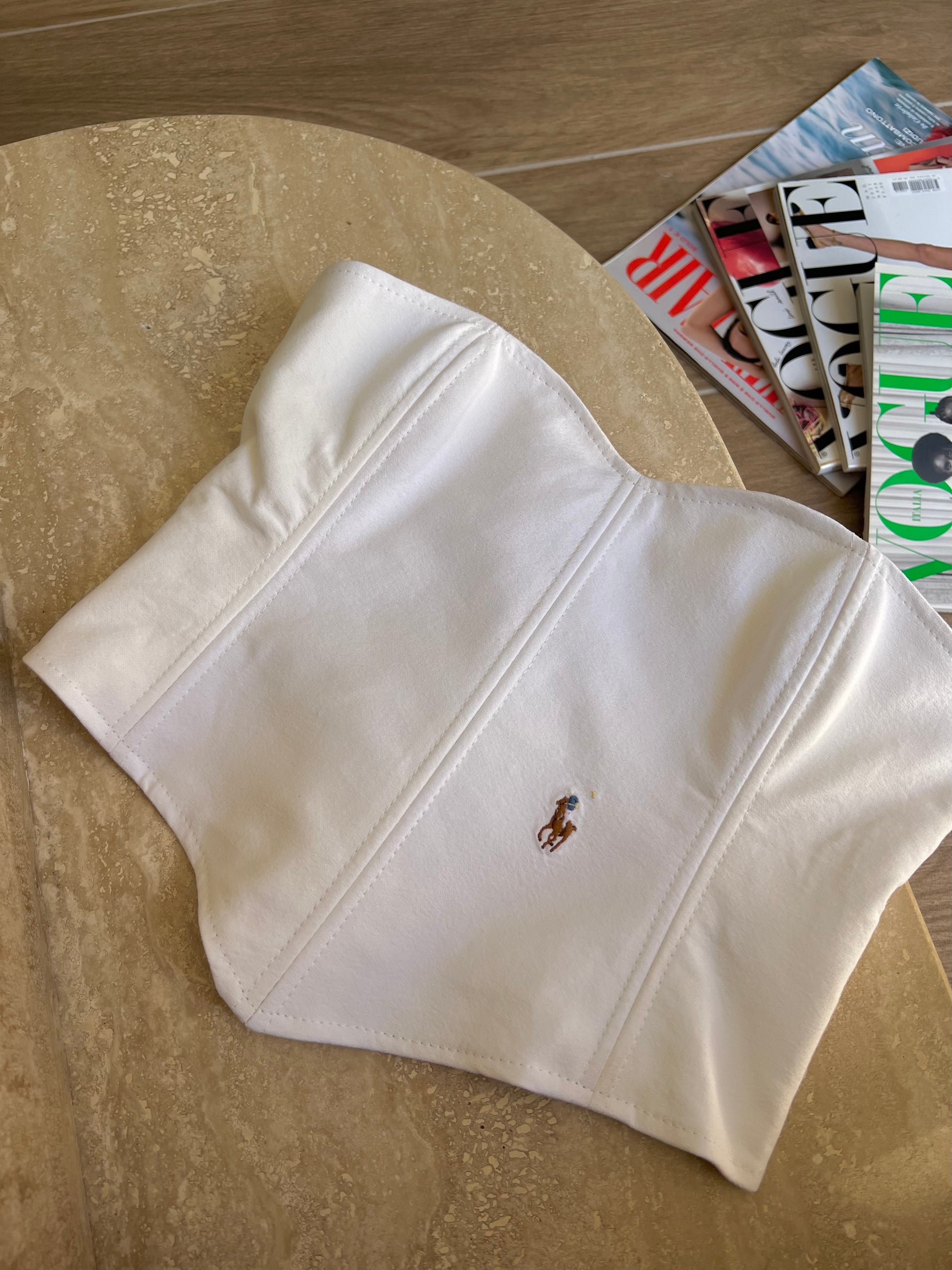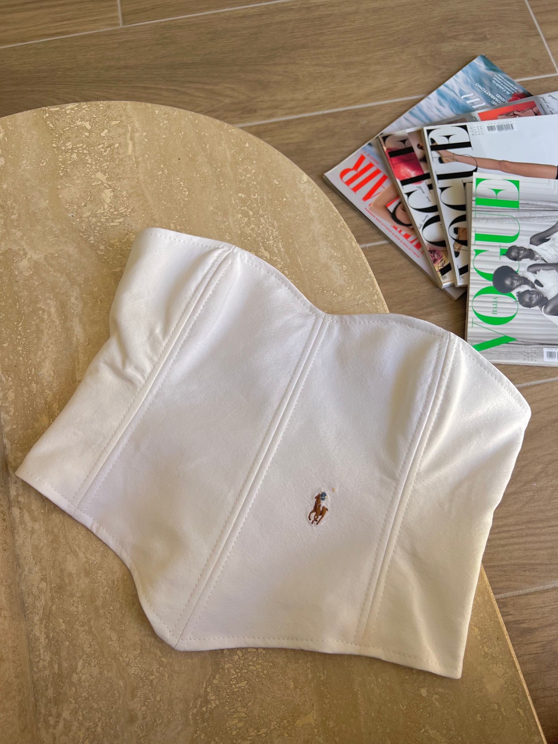 Corsetto Realizzato con una Camicia  Ralph lauren Second Hand. Il Corsetto è regolabile, presenta degli occhielli sul retro dove con un laccetto è possibile regolare l‘aderenza.