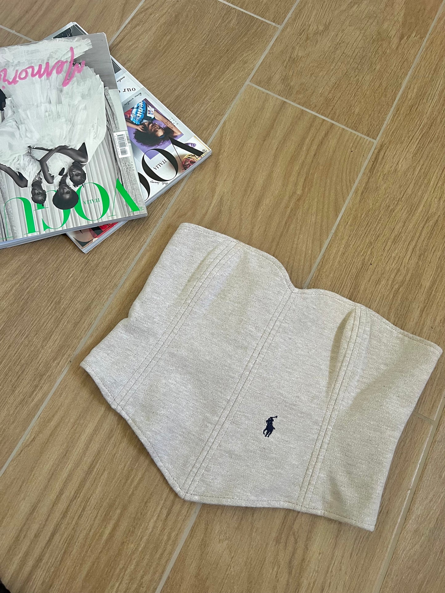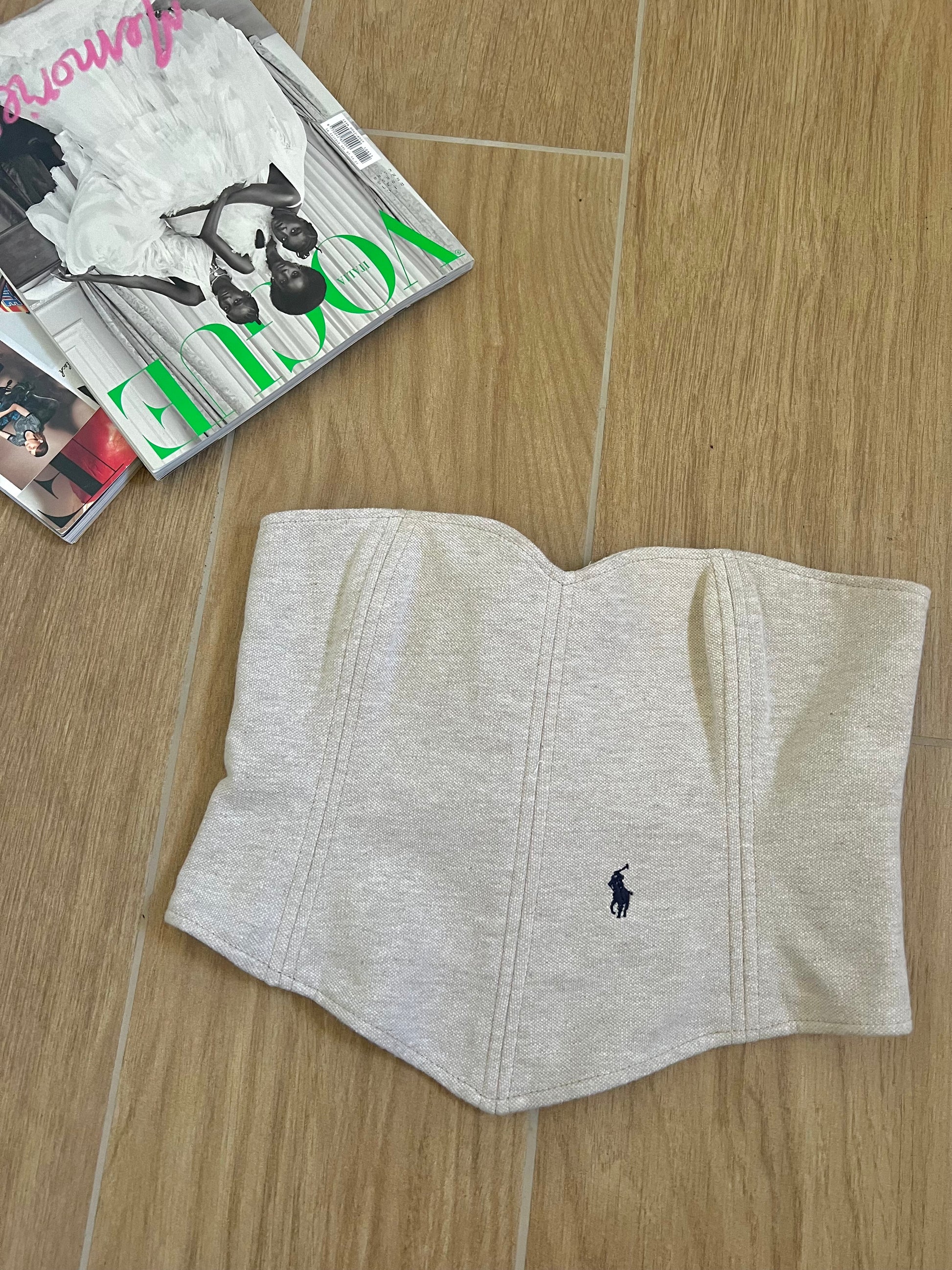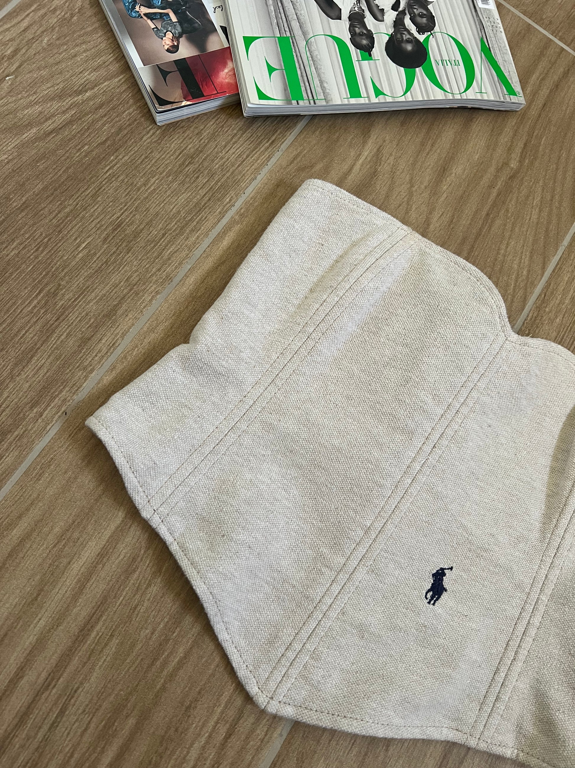 Corsetto Realizzato con una polo Ralph lauren Second Hand. Il Corsetto è regolabile, presenta degli occhielli sul retro dove con un laccetto è possibile regolare l‘aderenza.