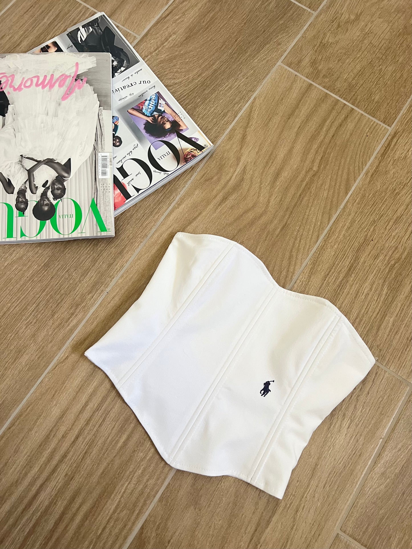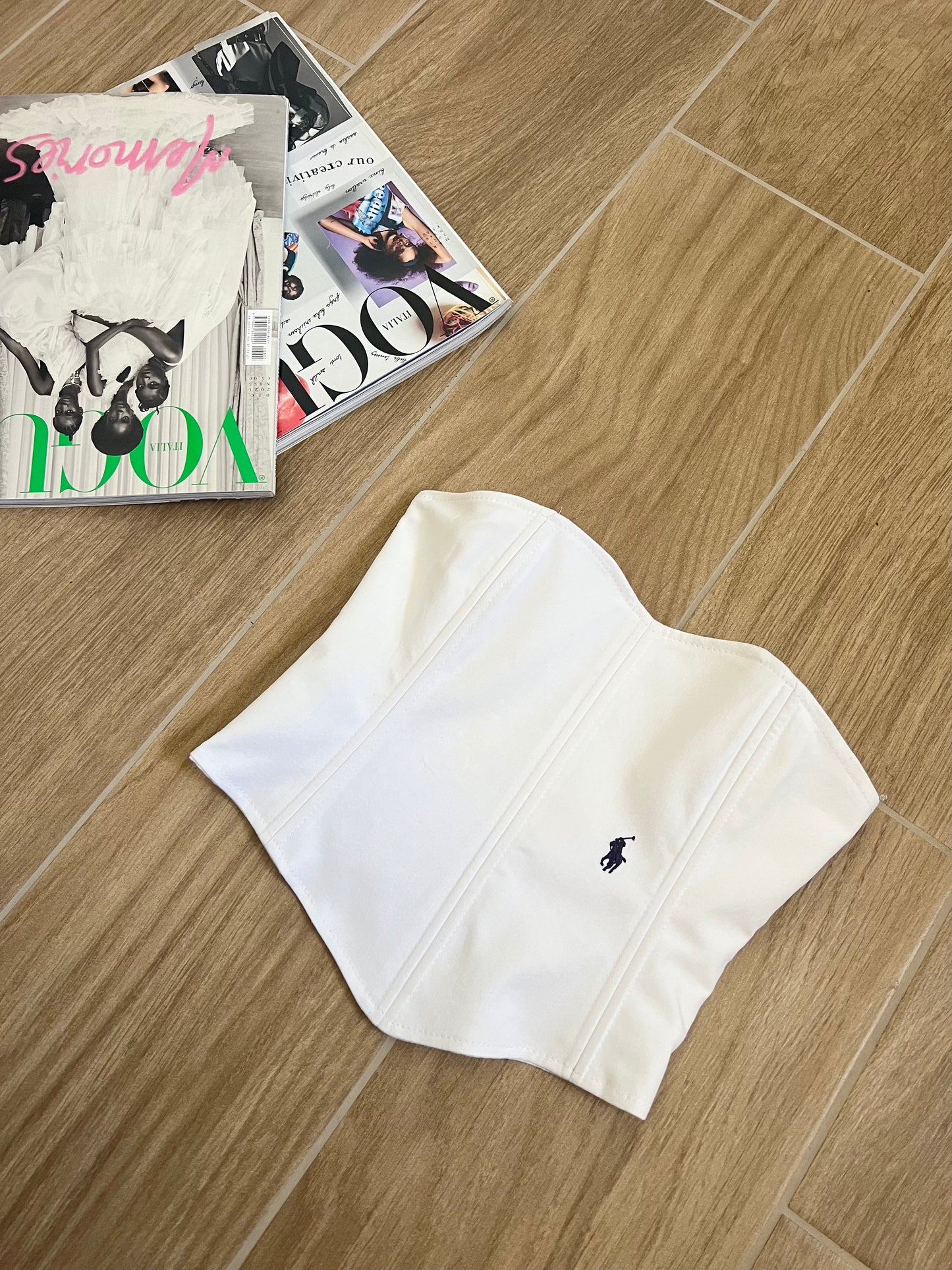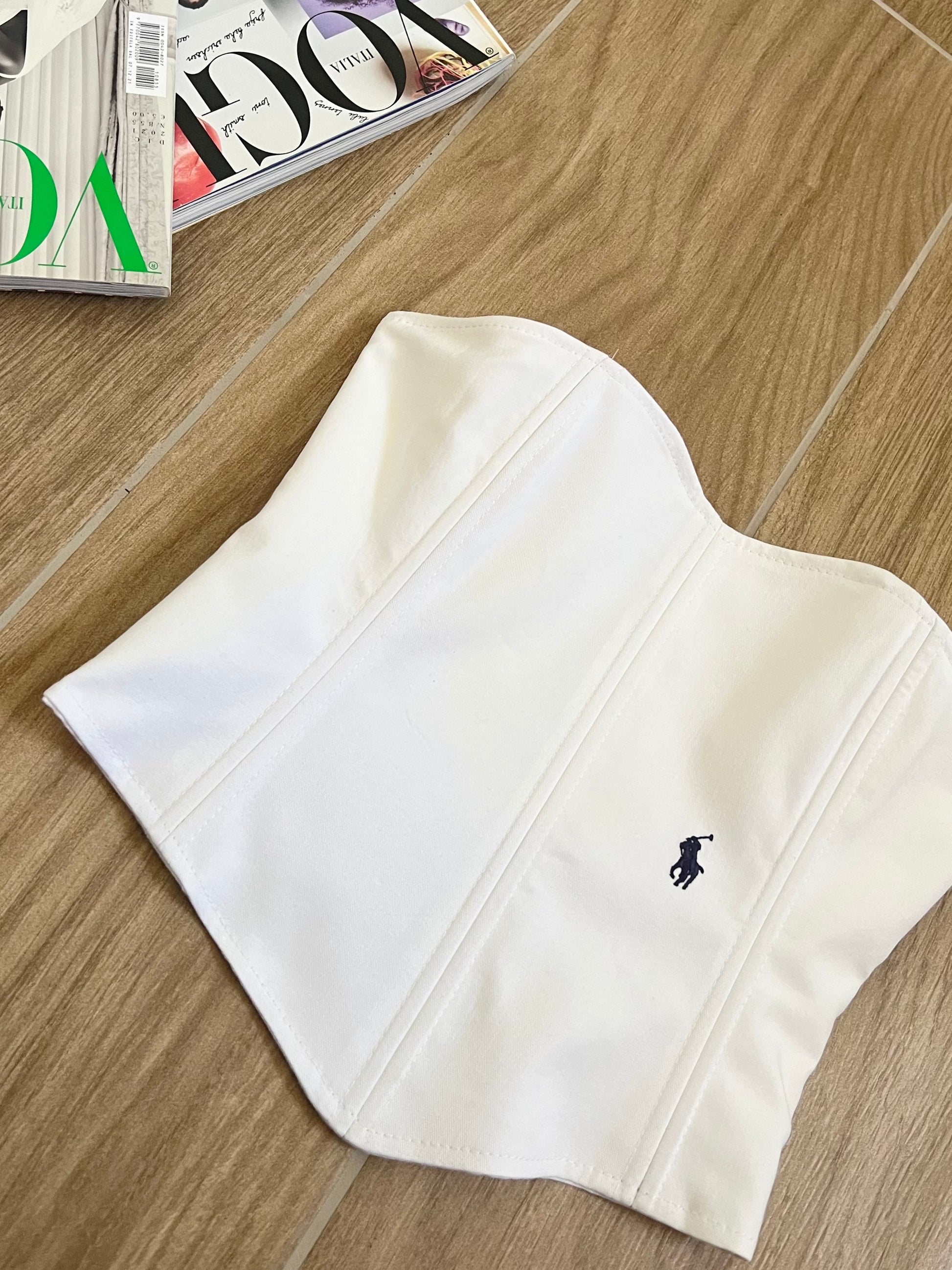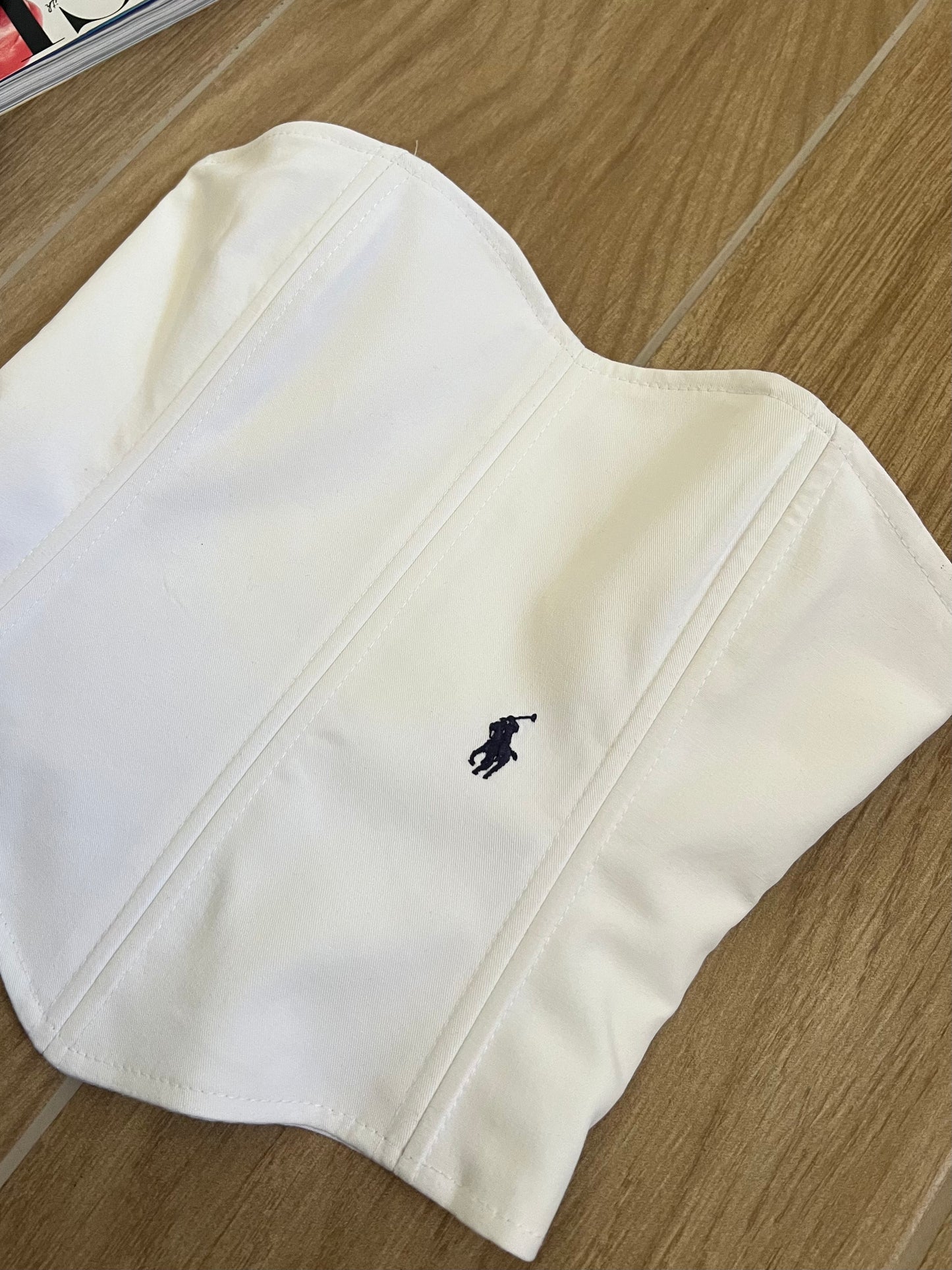 Corsetto Realizzato con una camicia Ralph lauren Second Hand. Il Corsetto è regolabile, presenta degli occhielli sul retro dove con un laccetto è possibile regolare l‘aderenza.