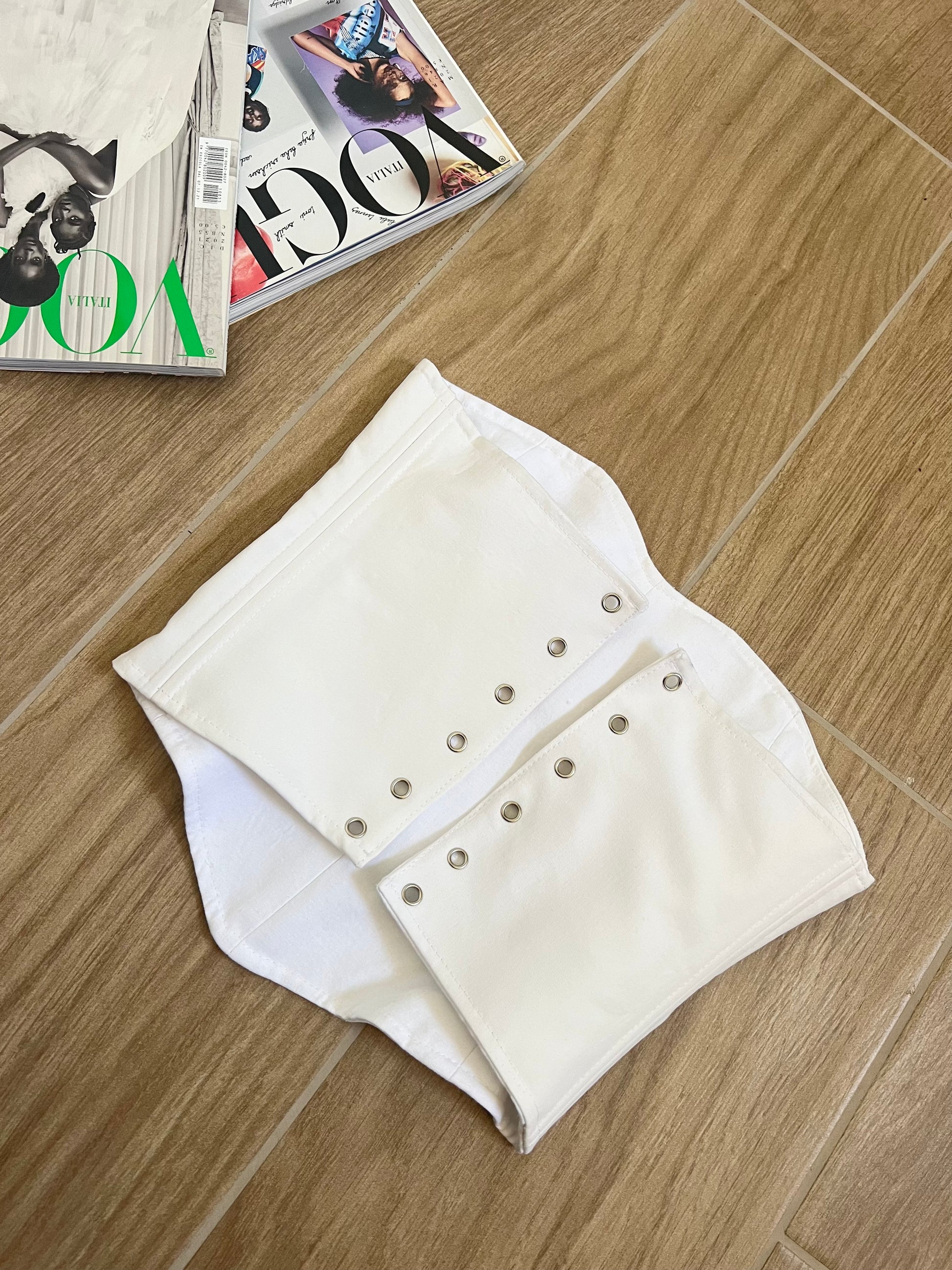 Il Corsetto non porta le coppe ma grazie alle stecche cucite all’intero permette di sorreggere il seno perfettamente.