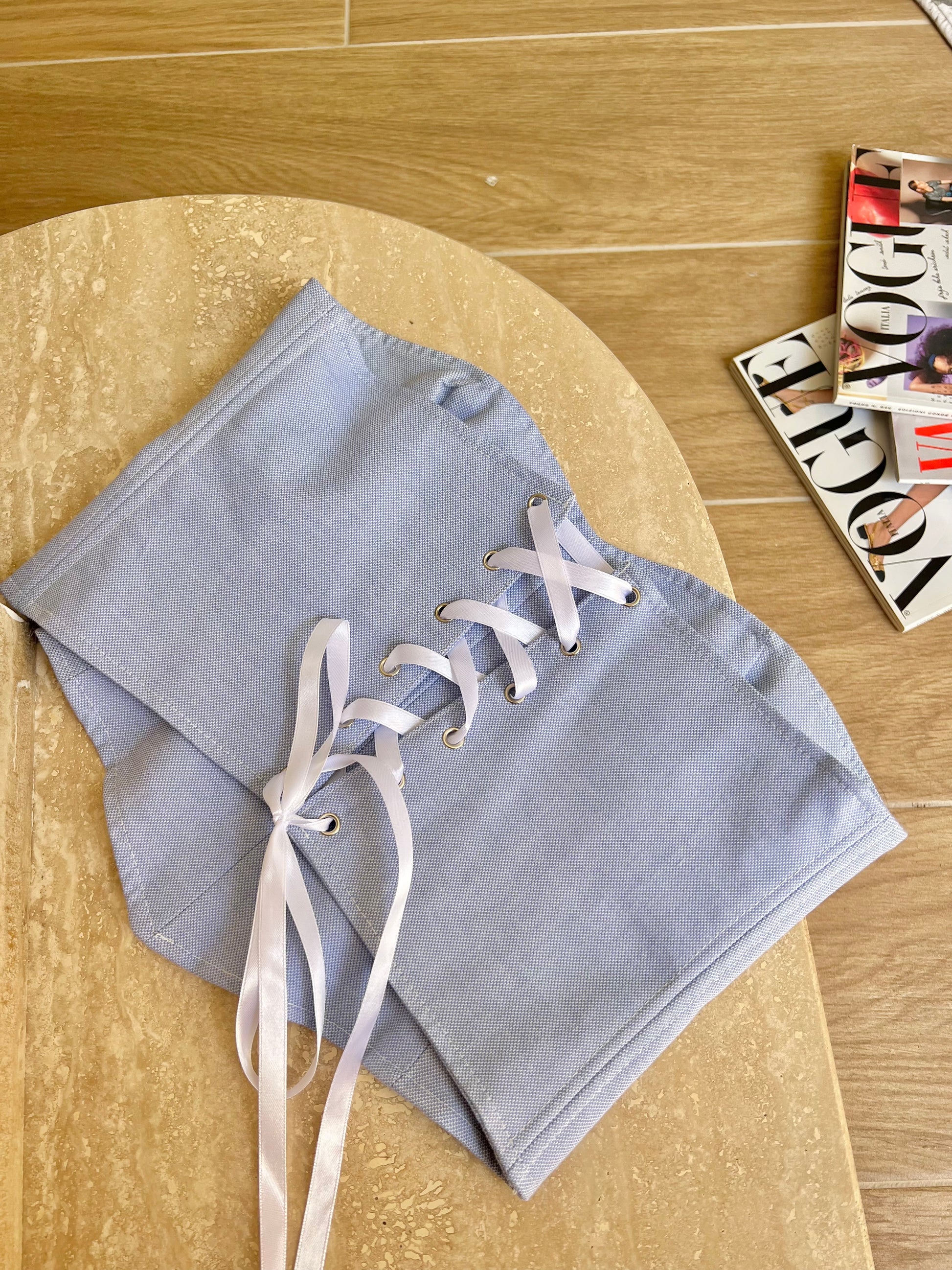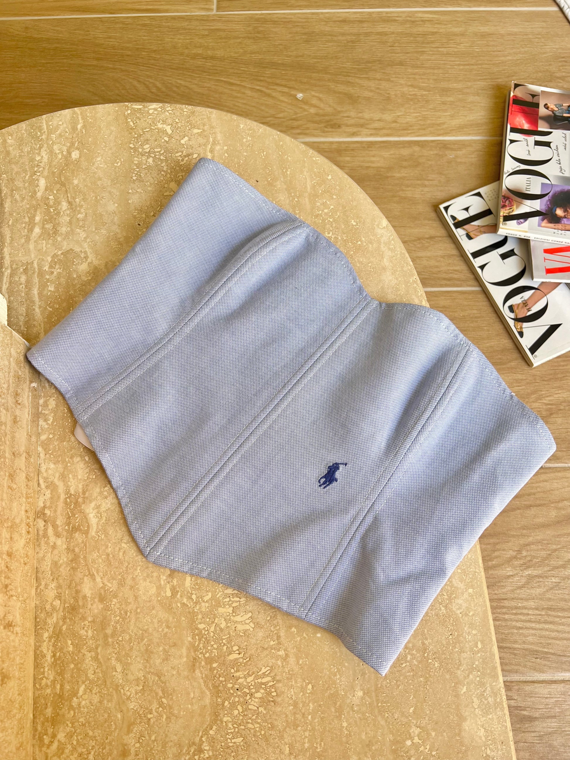 Corsetto Realizzato con una Camicia Ralph lauren Second Hand. Il Corsetto è regolabile, presenta degli occhielli sul retro dove con un laccetto è possibile regolare l‘aderenza.