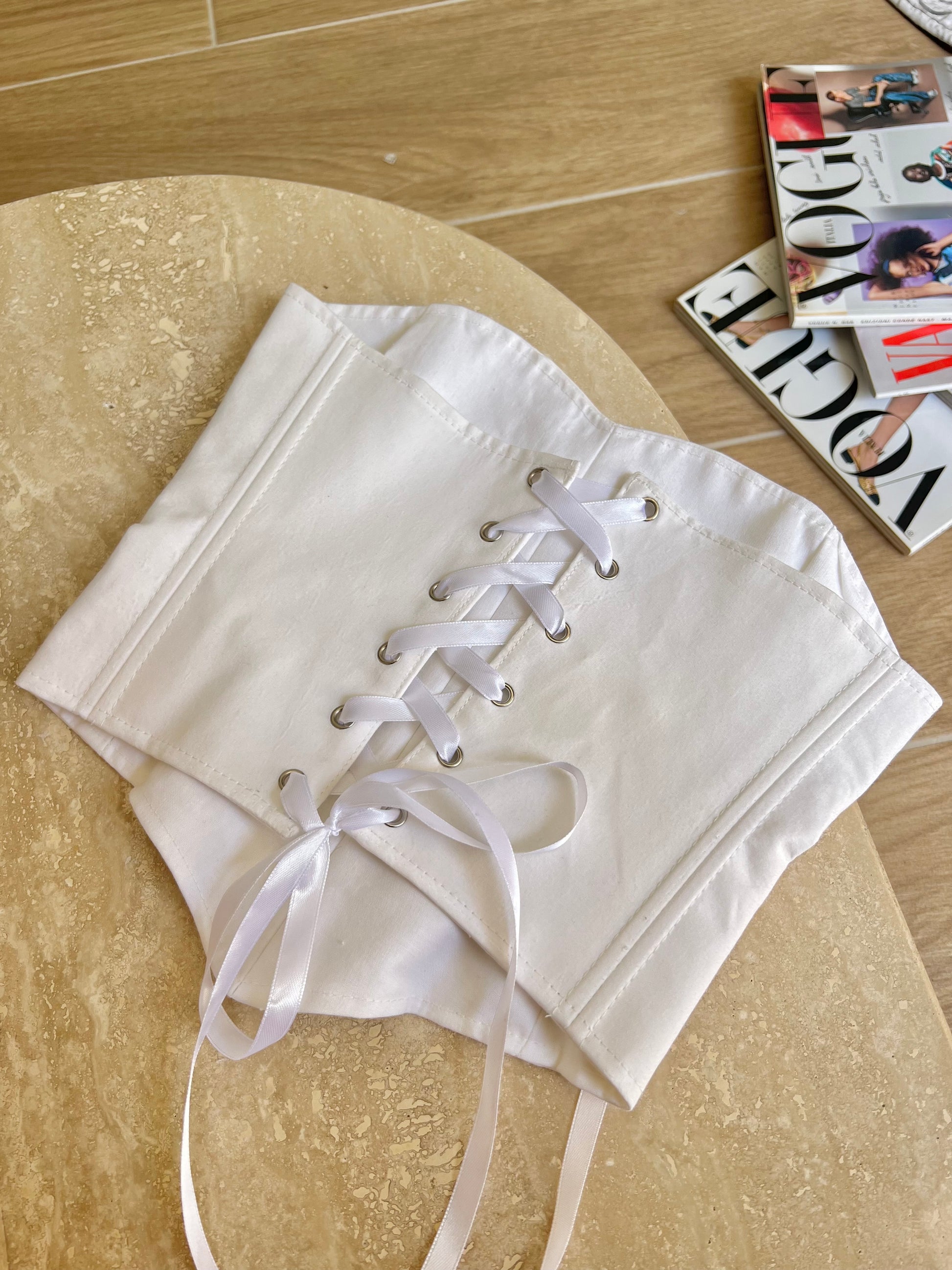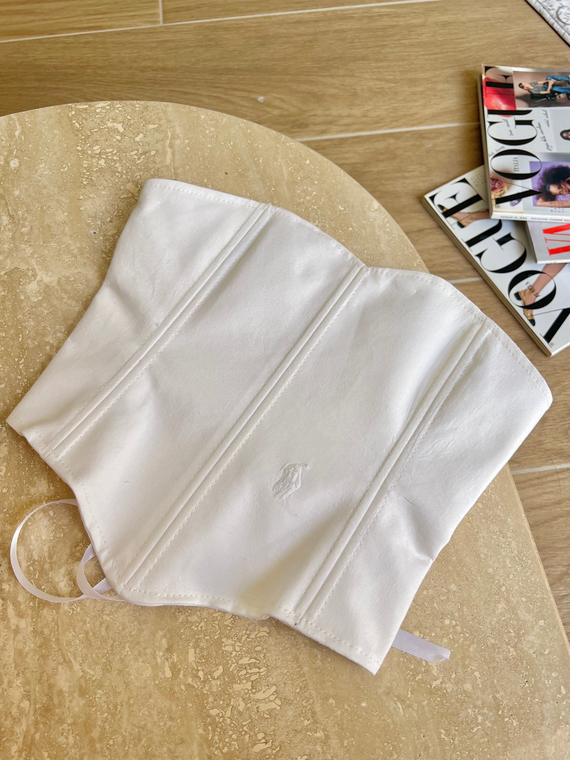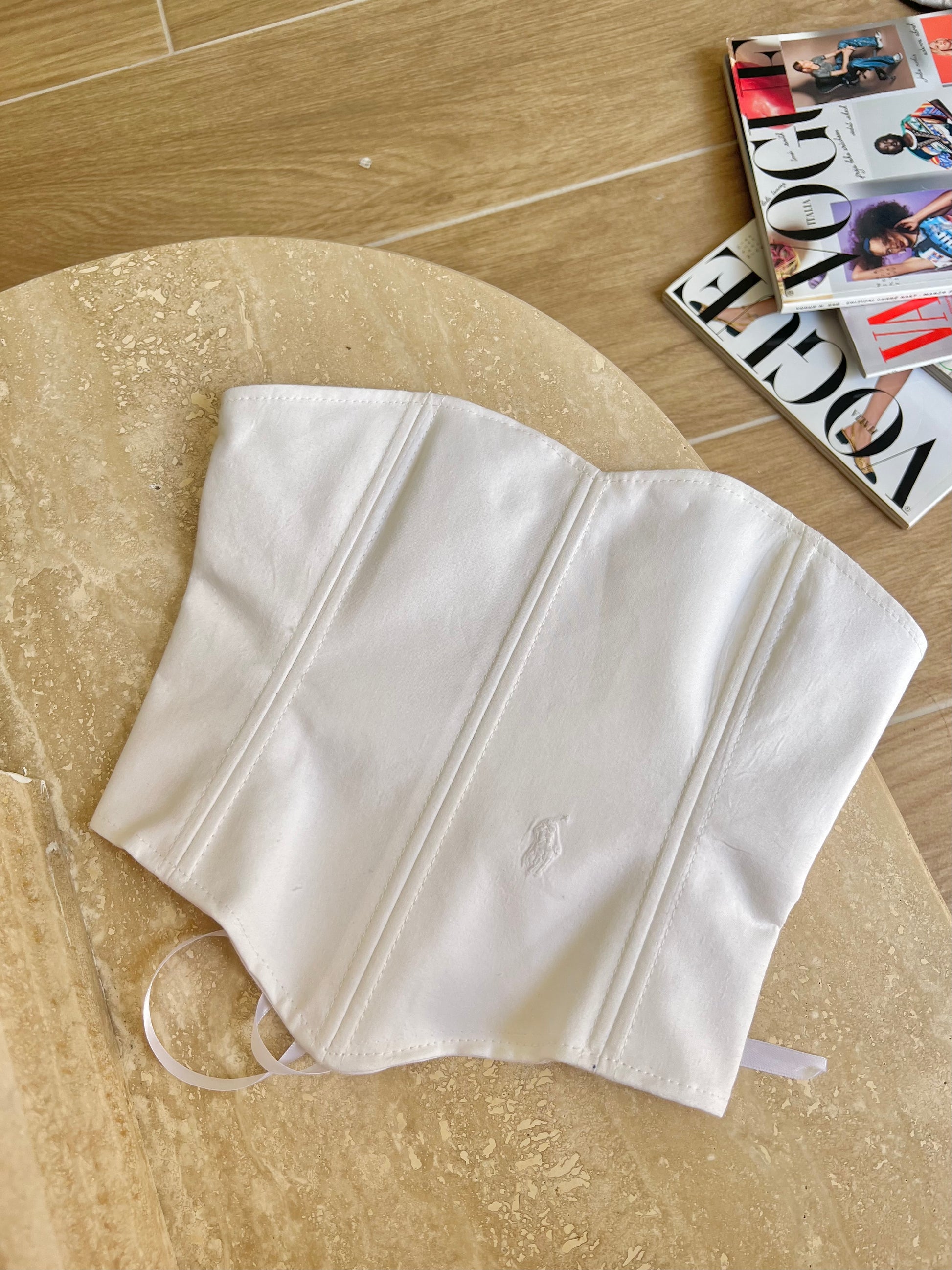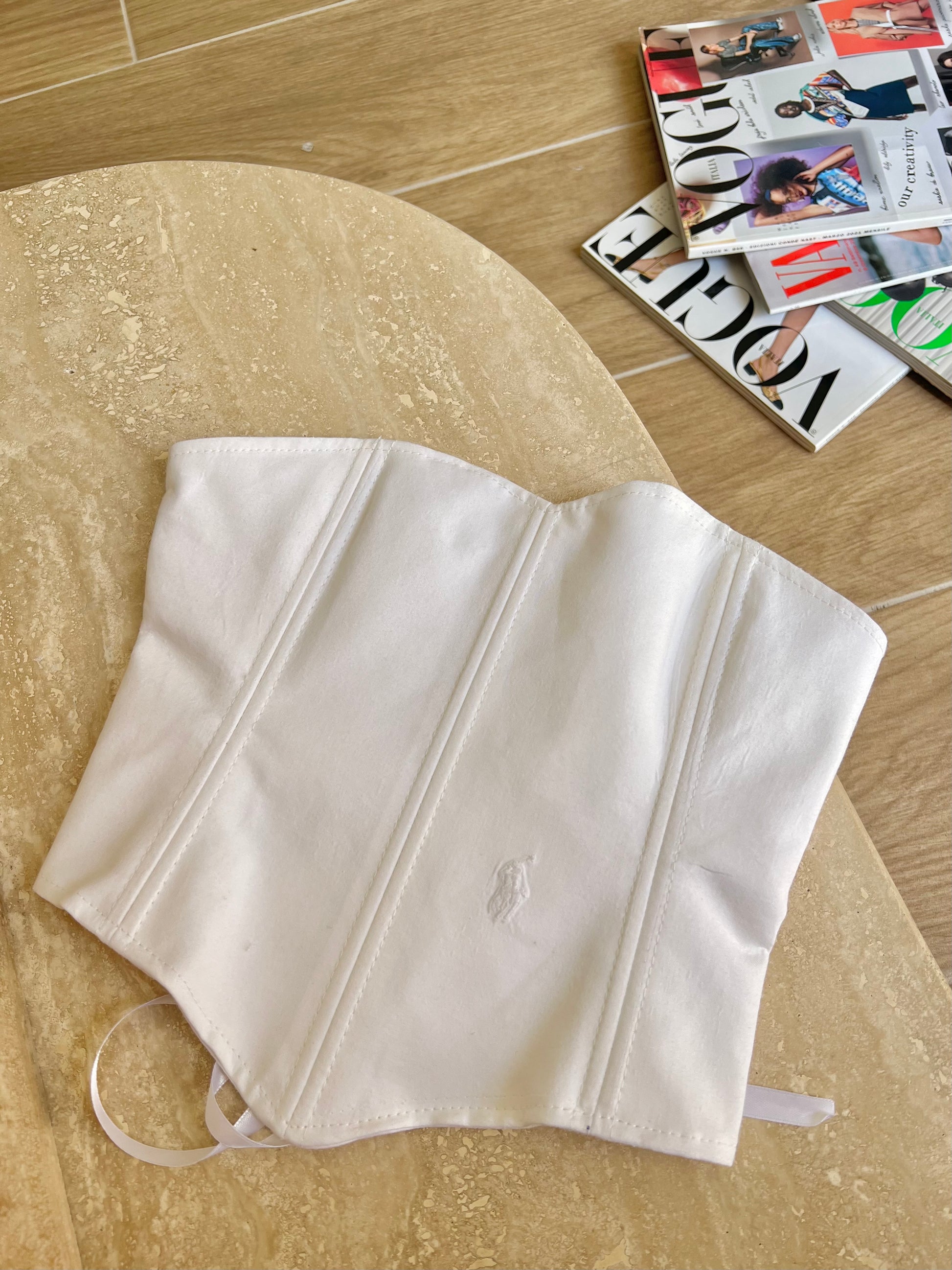 Corsetto Realizzato con una Camicia Ralph lauren Second Hand. Il Corsetto è regolabile, presenta degli occhielli sul retro dove con un laccetto è possibile regolare l‘aderenza.