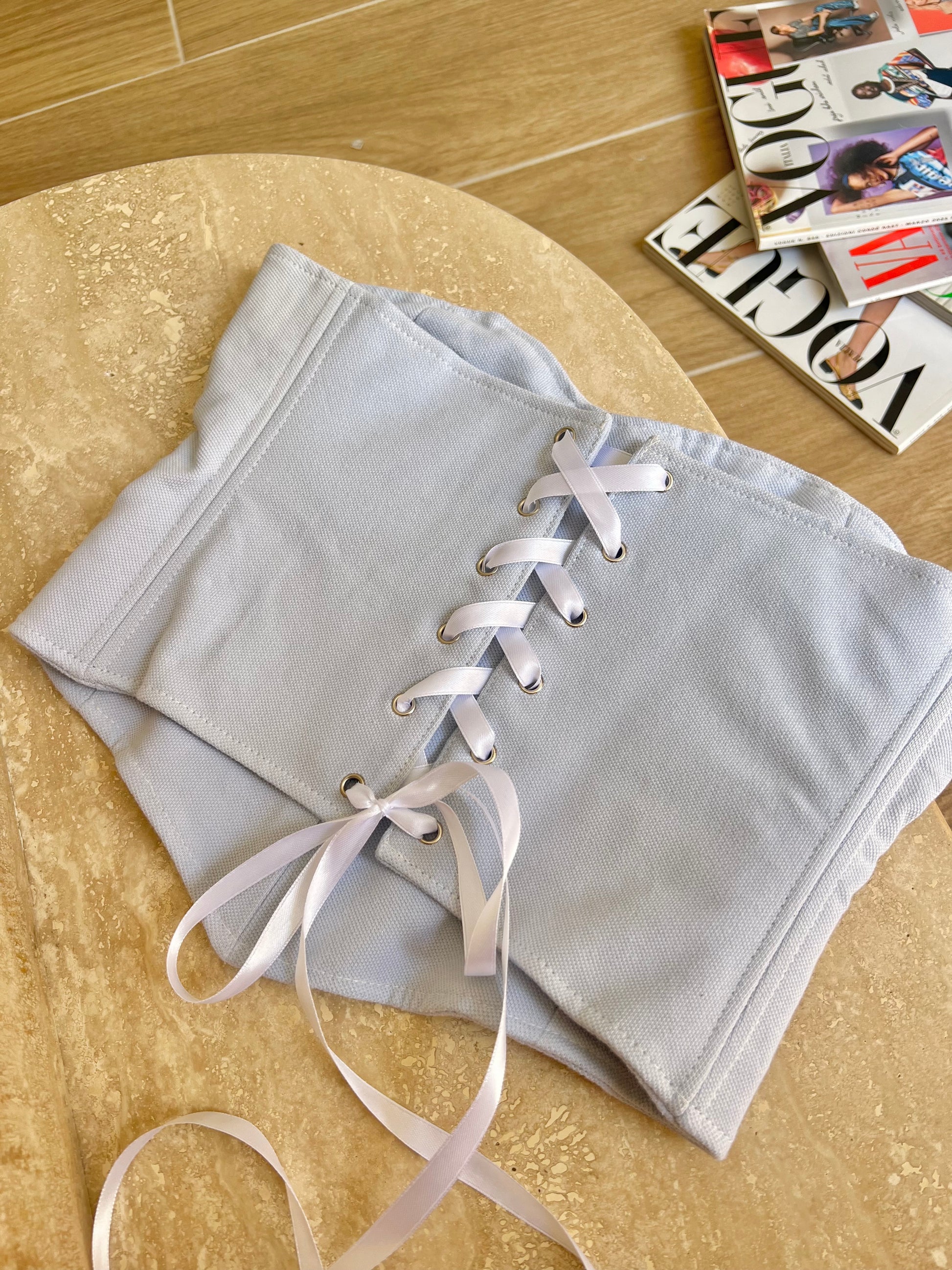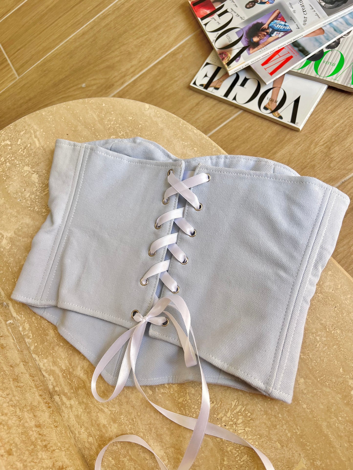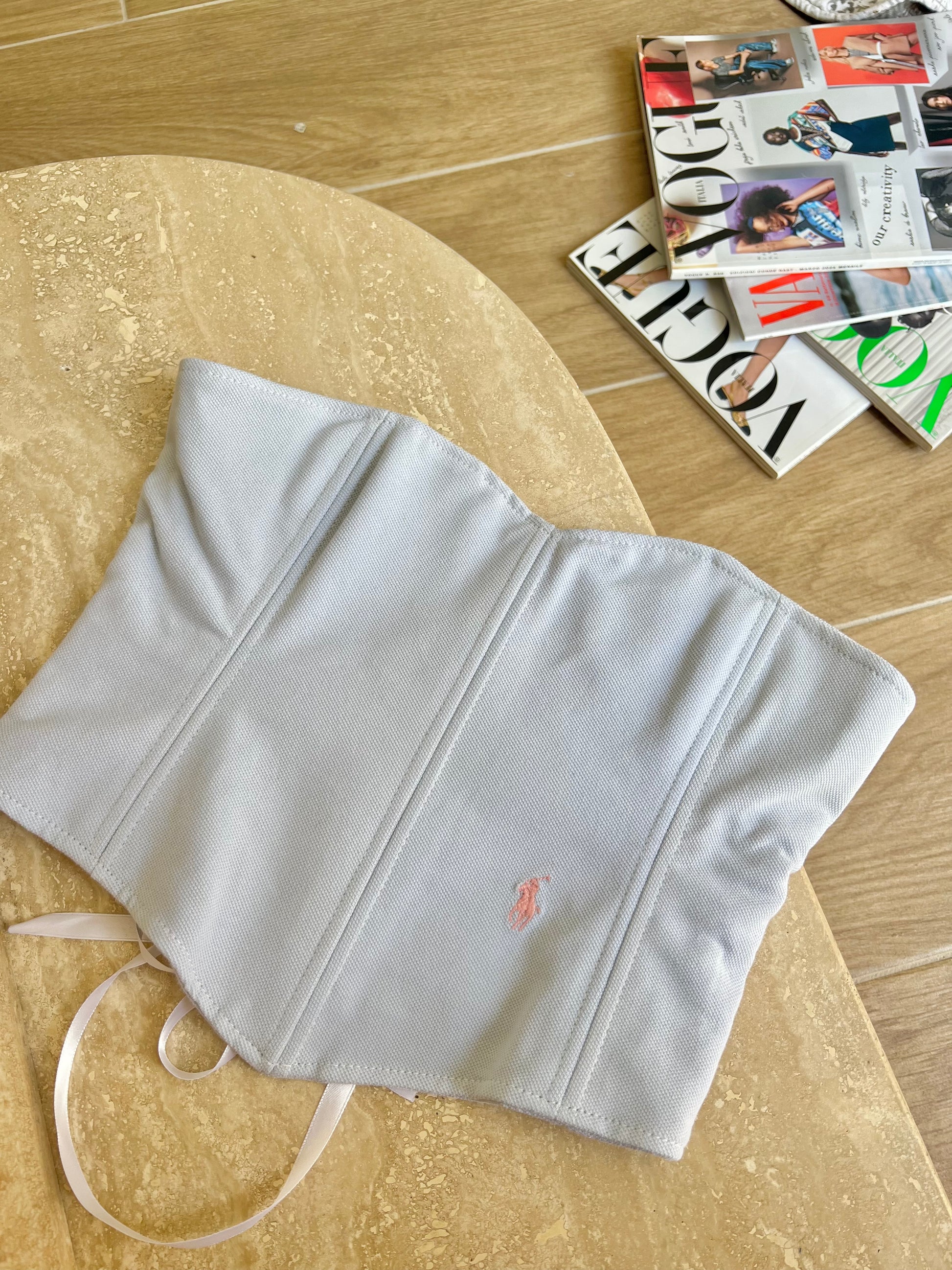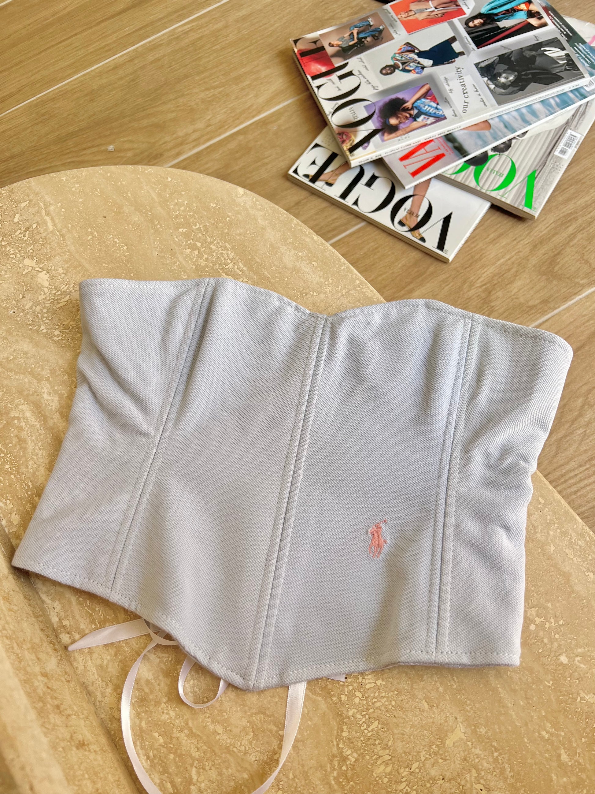 Corsetto Realizzato con una polo Ralph lauren Second Hand. Il Corsetto è regolabile, presenta degli occhielli sul retro dove con un laccetto è possibile regolare l‘aderenza.