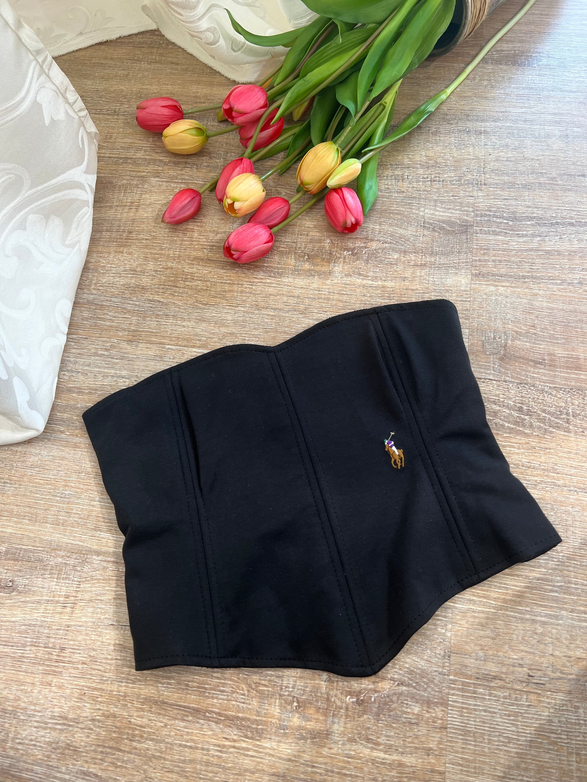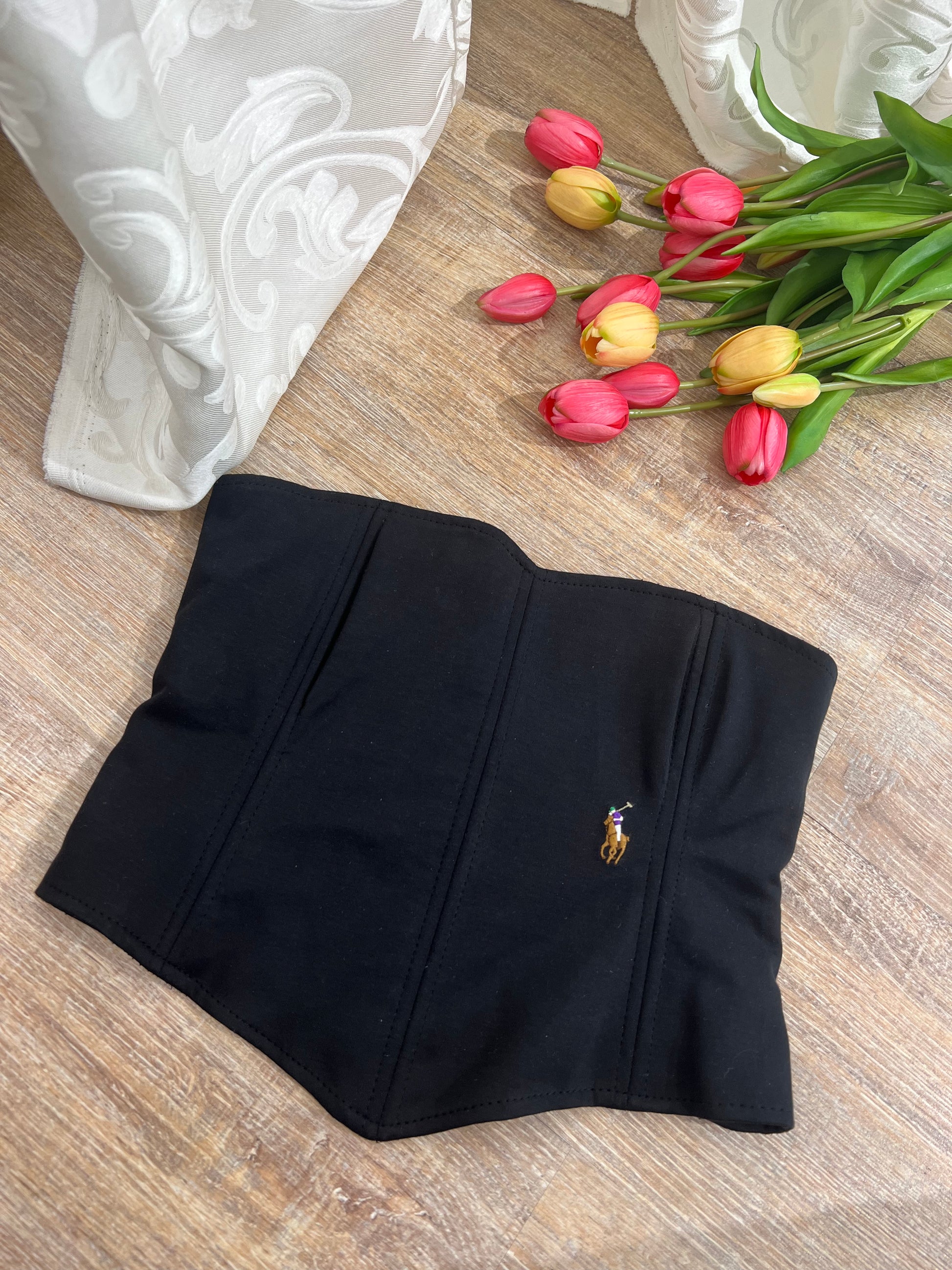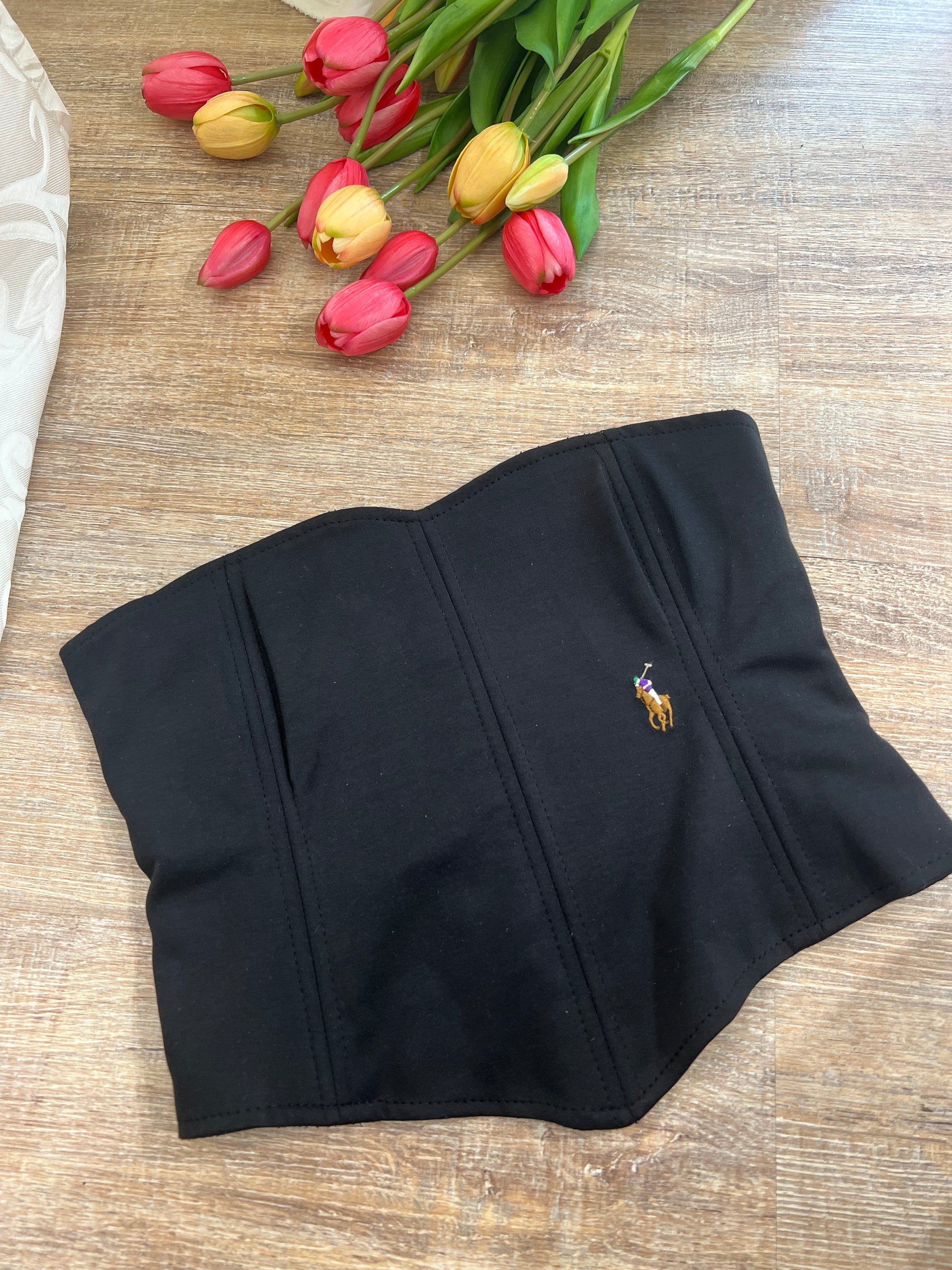 Corsetto Realizzato con una polo Ralph lauren Second Hand. Il Corsetto è regolabile, presenta degli occhielli sul retro dove con un laccetto è possibile regolare l‘aderenza.
