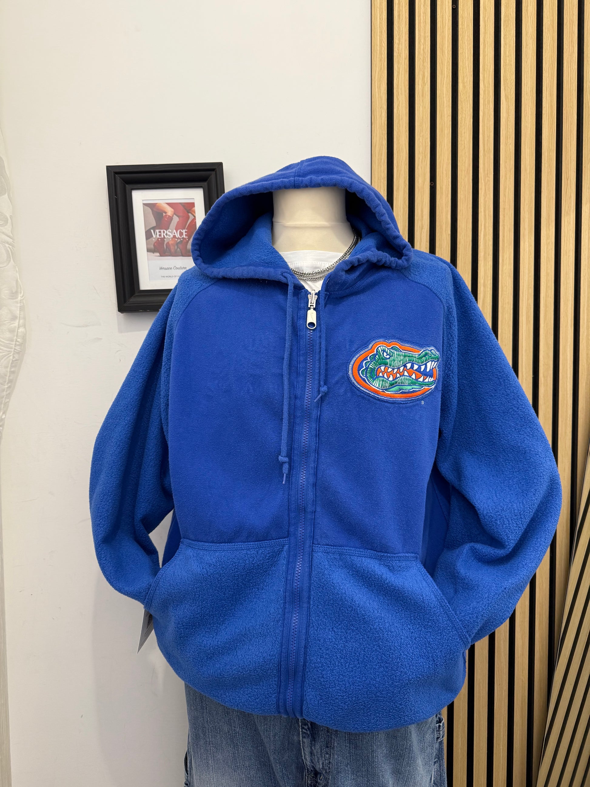 Felpa Nike con zip e cappuccio in pile morbido e caldo double face, composizione 80% cotone e 20% poliestere, taglia L. Colore blu elettrico con logo Florida Gators sul petto e scritta "FLORIDA" ricamata, tipica dello stile collegiale americano.
