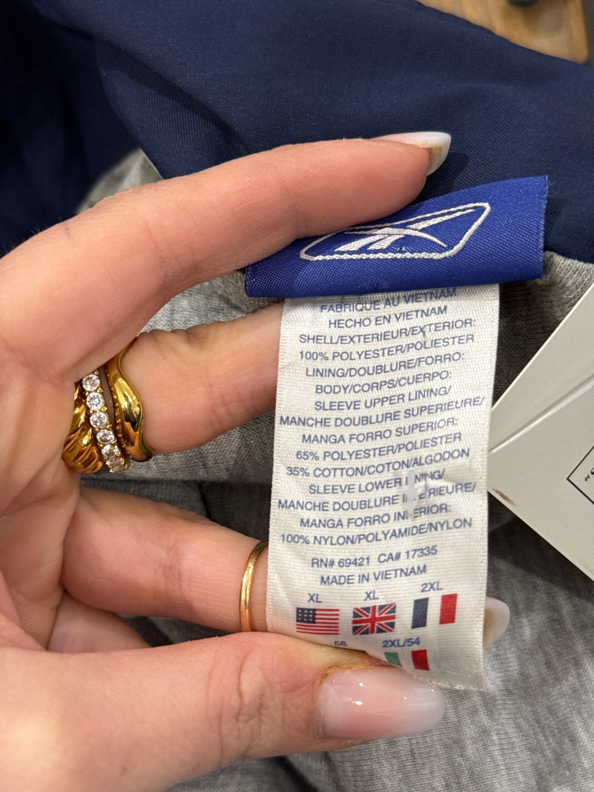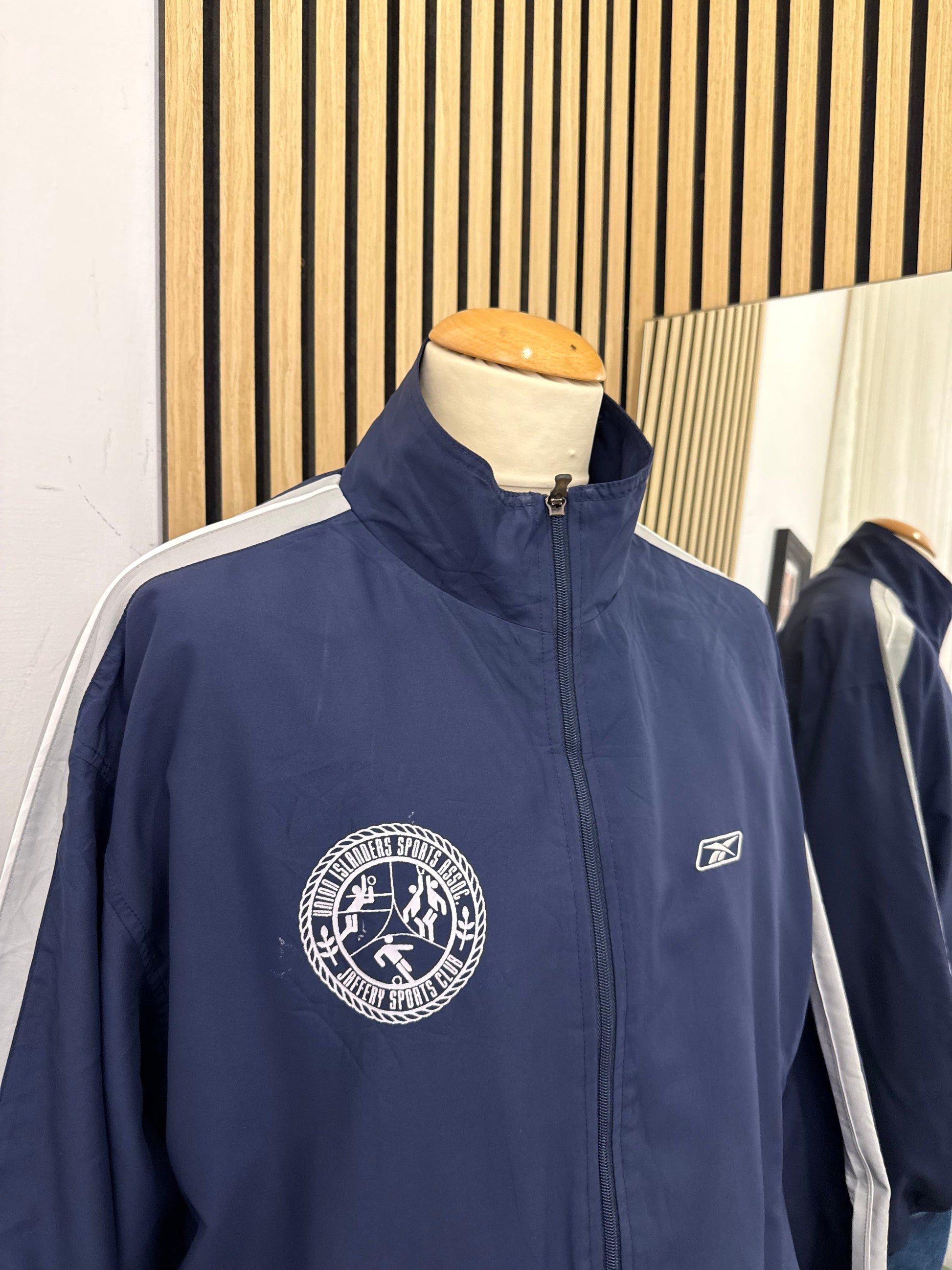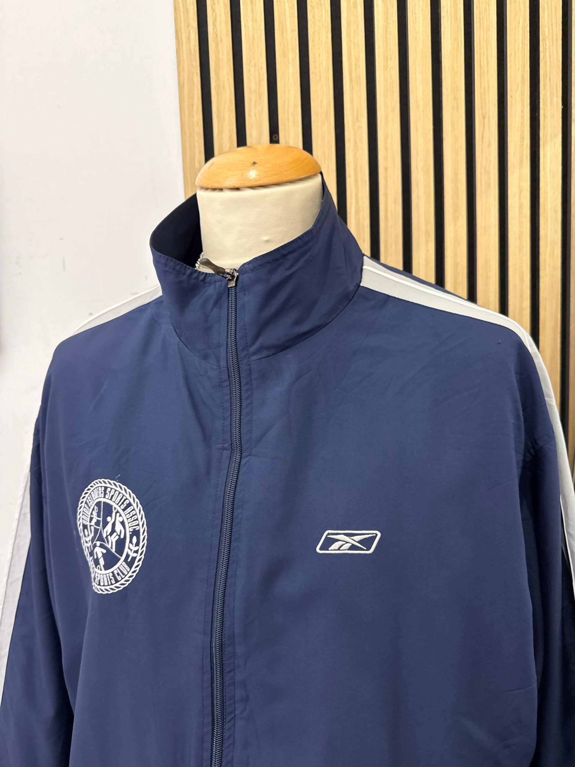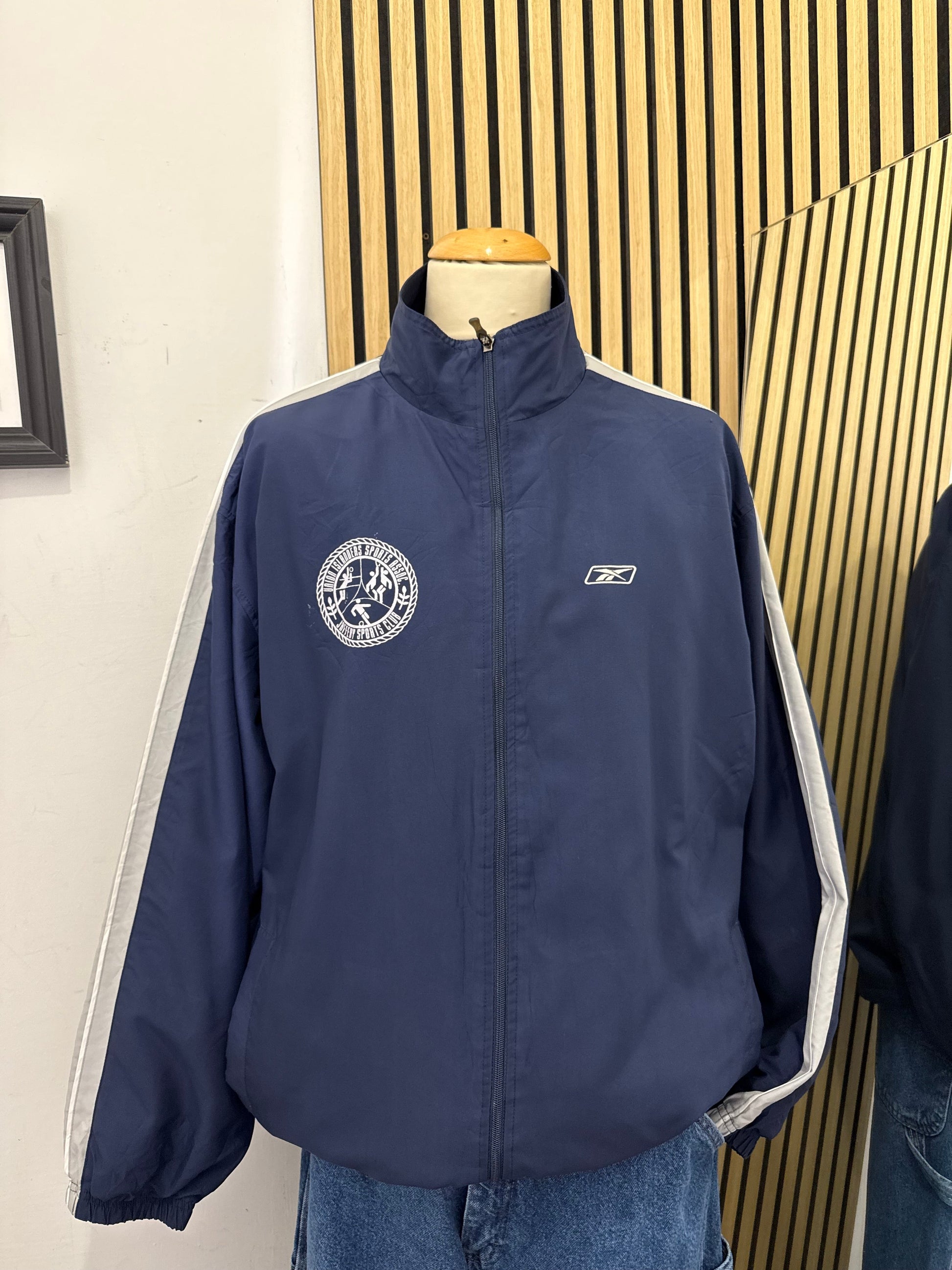 Giacca Reebok vintage anni 2000 in nylon blu navy con strisce bianche laterali e patch ricamata "National Sports Academy", un pezzo unico che unisce sportswear e heritage accademico.