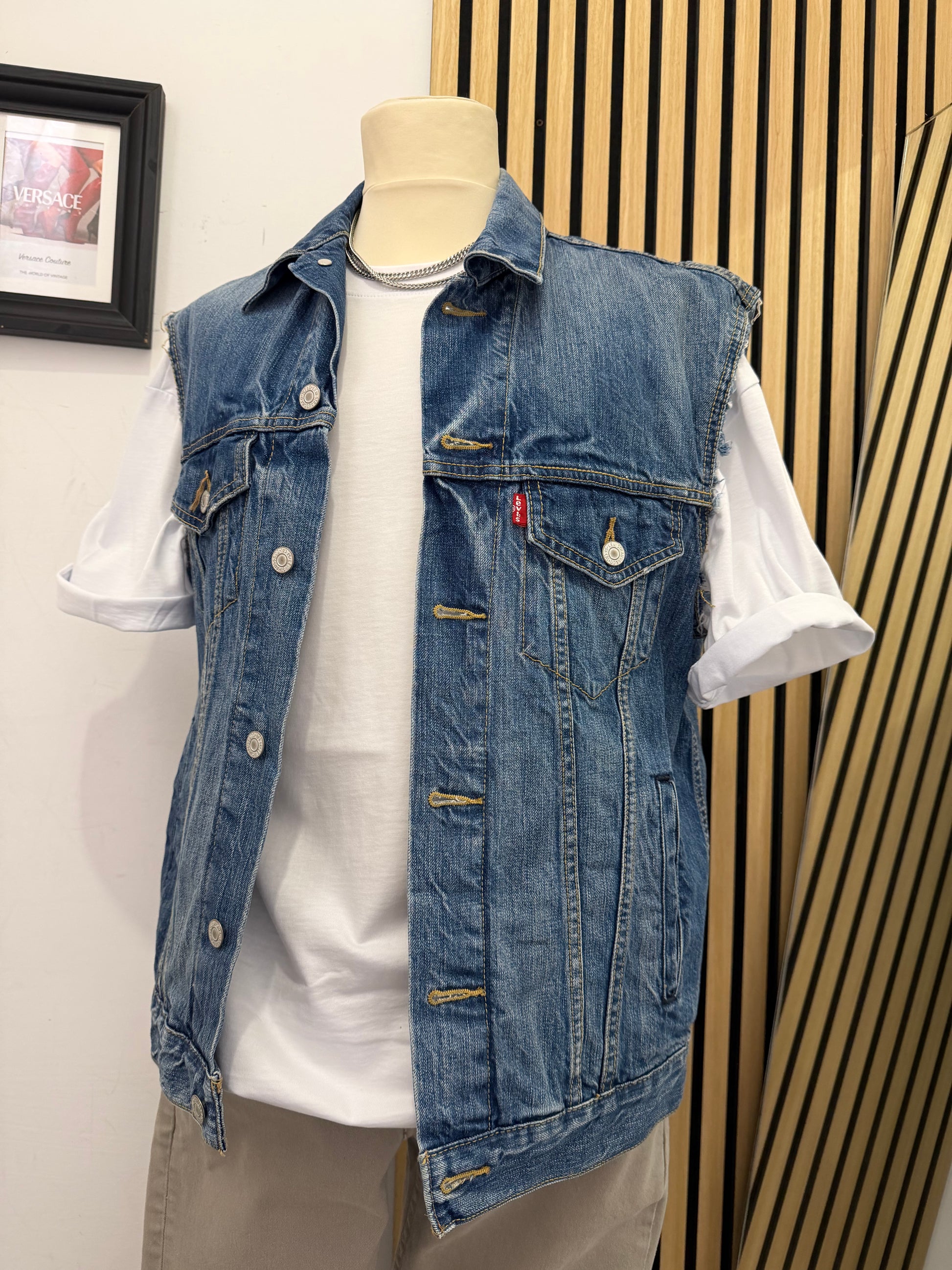 Il gilet in denim per eccellenza: un autentico Levi Strauss & Co. con patch in cuoio originale sul retro e Red Tab sulla tasca. Costruzione classica trucker, denim azzurro medio con fading naturale e cuciture in punto oro — un pezzo senza tempo che non passa mai di moda.