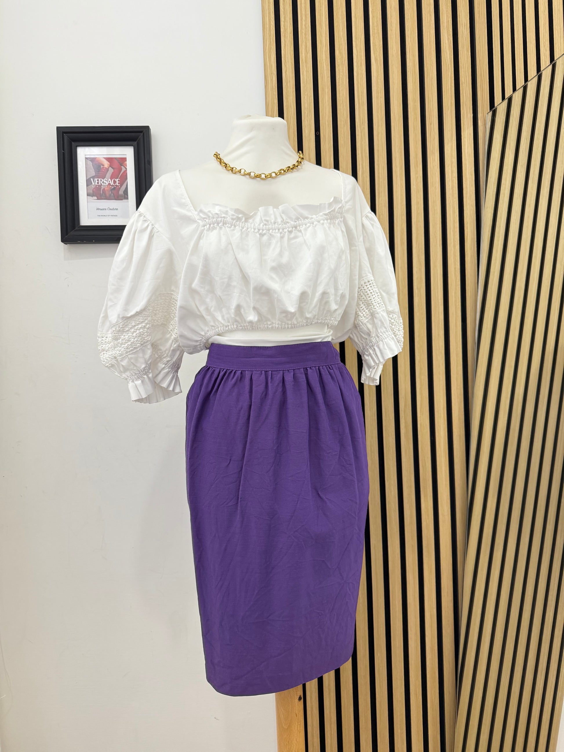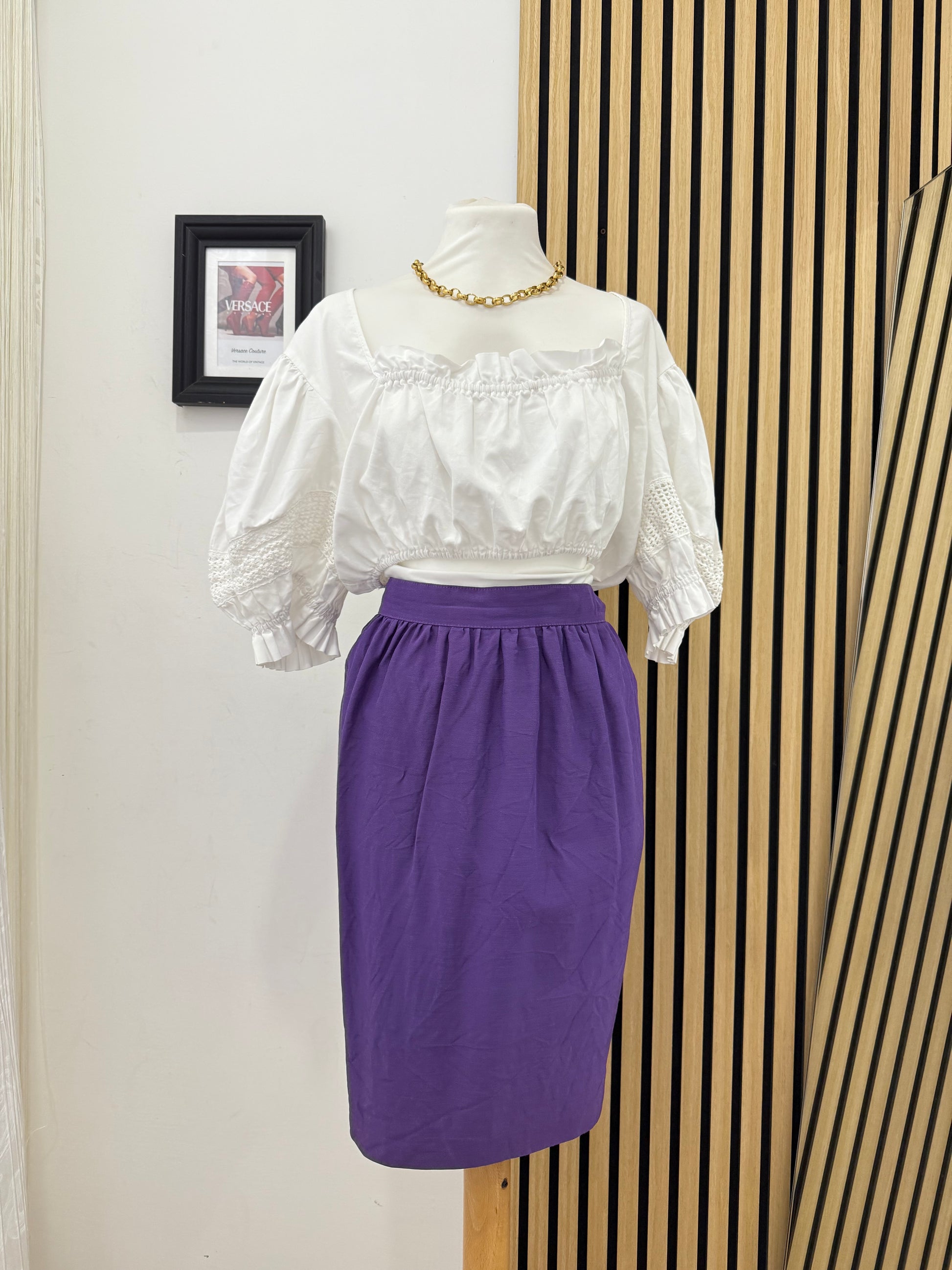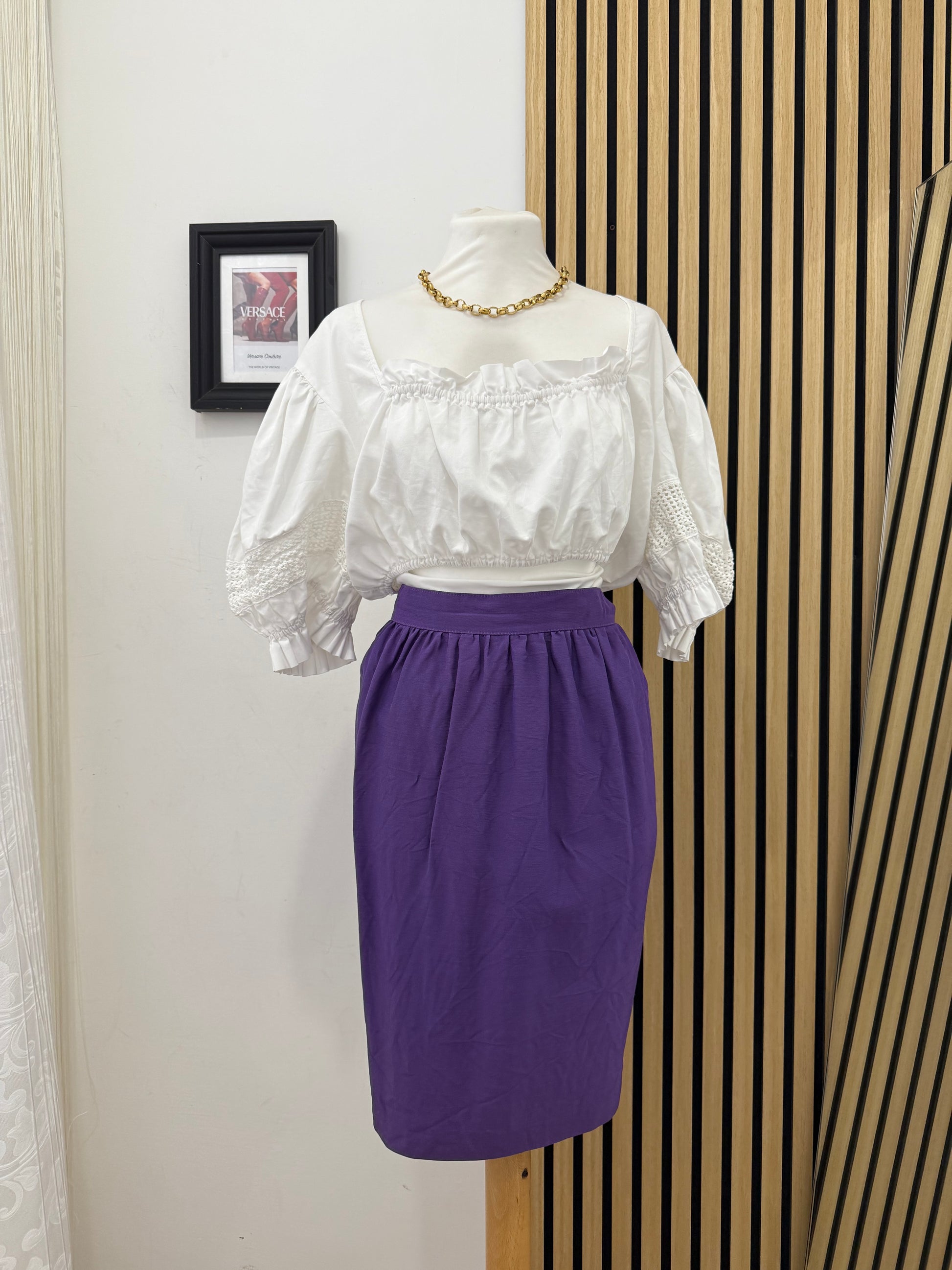 Gonna a tubino con spacco centrale sul retro chiusura con bottoncino e zip sempre sul retro, vita 33 cm da lato a lato e lunghezza 55 cm