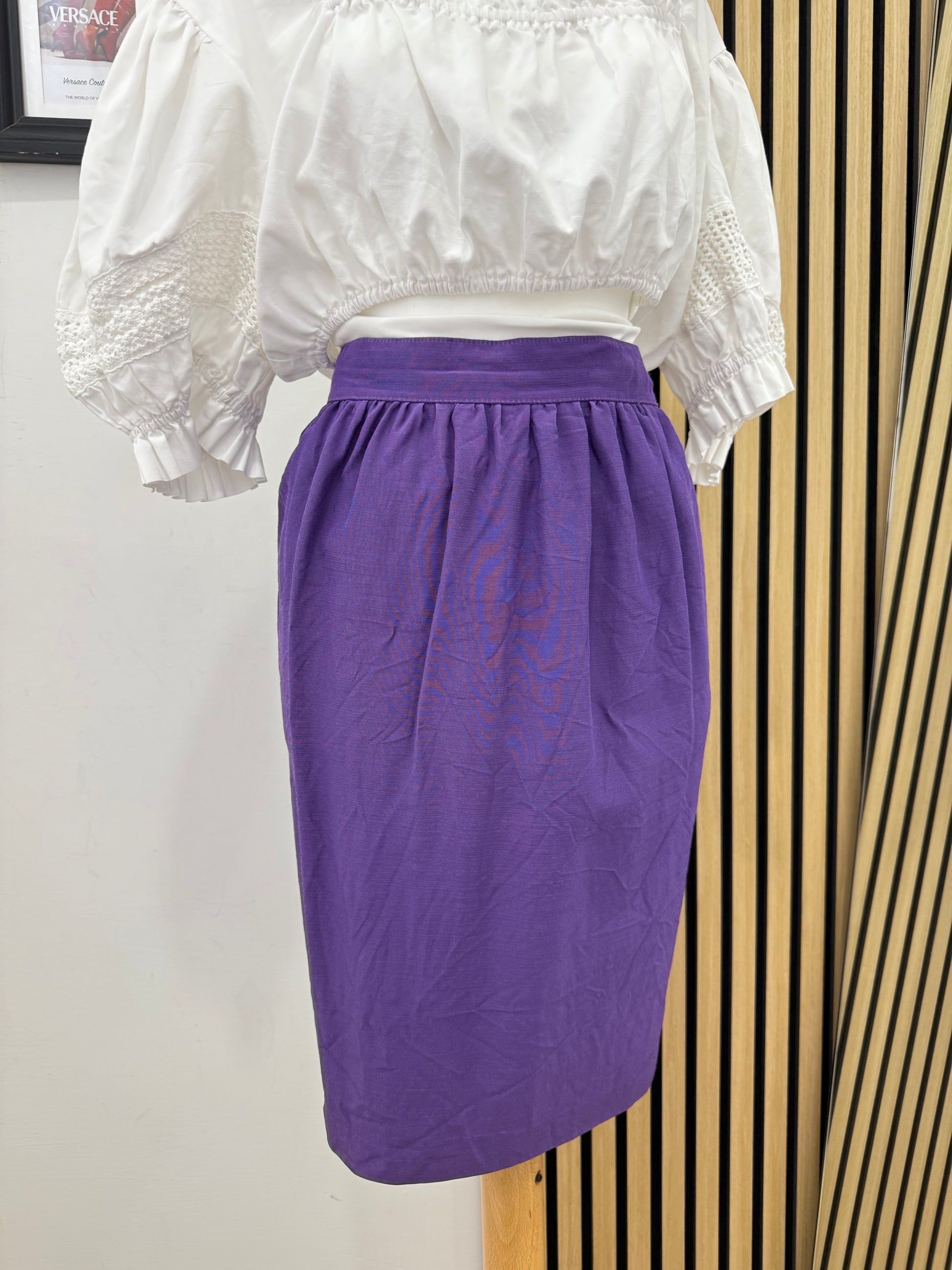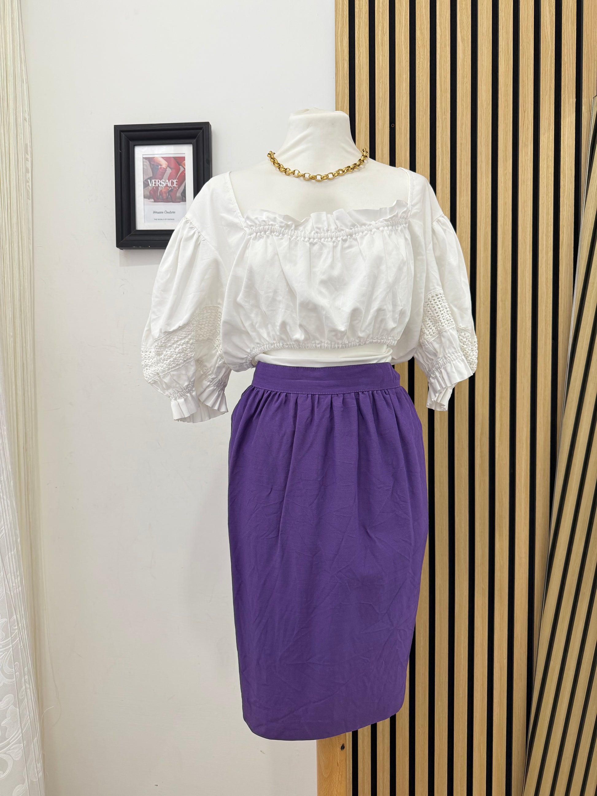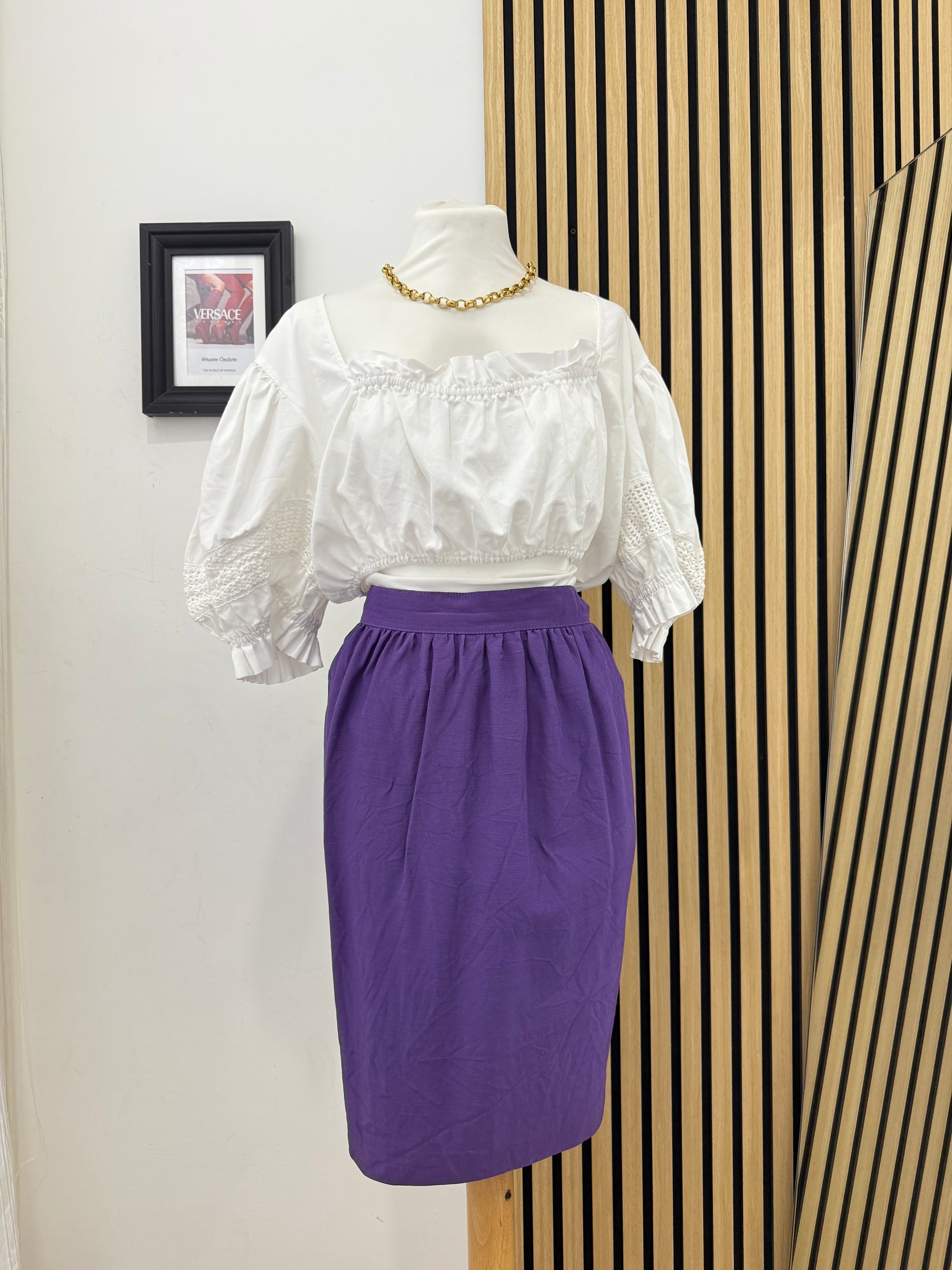 Gonna a tubino con spacco centrale sul retro chiusura con bottoncino e zip sempre sul retro, vita 33 cm da lato a lato e lunghezza 55 cm