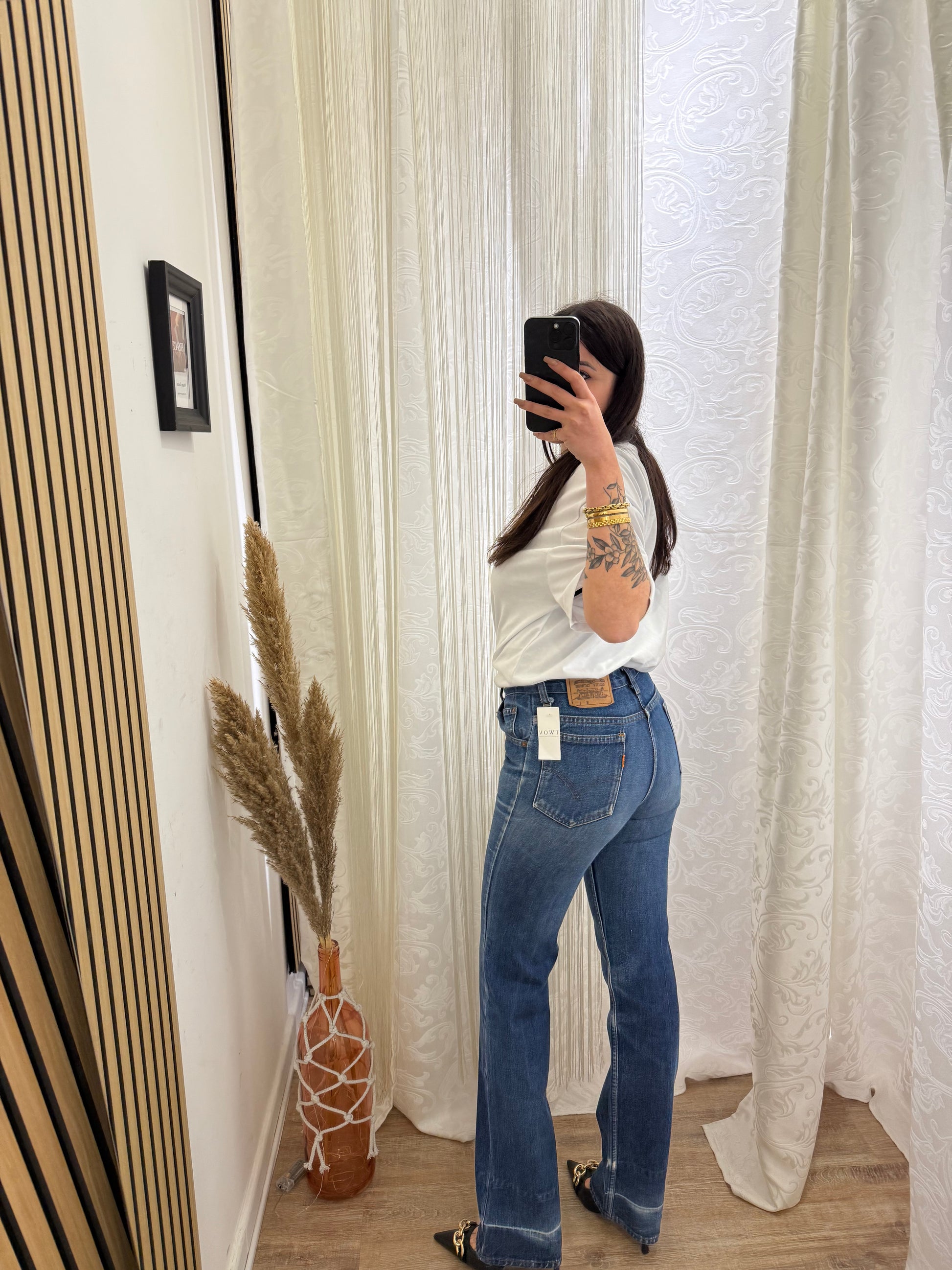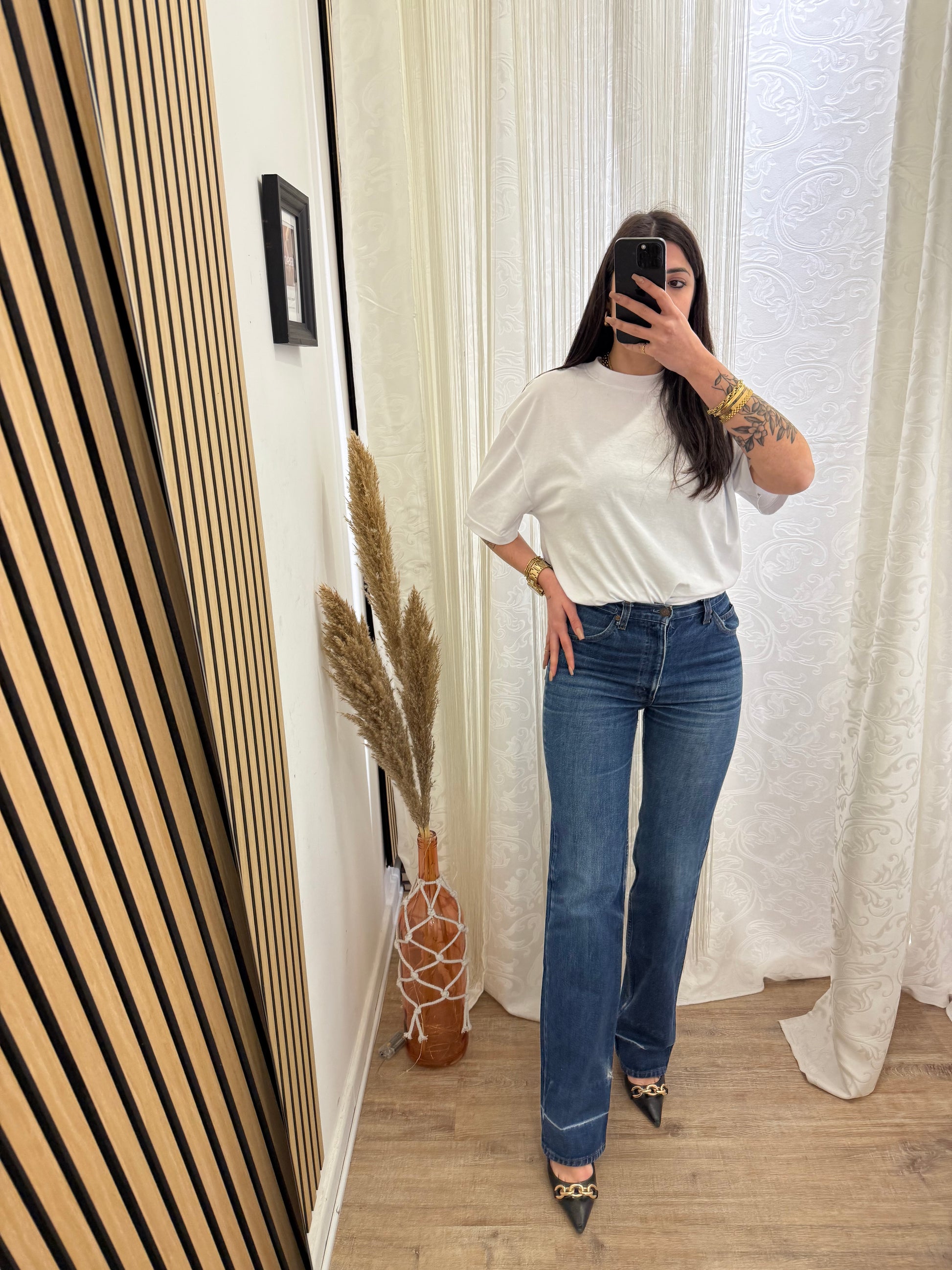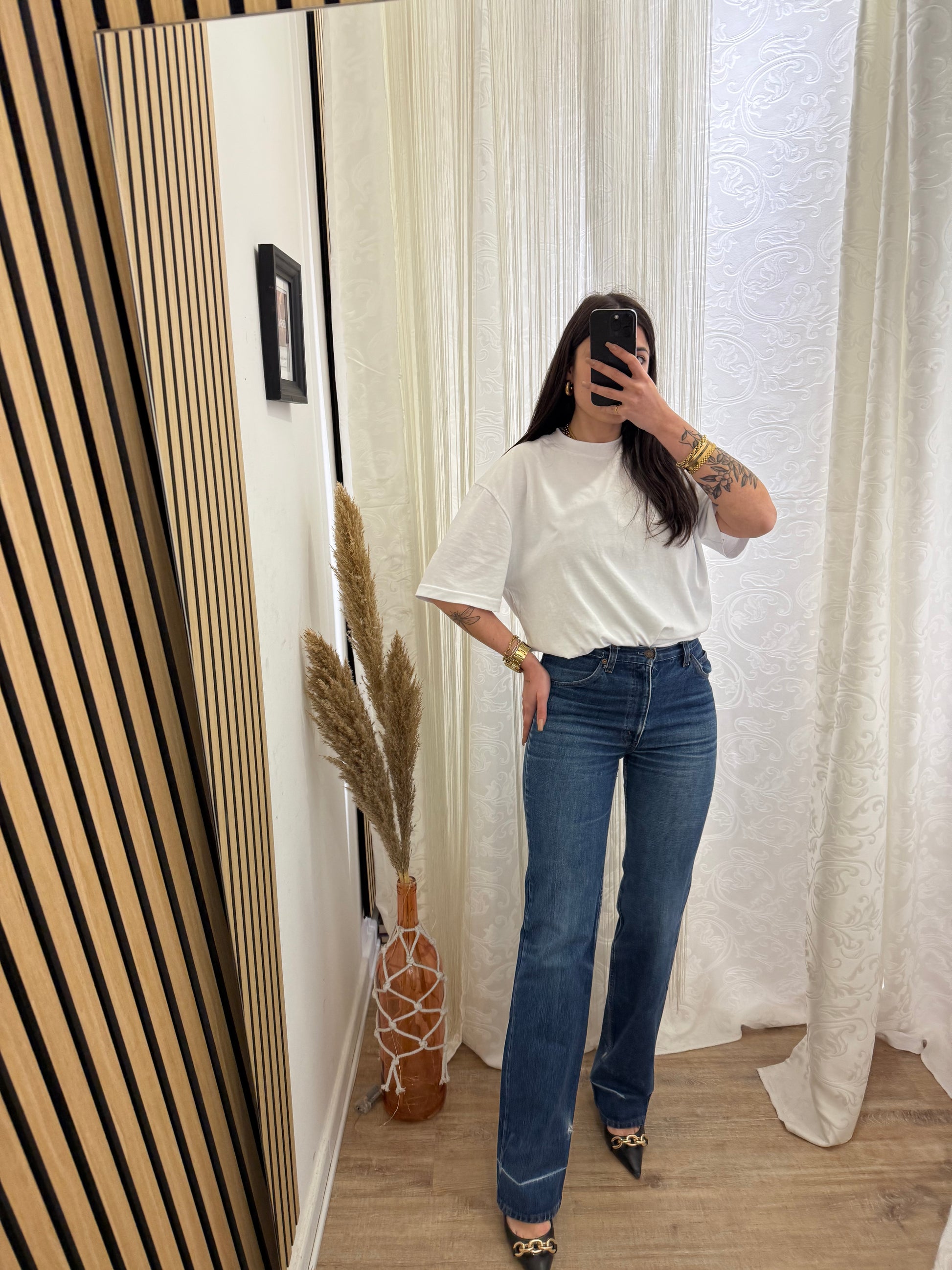 Jeans Levi’s, Vintage vita alta, gamba Dritta, Sulla coscia veste un po’ stretto.