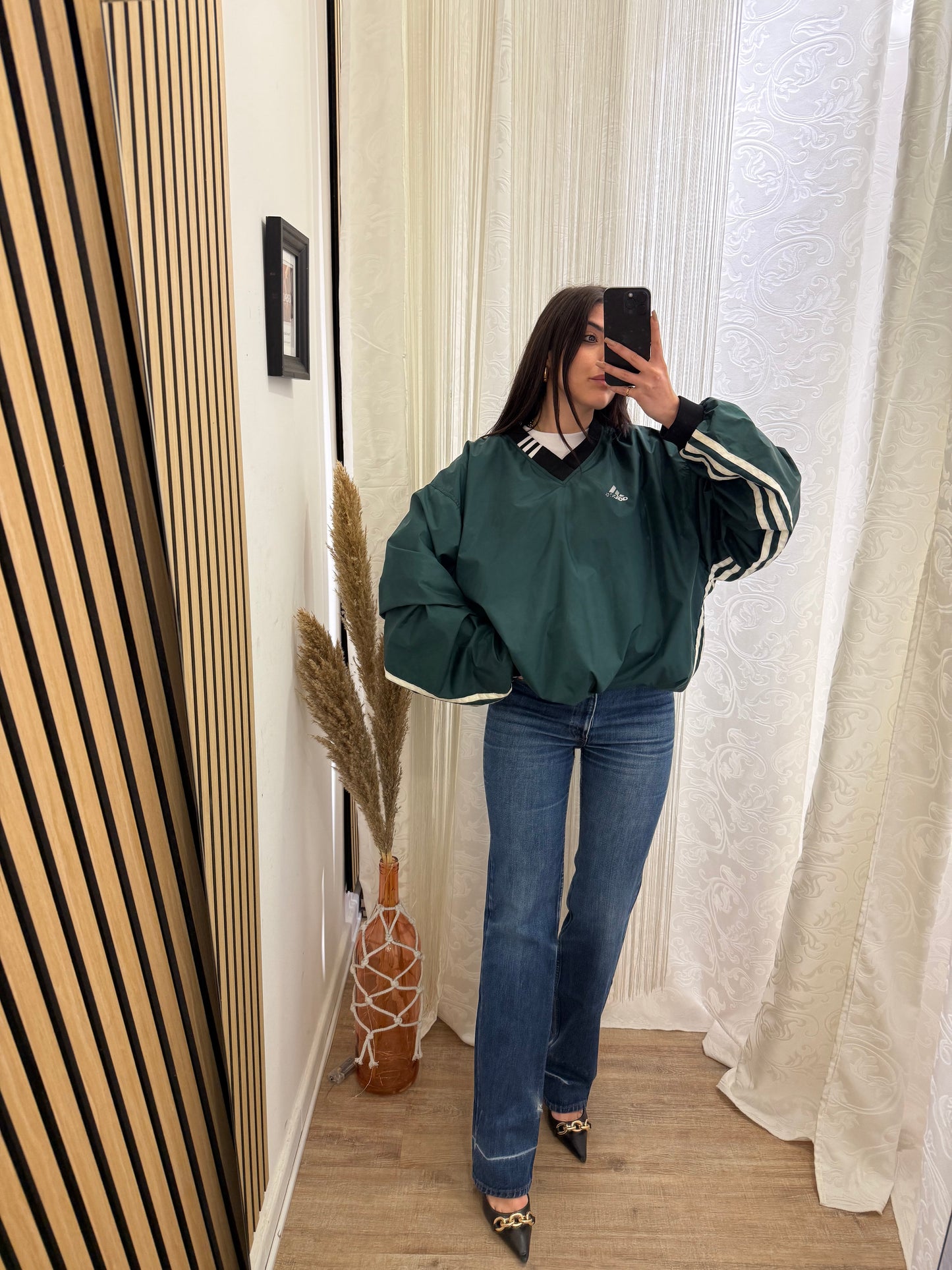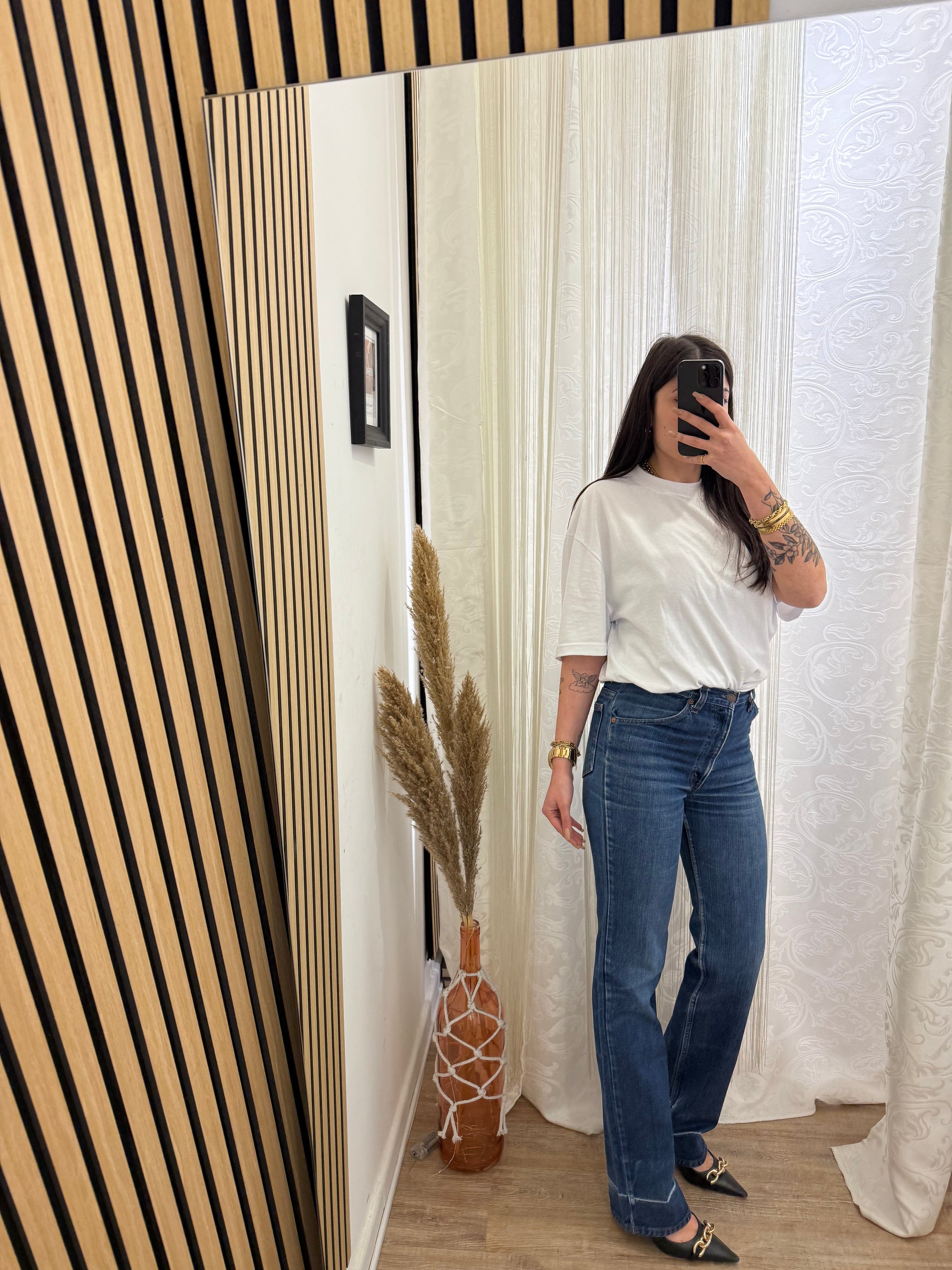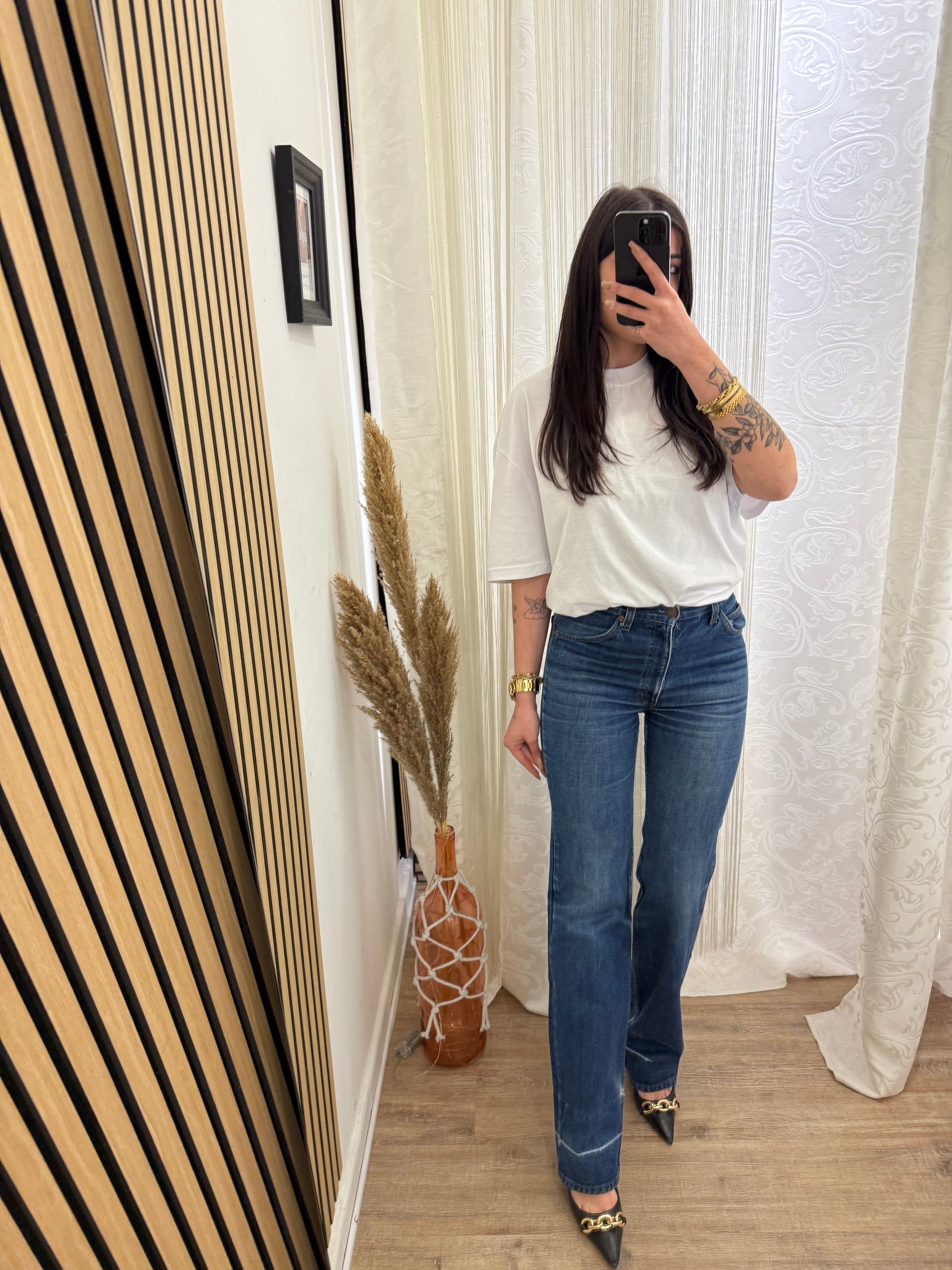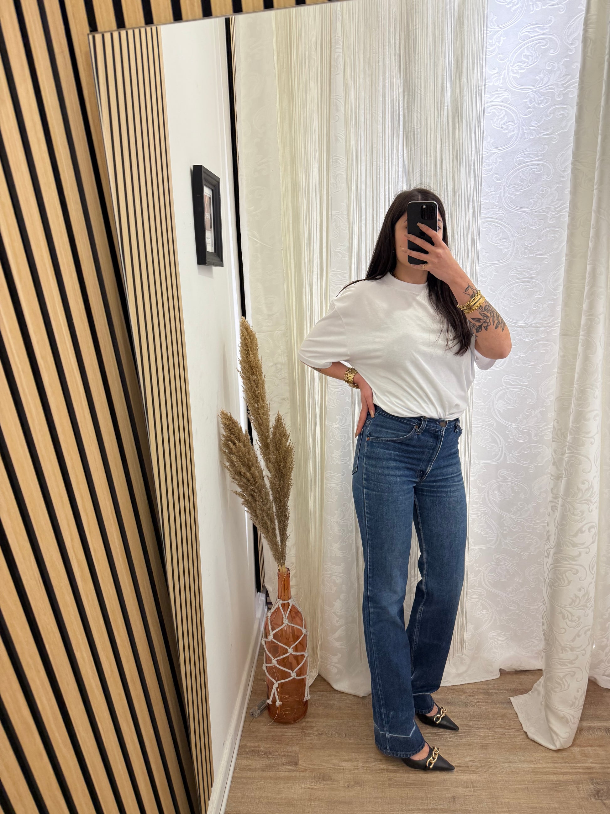 Jeans Levi’s, Vintage vita alta, gamba Dritta, Sulla coscia veste un po’ stretto.