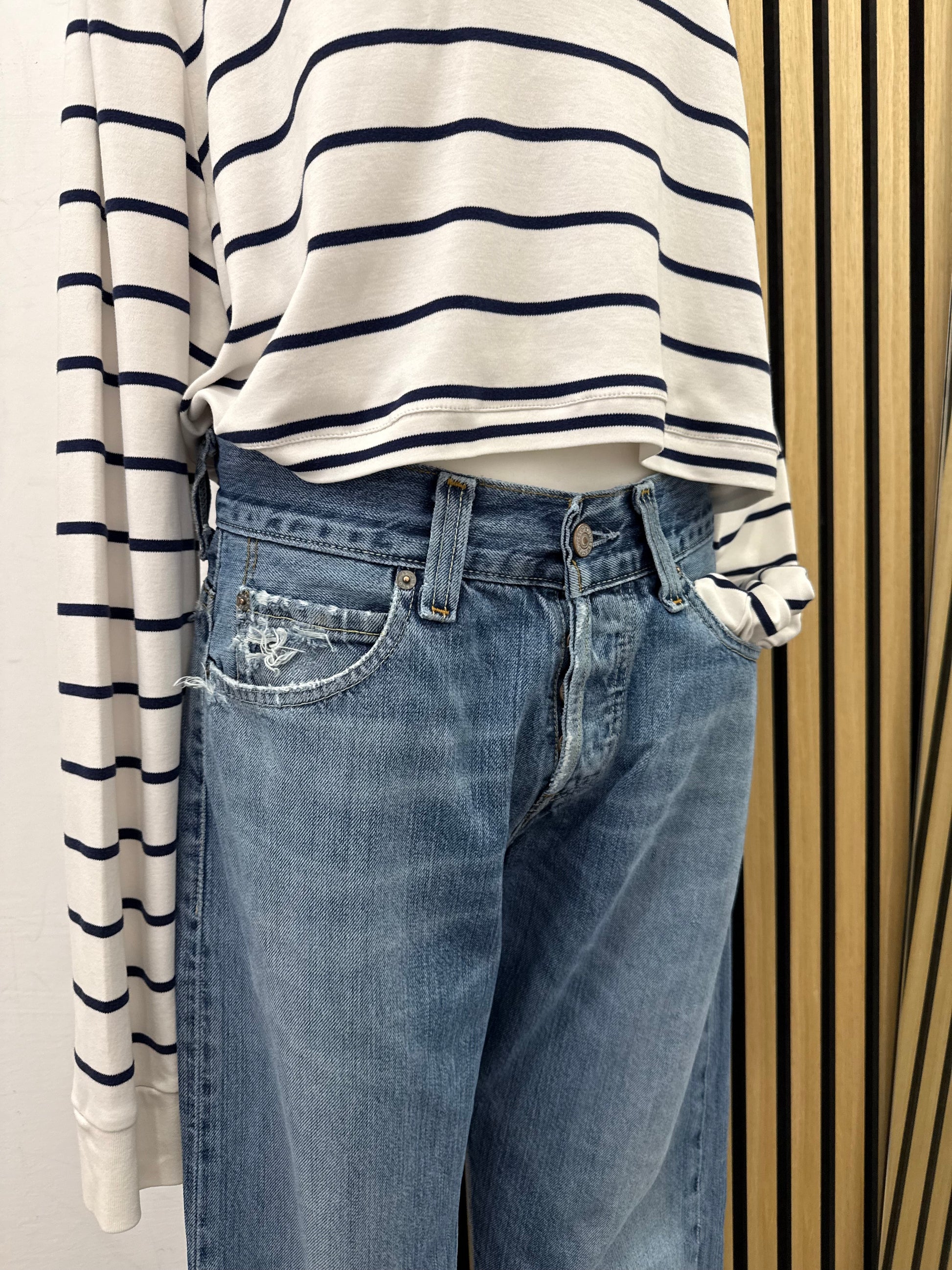 Taglio straight leg dal fit rilassato, vita media, orlo raw con effetto sfrangiato per un look autentico e contemporaneo. Perfetto da abbinare a maglie a righe marinière, felpe vintage o giacche heritage per un outfit dal gusto ricercato.