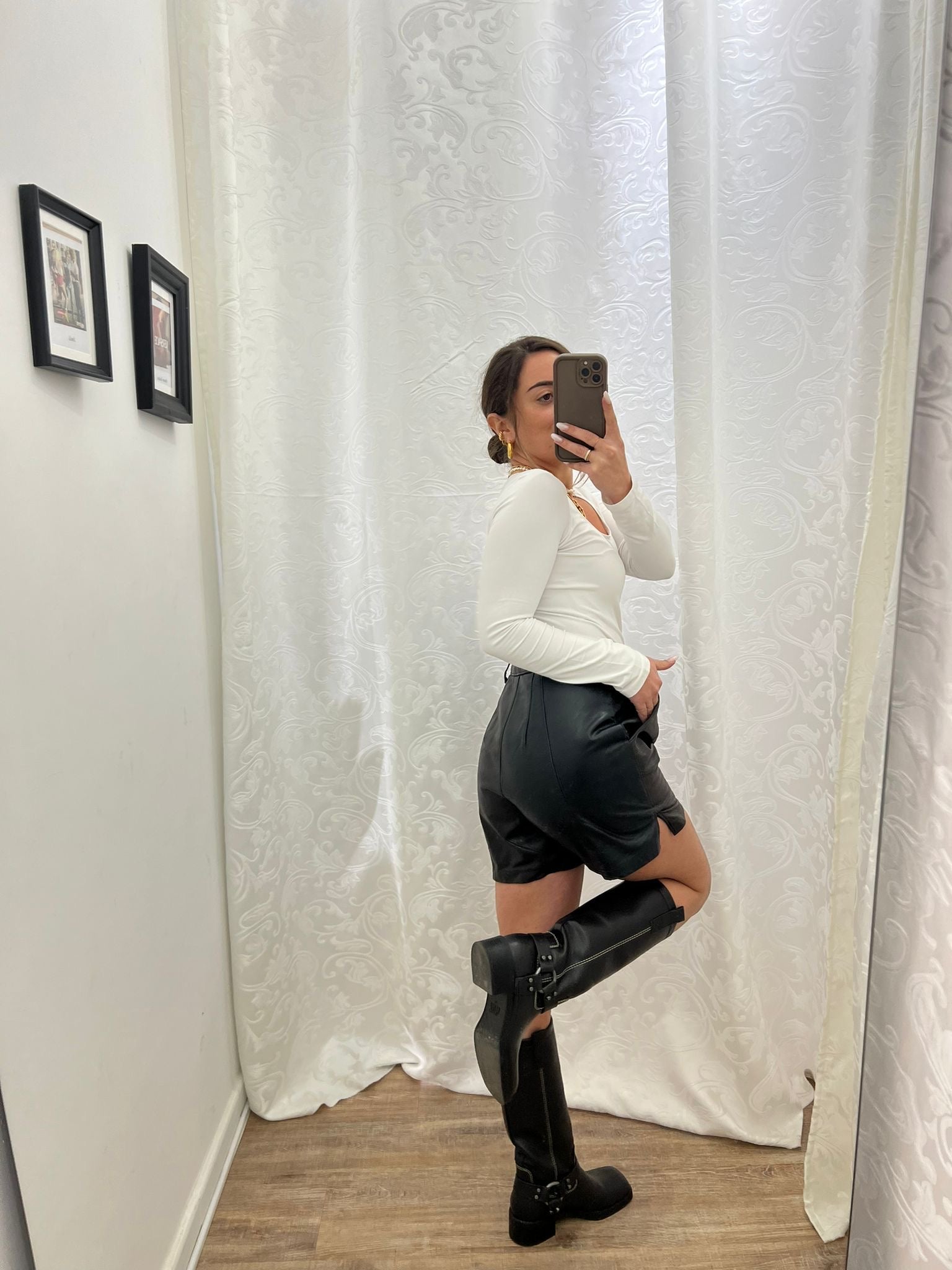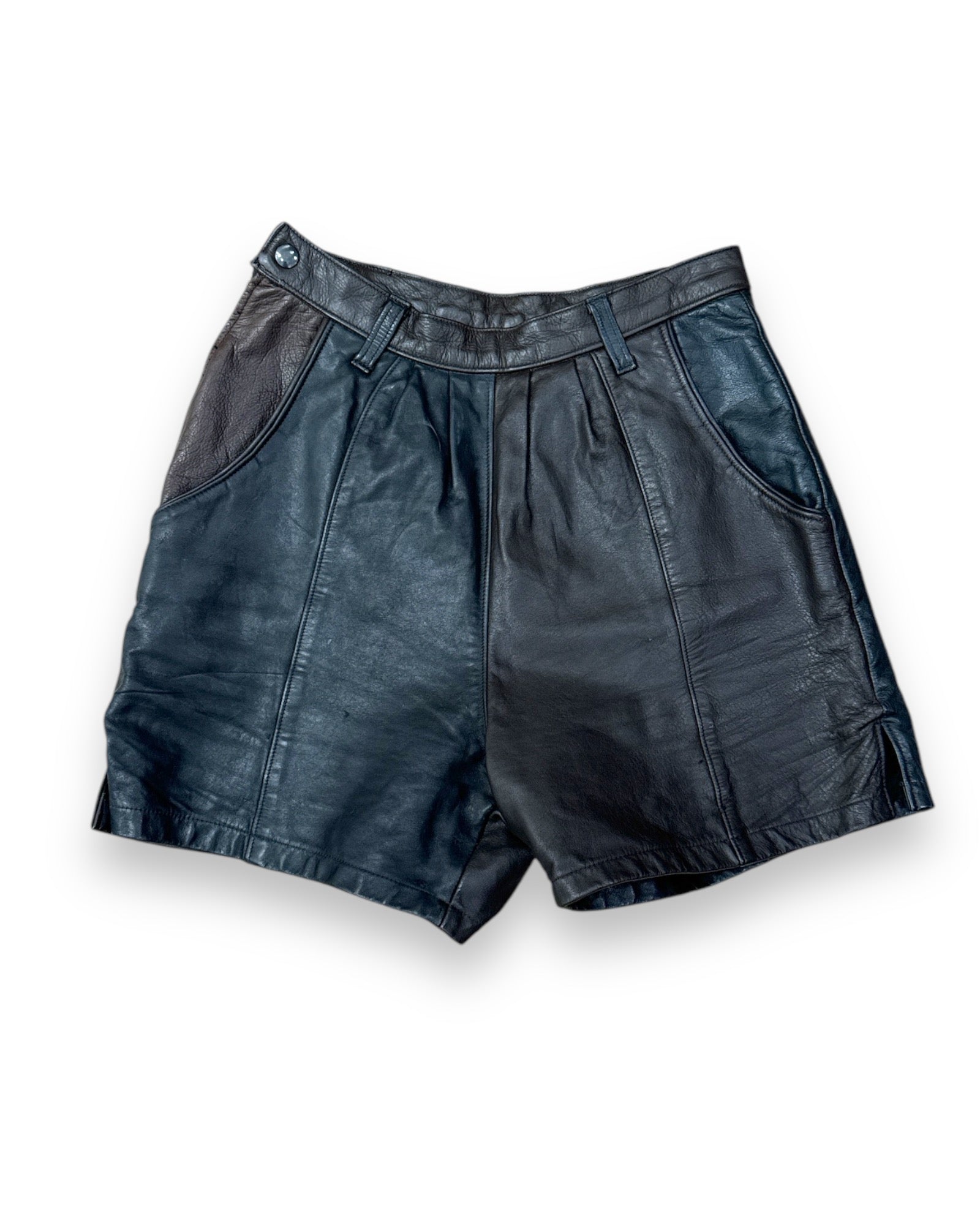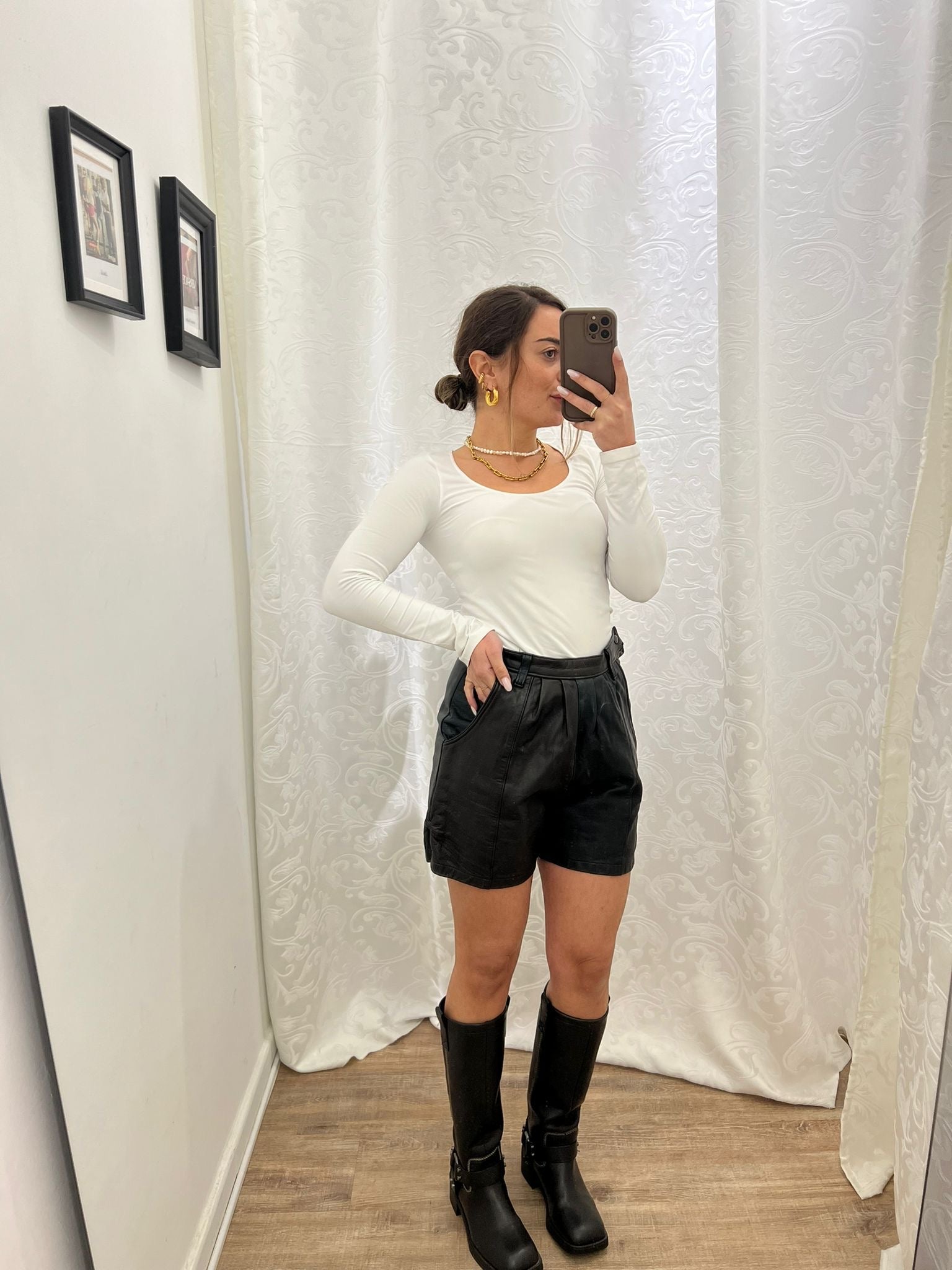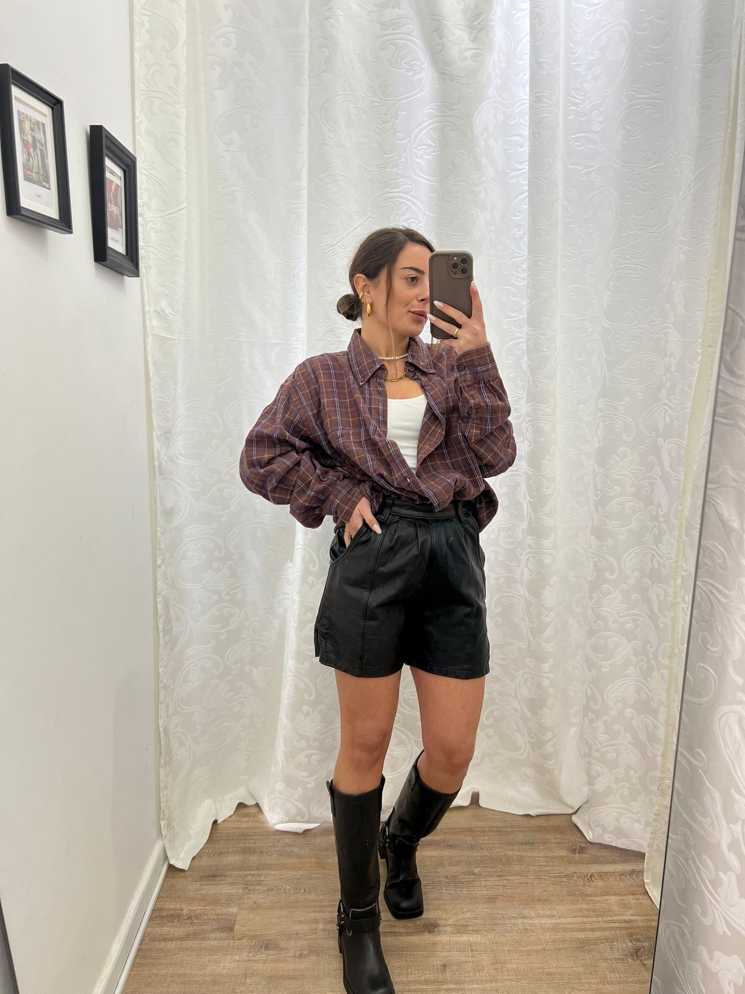 Pantaloncini in pelle nero con dettagli marroni, vita alta Chiusura con zip al lato.
