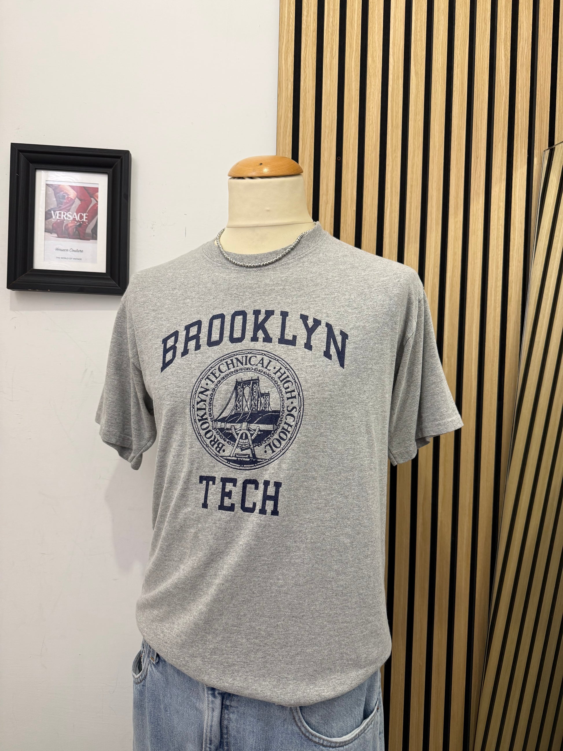 Autentica t-shirt Champion in grigio mélange con grafica del Brooklyn Technical High School. Logo istituzionale con il ponte di Brooklyn e scritta "BROOKLYN TECH" in caratteri college blu navy.