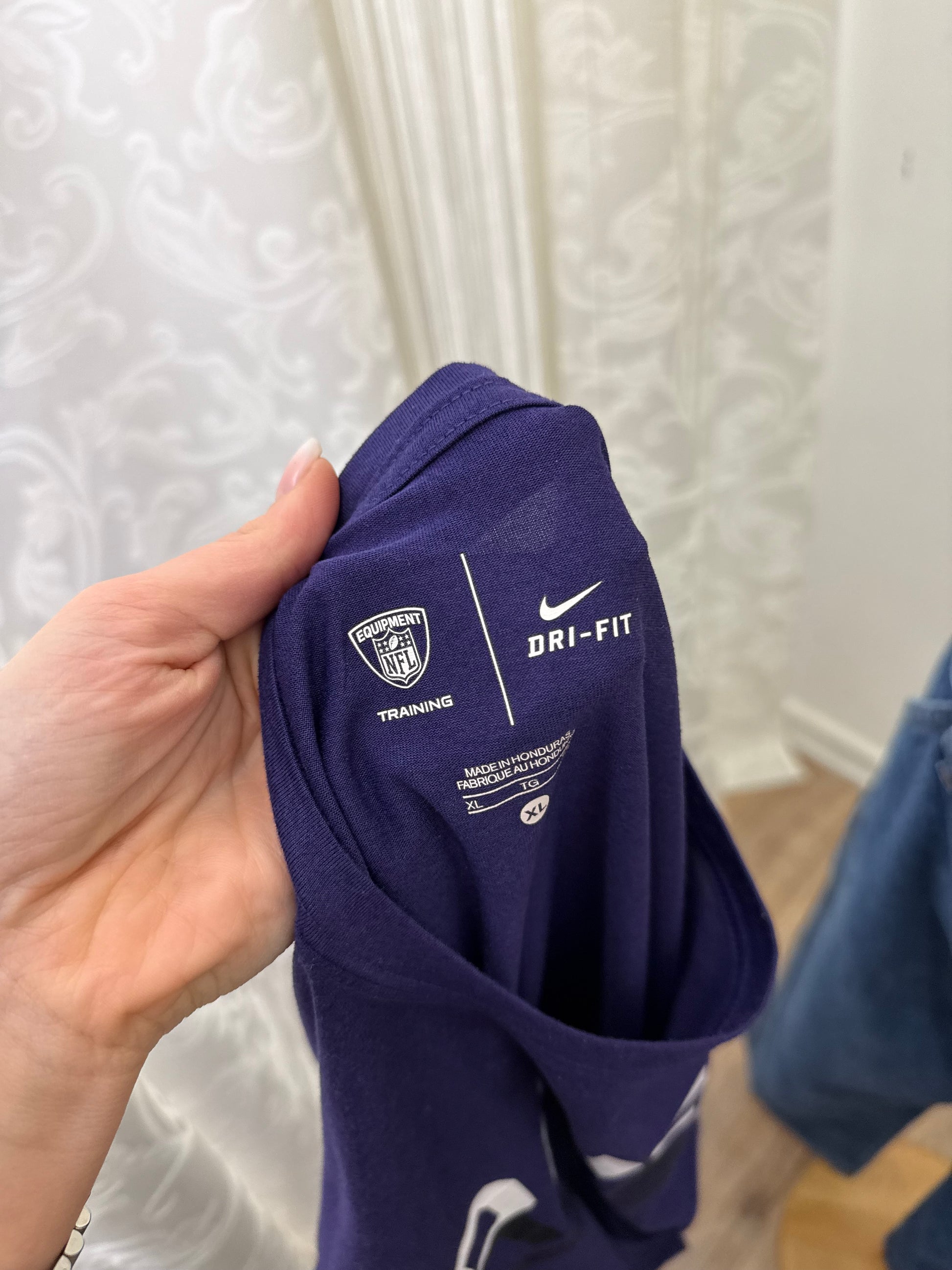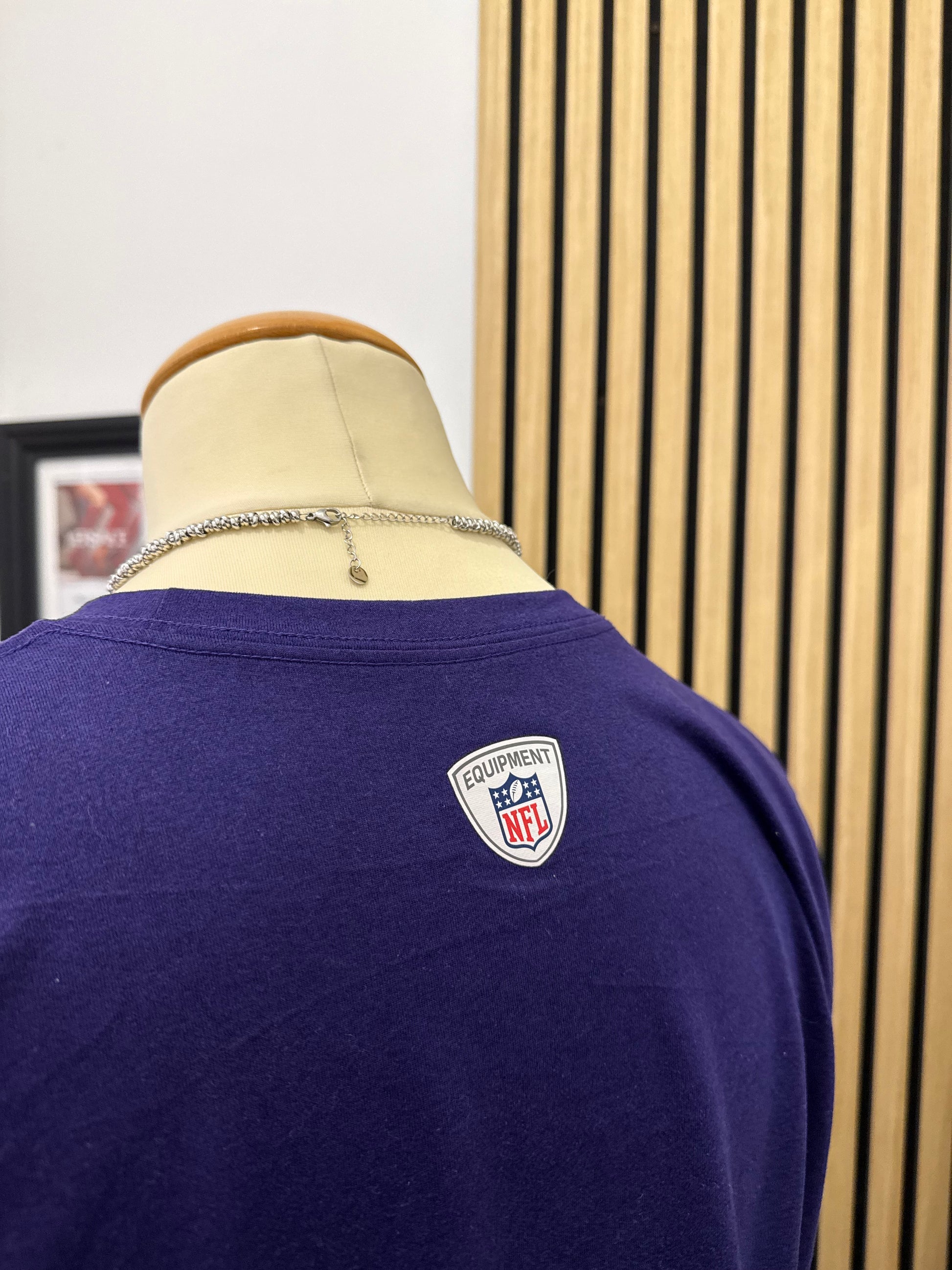 Il design presenta la scritta "RAVENS" in caratteri bold bianchi al centro, il logo iconico del corvo sulla spalla sinistra e lo swoosh Nike sulla manica. Etichetta interna "NFL Equipment Training" che certifica l'autenticità del capo utilizzato per gli allenamenti ufficiali della squadra. Tessuto tecnico Dri-FIT che garantisce gestione dell'umidità e asciugatura rapida.