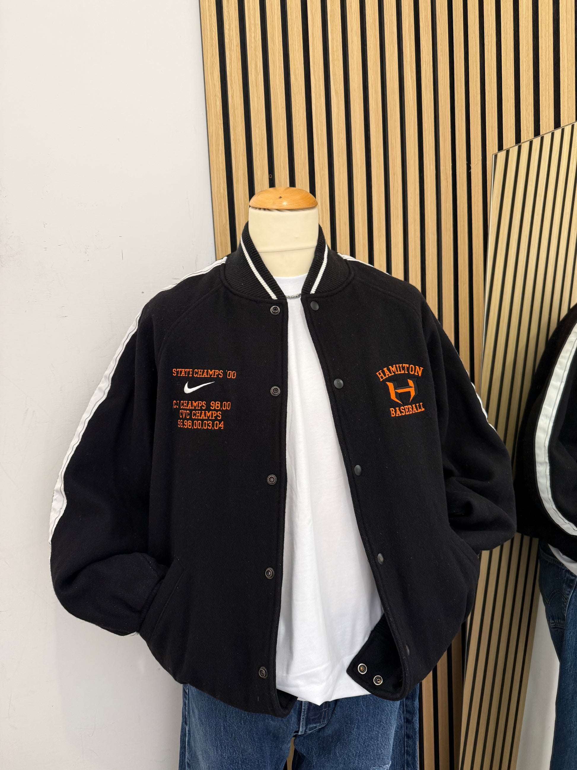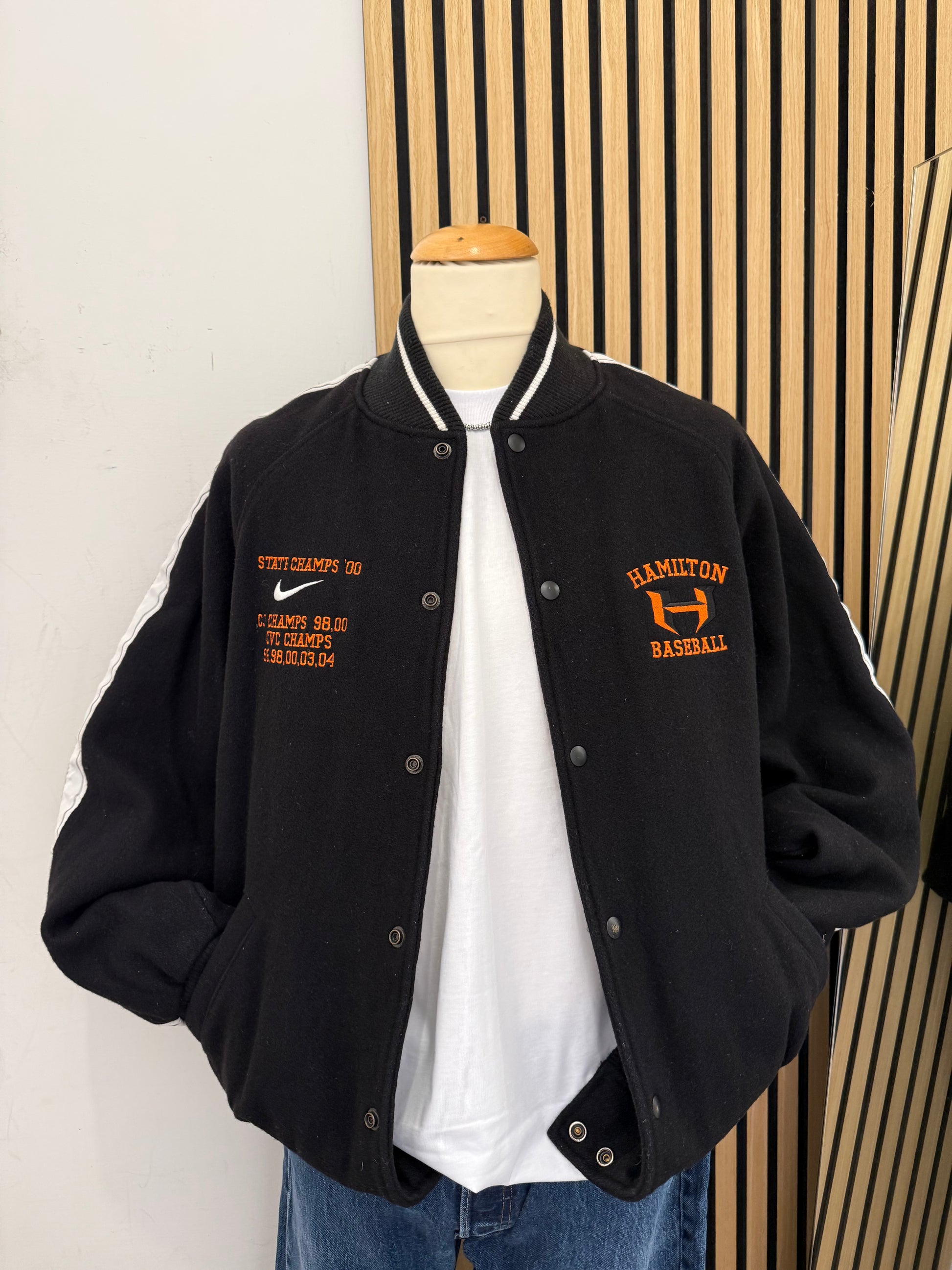 Autentica giacca varsity Nike Hamilton Baseball degli anni 2000, un pezzo da collezione che celebra i successi sportivi della squadra. Realizzata in Canada, questa bomber presenta ricami arancioni su fondo nero con dettagli delle vittorie: "State Champs '00", "CJ Champs 9B,00", "CVC Champs 96,9B,00,03,04".