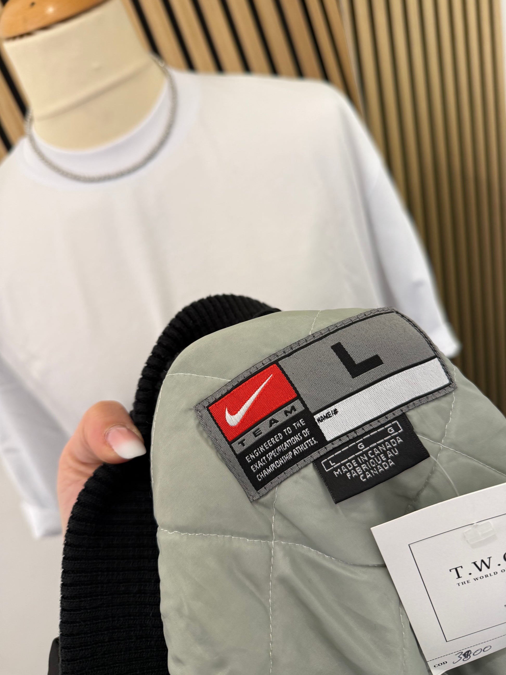 Fodera interna trapuntata grigia per comfort e calore, tasche laterali pratiche. Costruzione robusta tipica dell'abbigliamento sportivo Nike di qualità.
