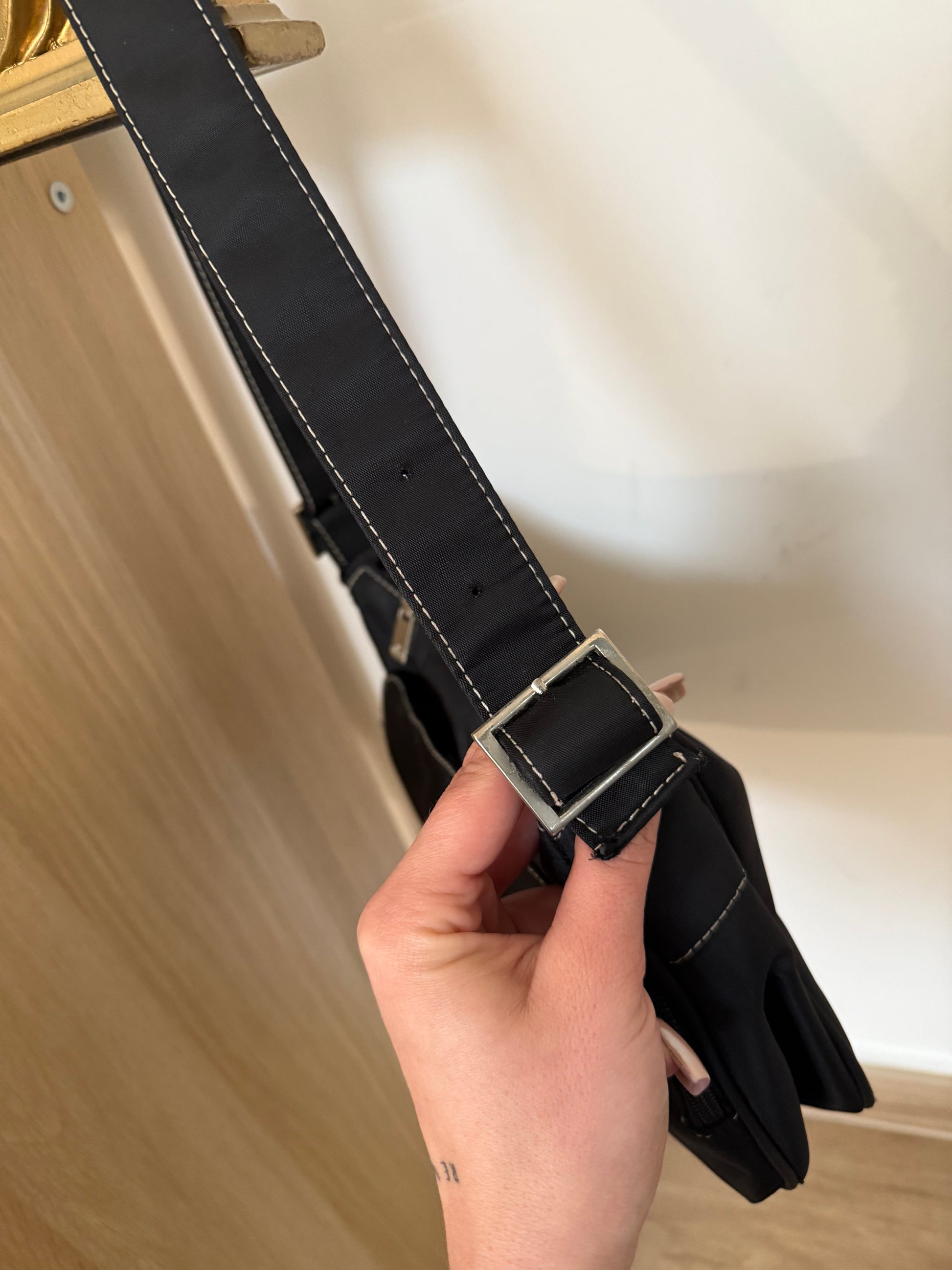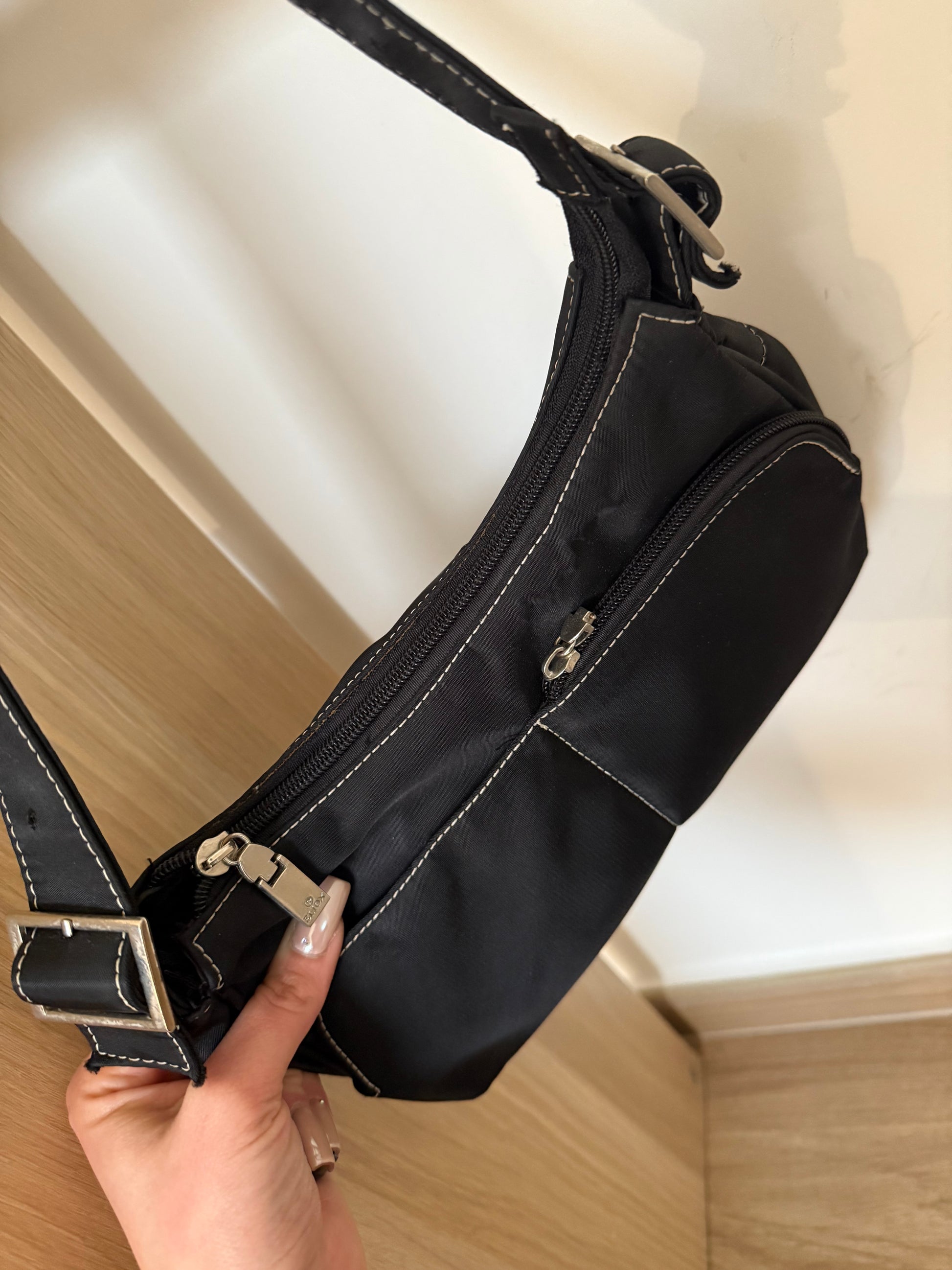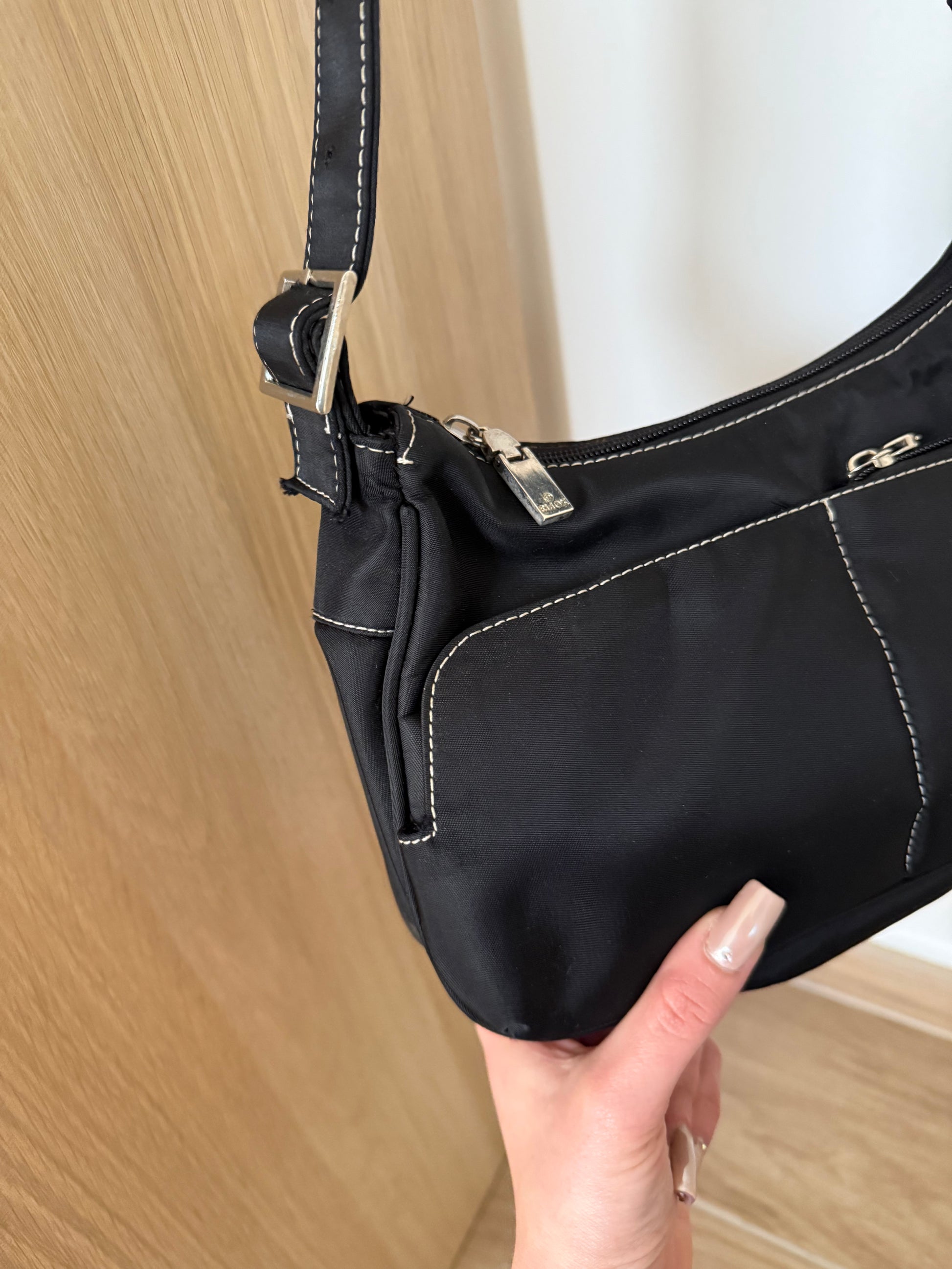Borsa vintage a spalle, con manico regolabile e cuciture bianche a contrasto, in tessuto impermeabile