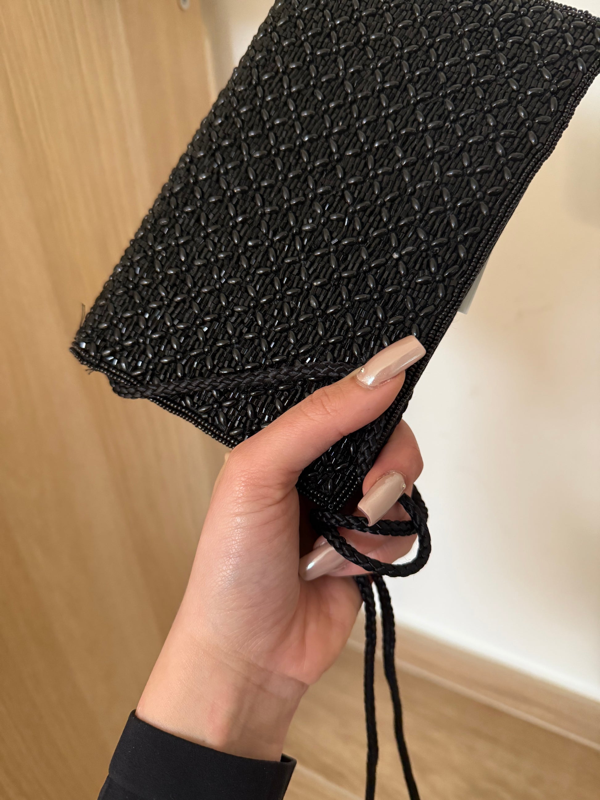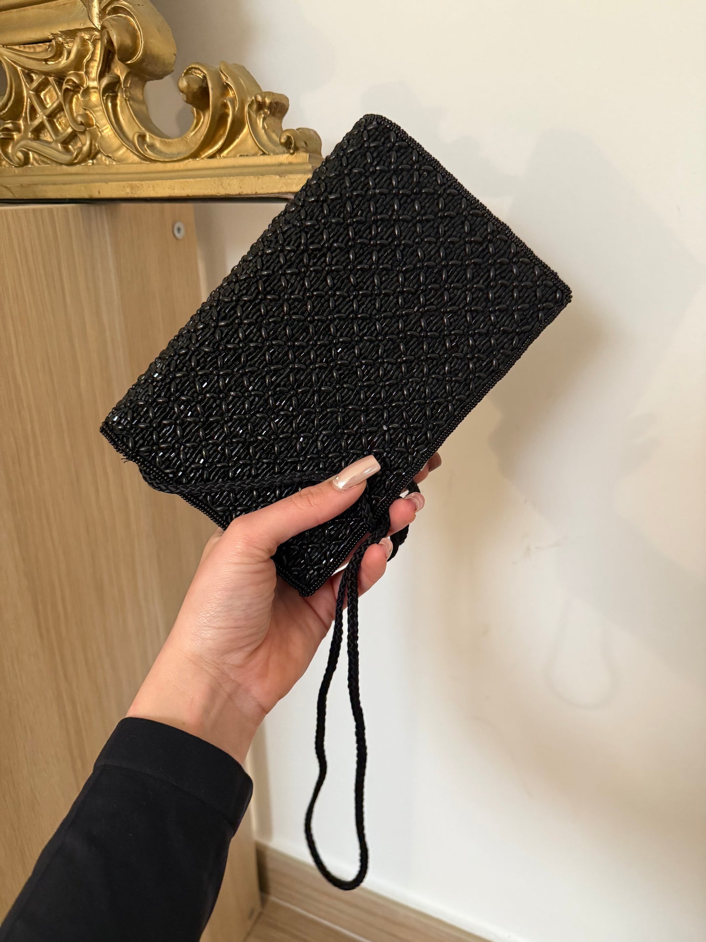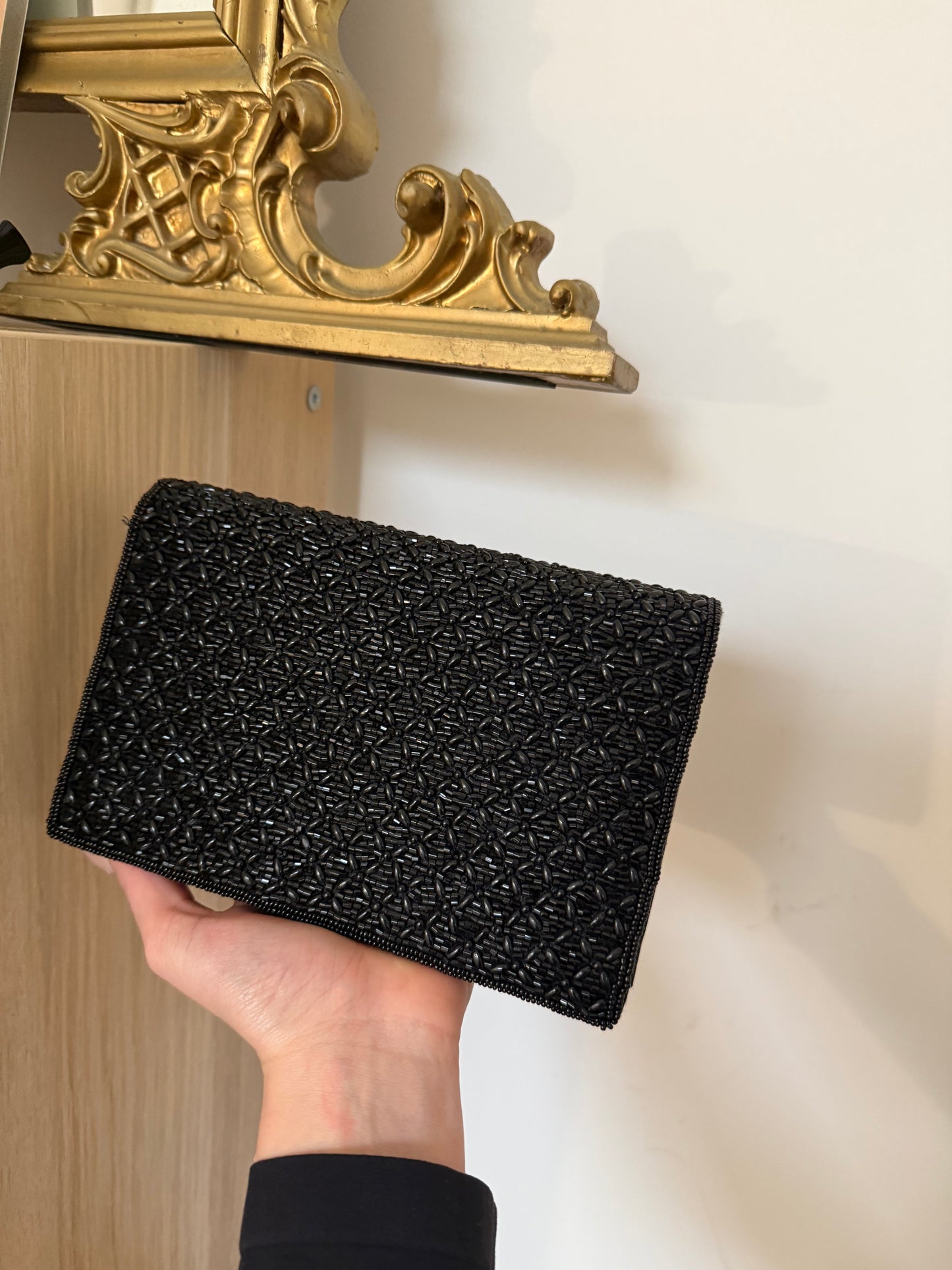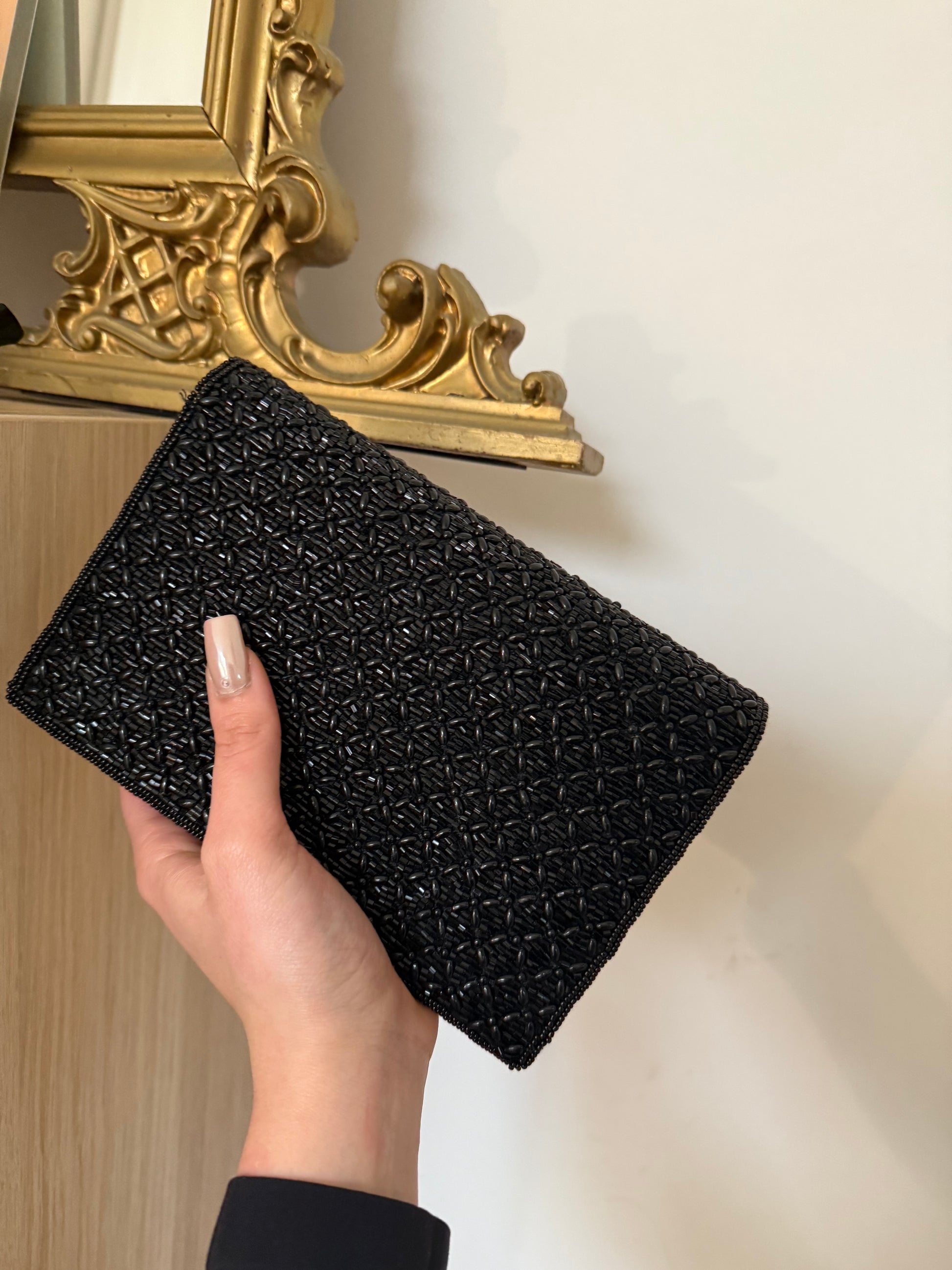 Borsetta vintage con tracolla, impreziosita da fantastiche perline tono su tono.