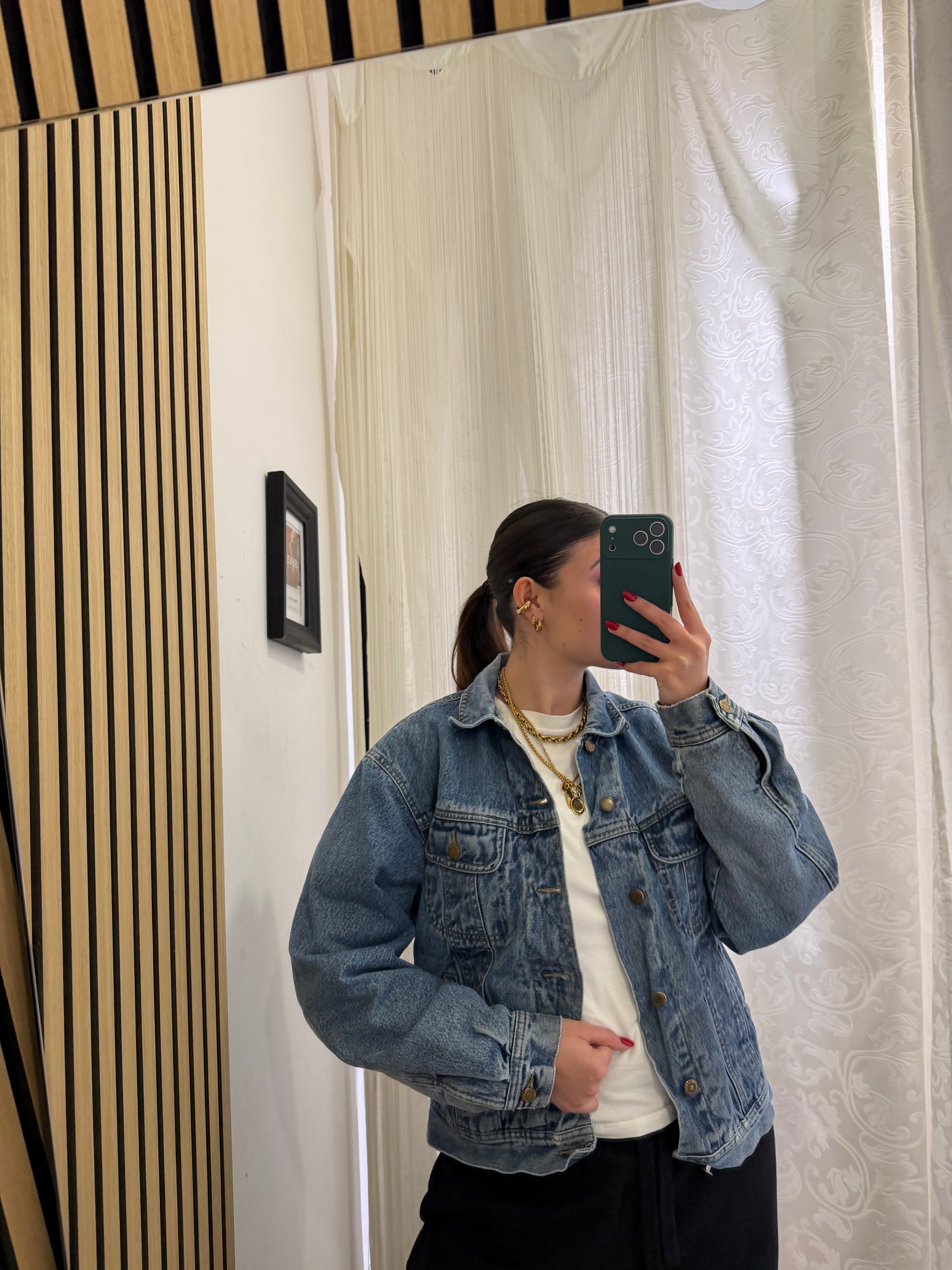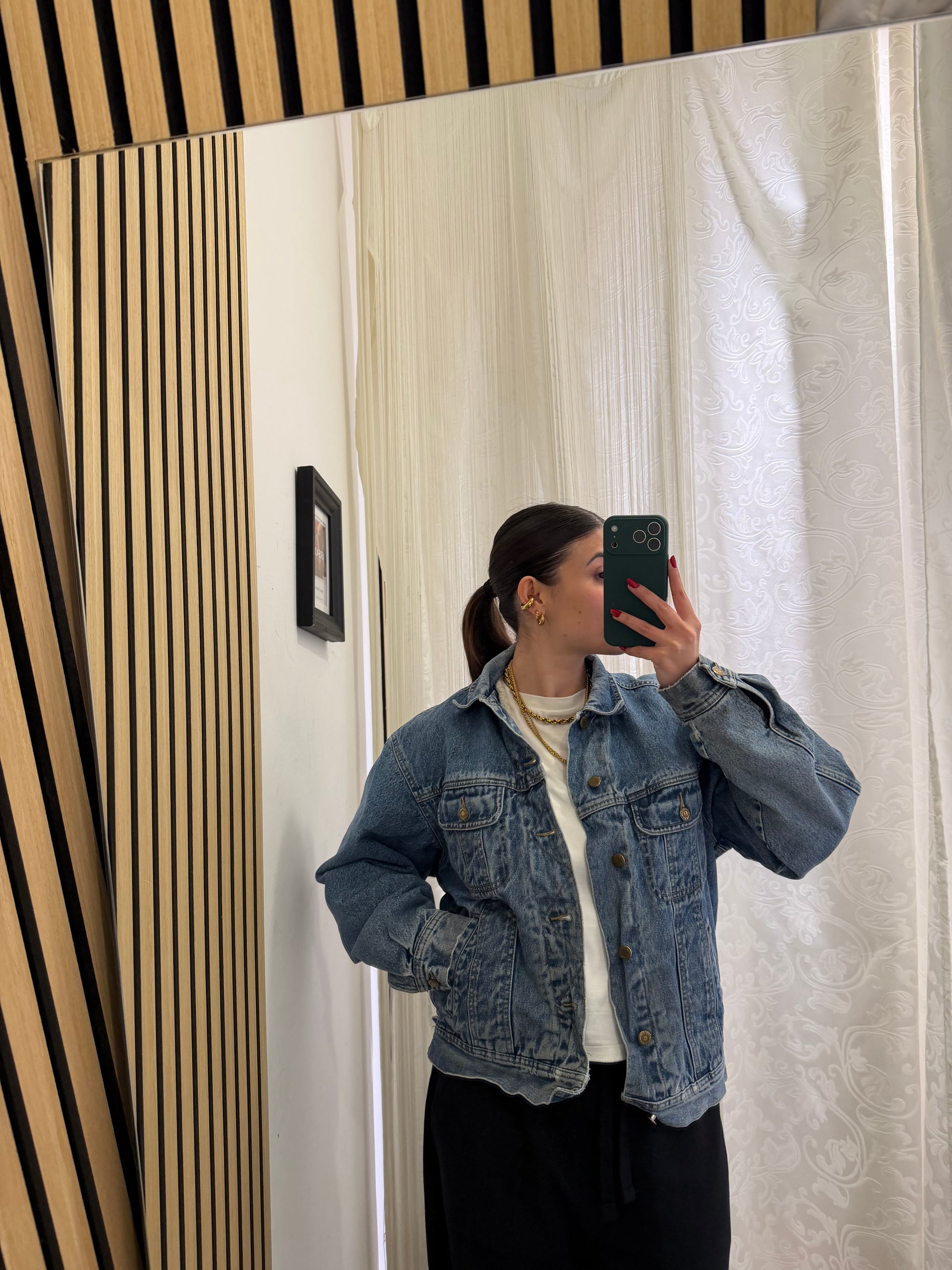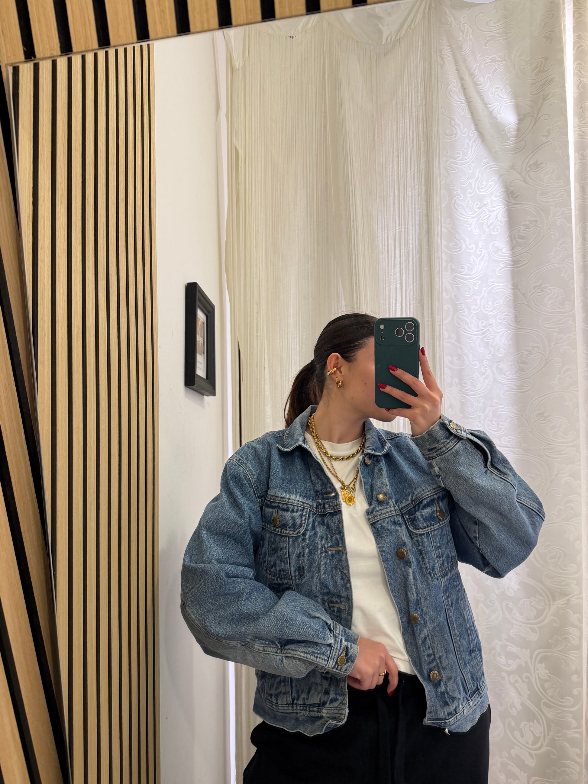 Il taglio è oversize e unisex, perfetto sia su uomo che su donna. I dettagli classici sono tutti presenti: bottoni a pressione in ottone, tasche a toppa sul petto, tasche laterali e il caratteristico profilo western sul retro. Il denim esterno presenta un lavaggio vintage naturale con leggere distress, quella patina autentica che solo il tempo sa dare.